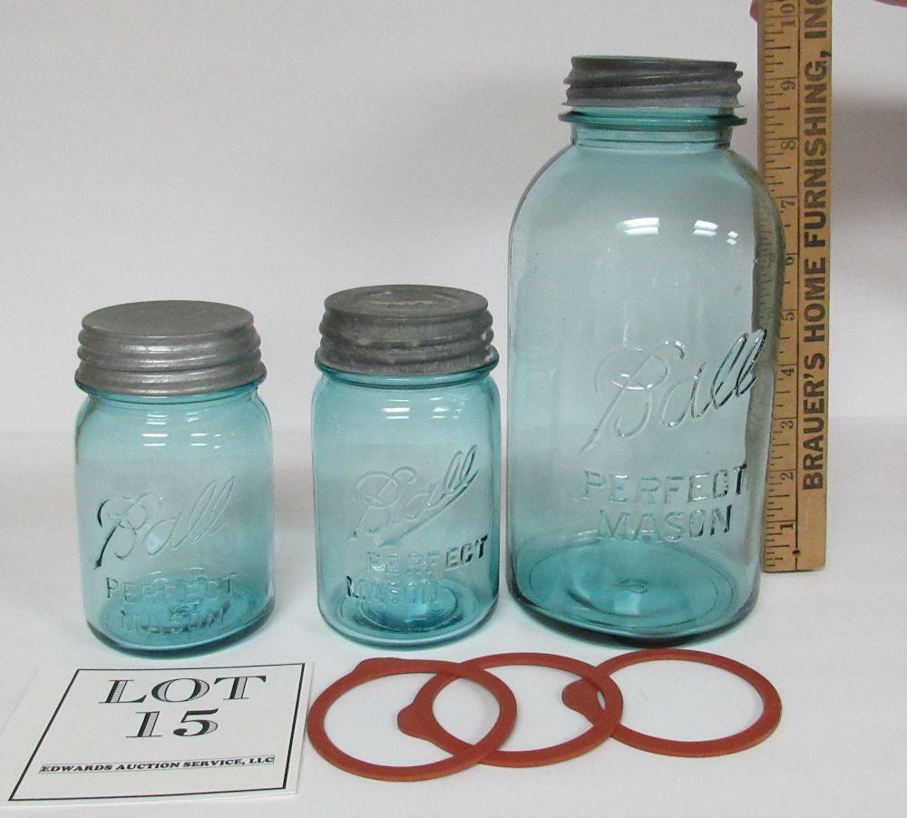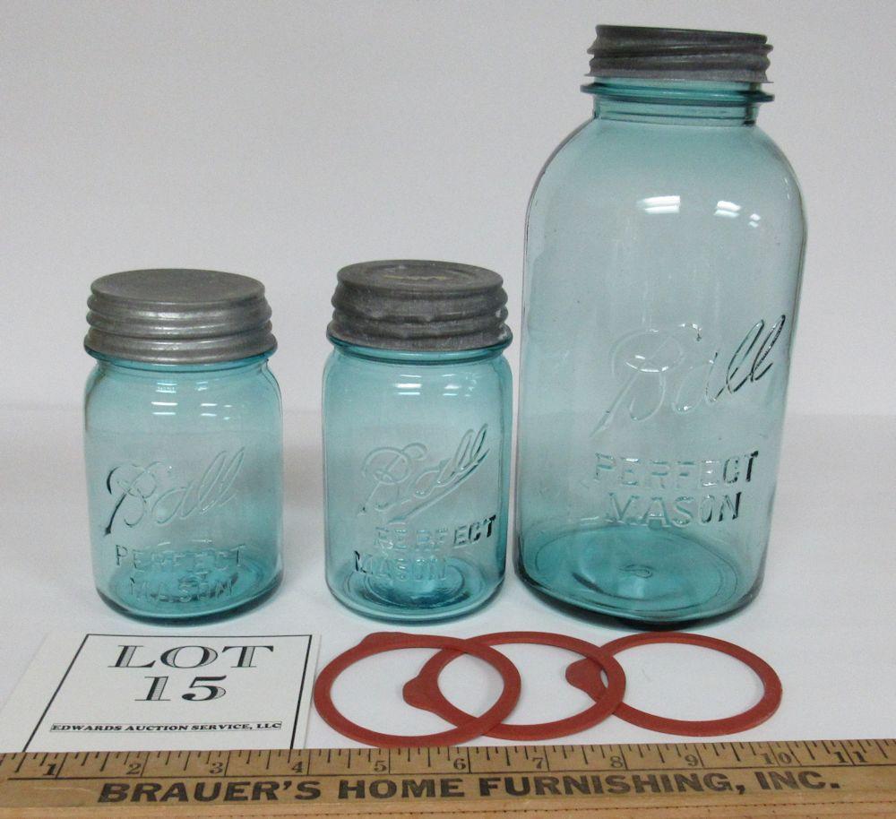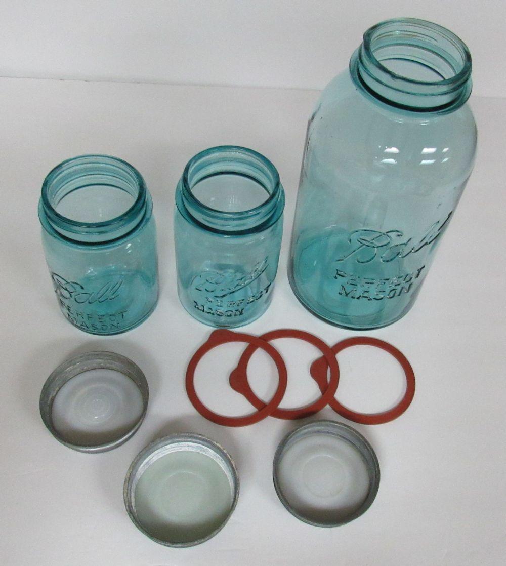 3 Vintage Teal Ball Mason Canning Jars, 2 Different Front Pints, 1 Half Gallon