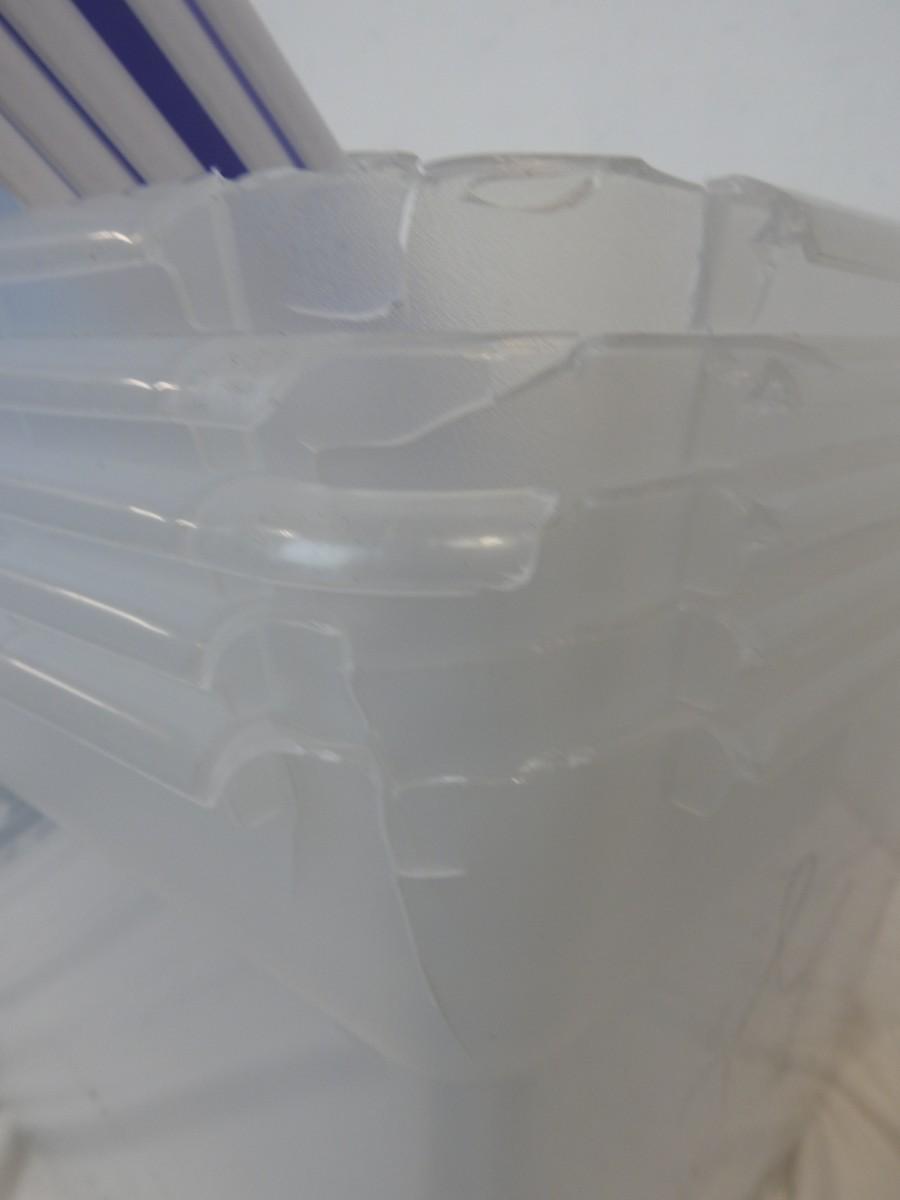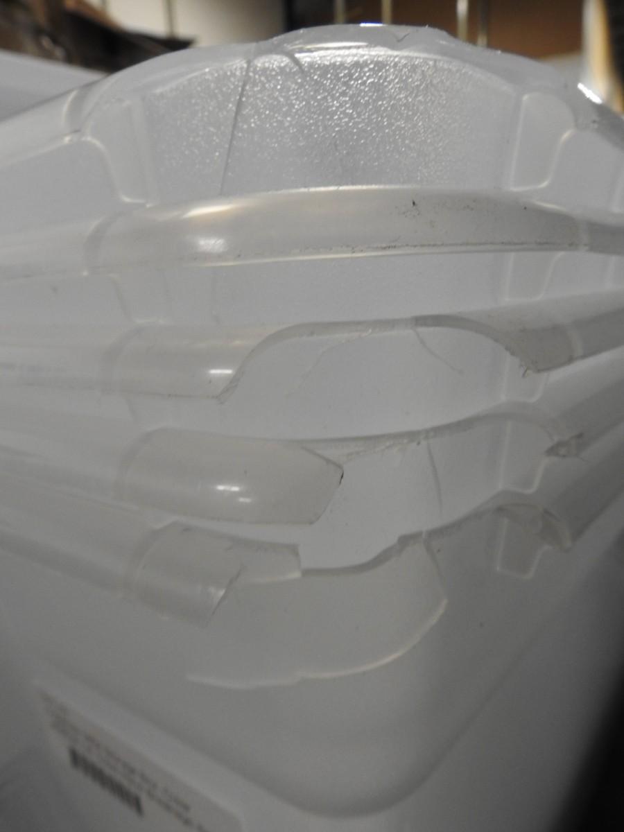 5 Sterilite 58Qt Storage Boxes, Clear w/ White Lid, Totes Have Breakage - See Pictures