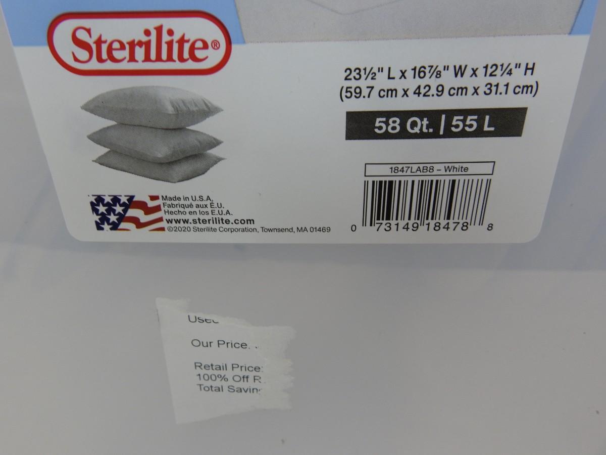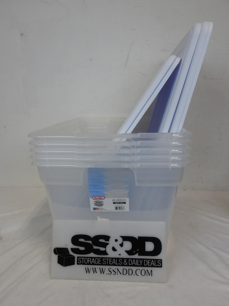5 Sterilite 58Qt Storage Boxes, Clear w/ White Lid, Totes Have Breakage