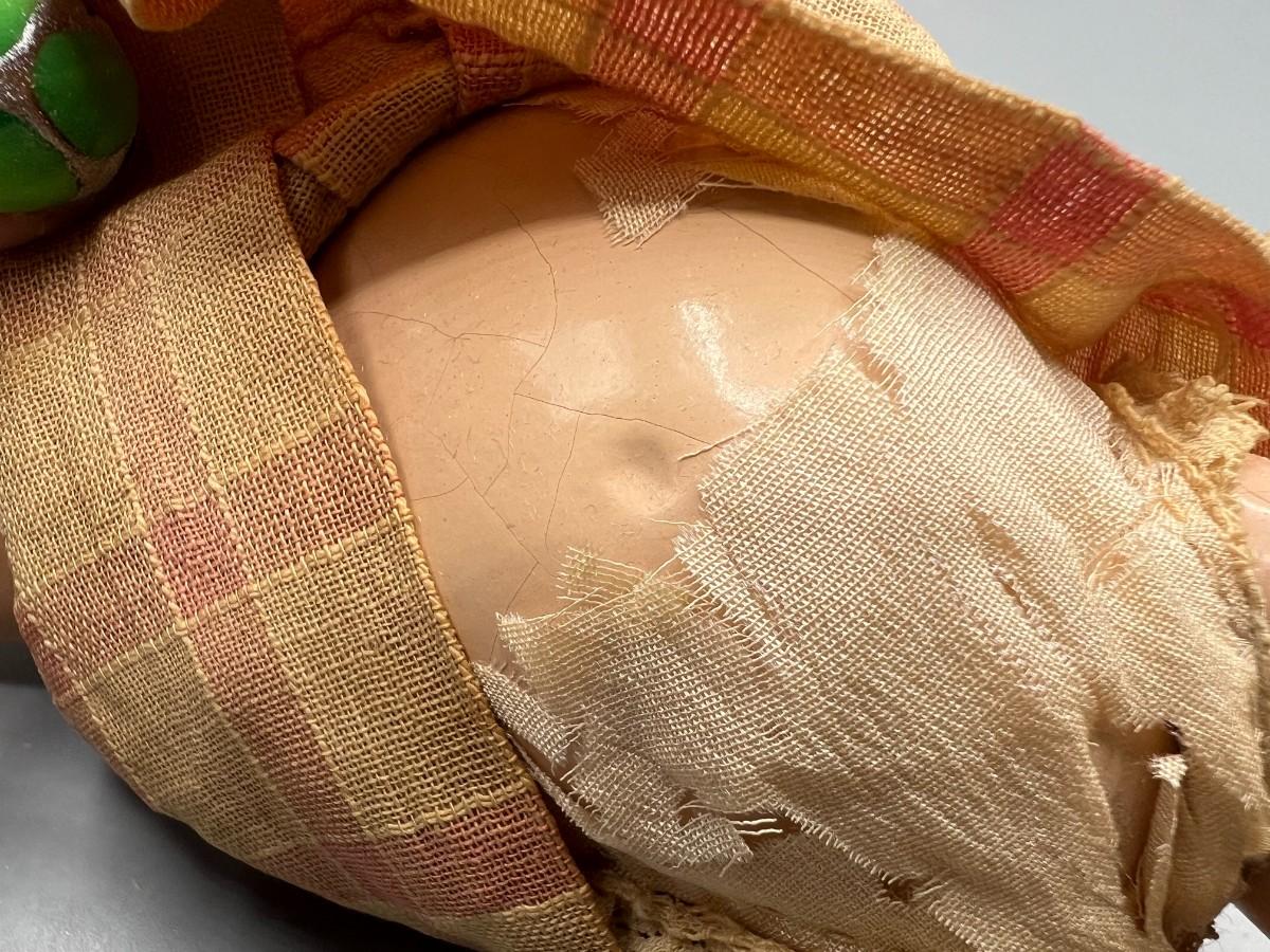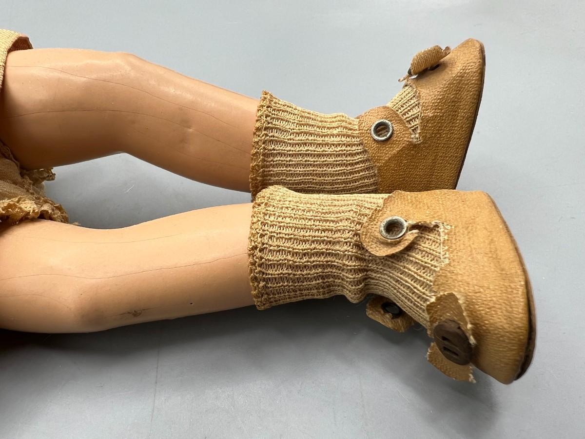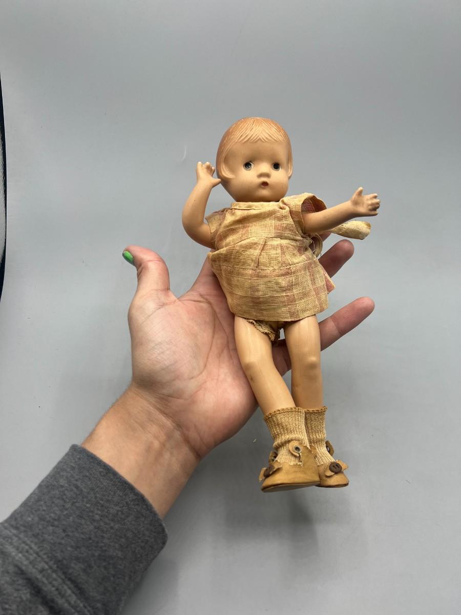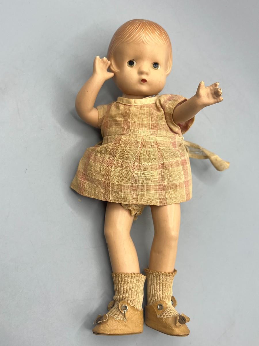There is noticeable wear to the doll, but there is no significant damage and is in good collectible condition.