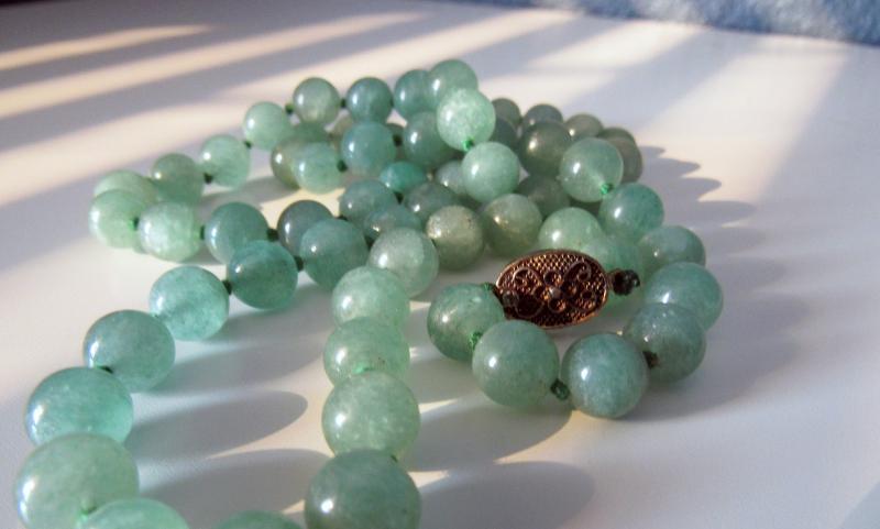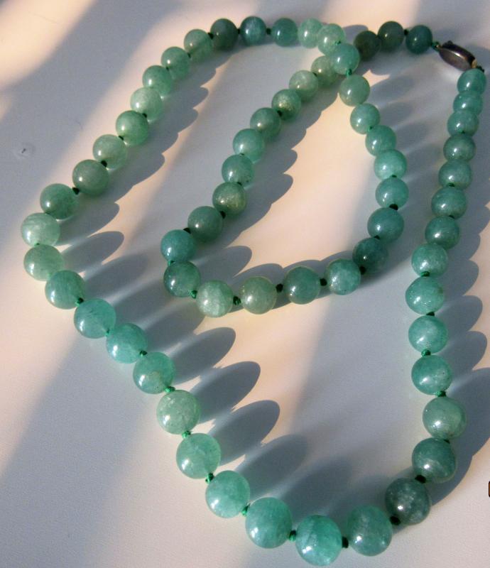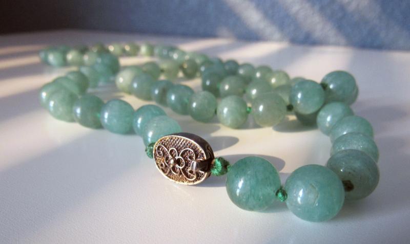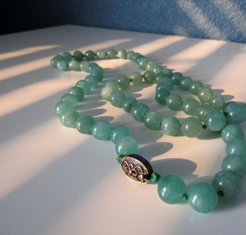 Beaded necklace made of Adventurine, with a sliver clasp. Gorgeous green color. 28 inches long.