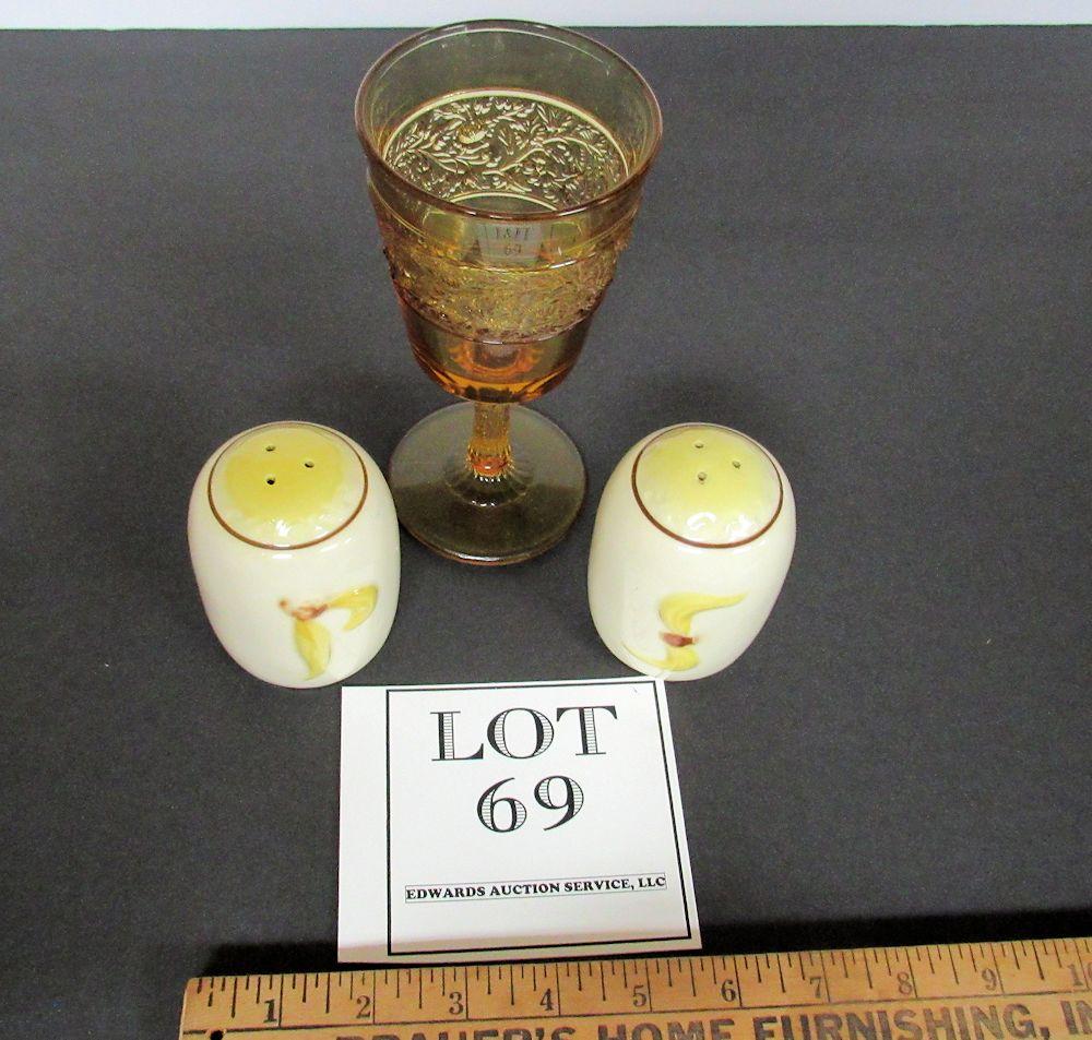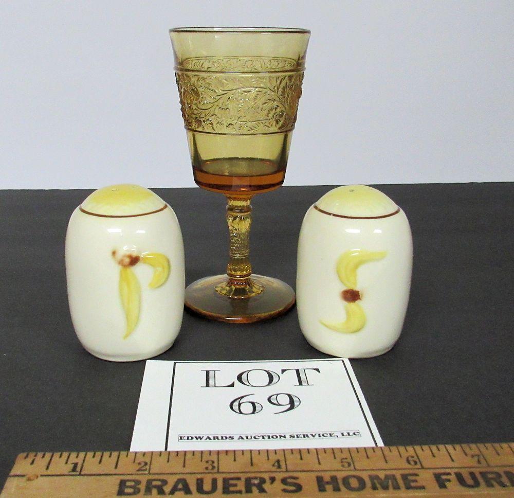 Amber Pressed Glass Goblet, Pair Pottery Shakers, Unmarked