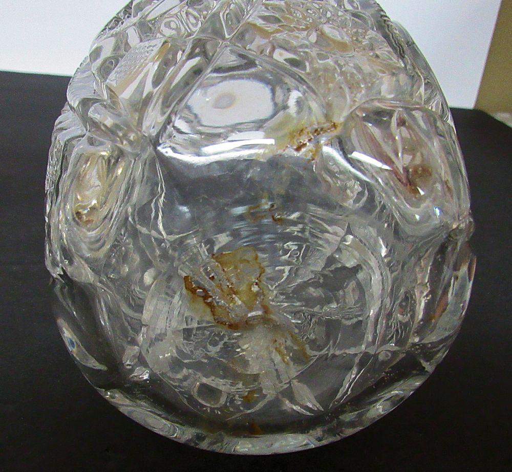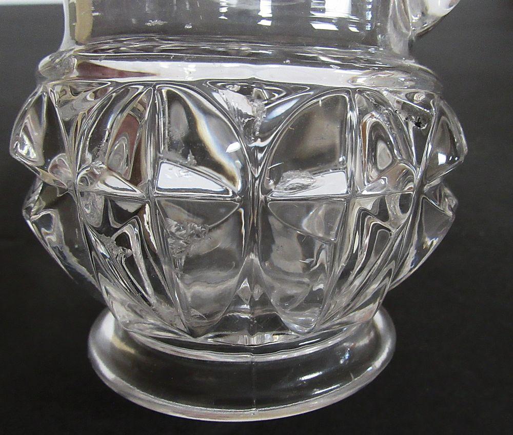 The pitcher has some chips on the points as seen in magnified photos. The decanter seems fine except for some old booze stains as seen in photos.
