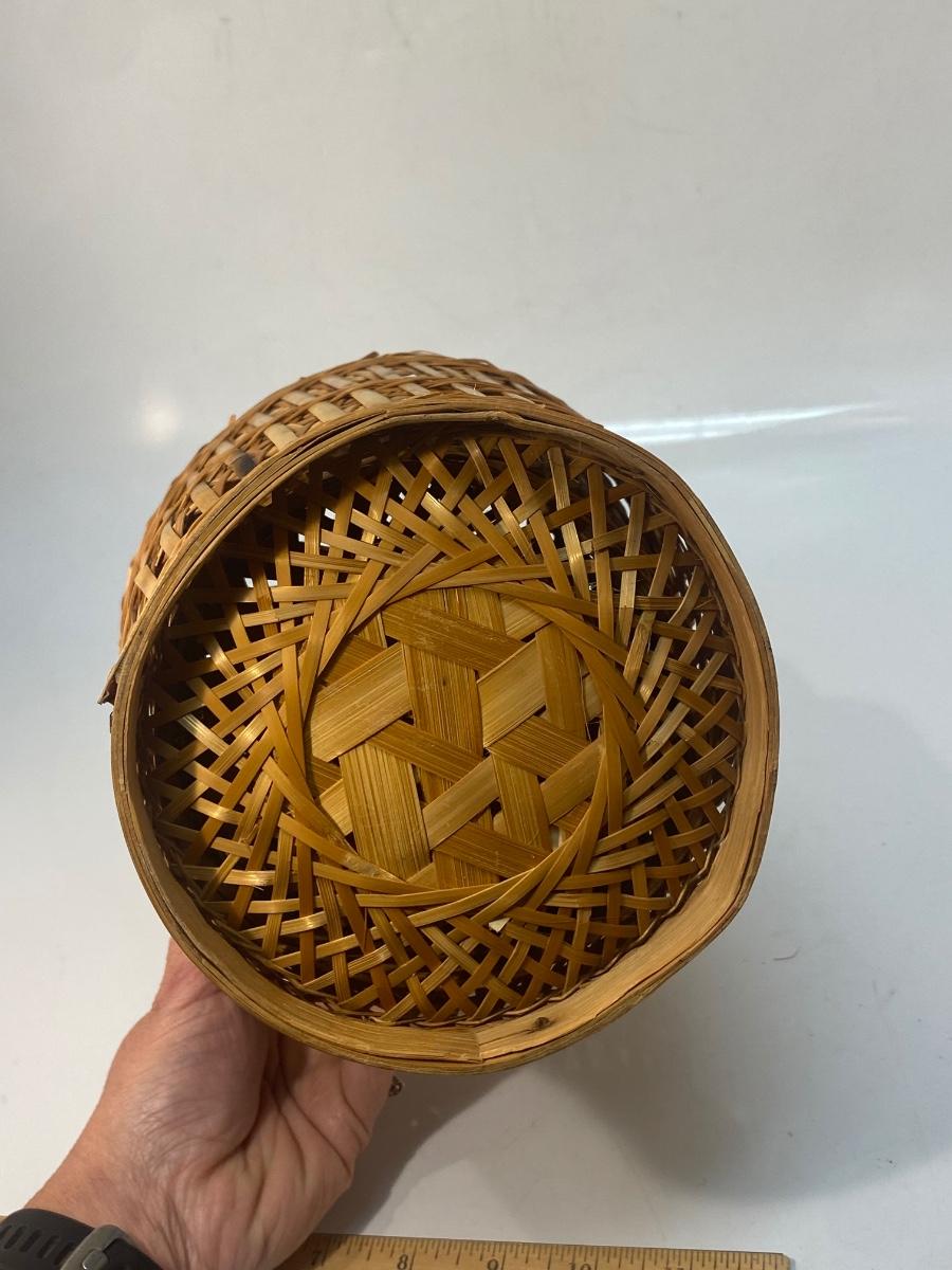 Set of Woven Rattan Reed Matching Baskets Slight Size Variation. In good condition. Matching weave patterns but slight size differences.