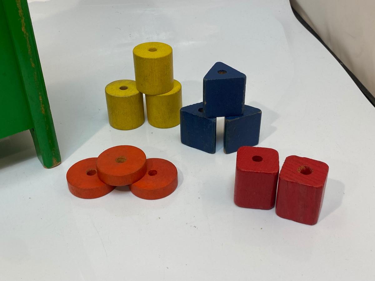 Vintage Wood Playskool Postal Station Wood Block Shape Sorter Mailbox. In good vintage condition. Light wear from use. Comes with a total of 11 blocks, 4 different shapes. About 11" tall.