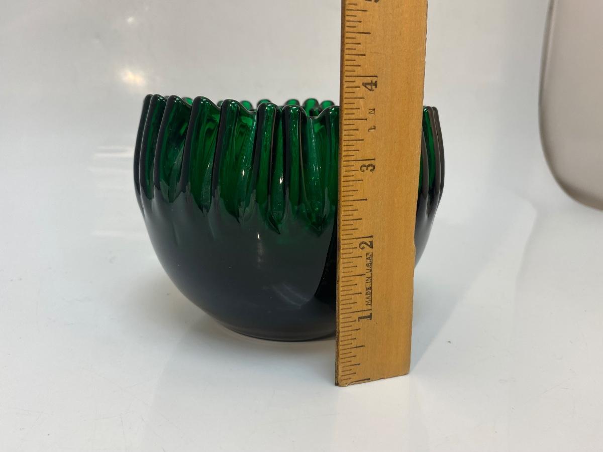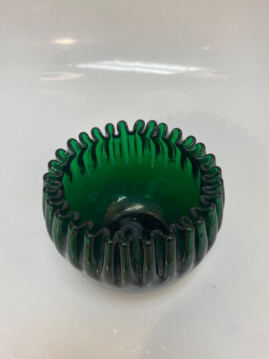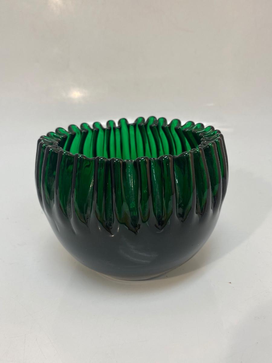 MCM Midcentury Blenko Emerald Dark Green Crimped Edge Ribbed Art Glass Rose Bowl Dish