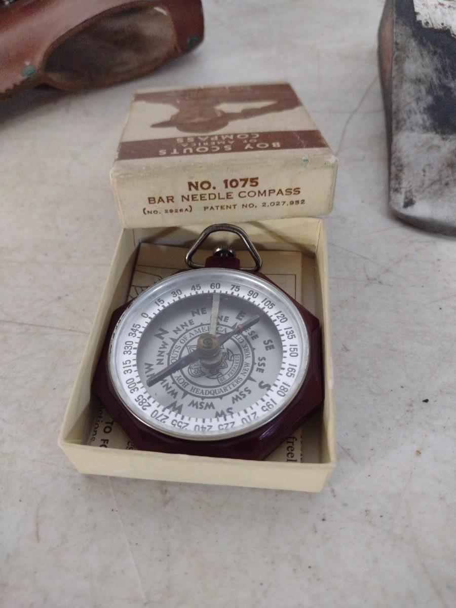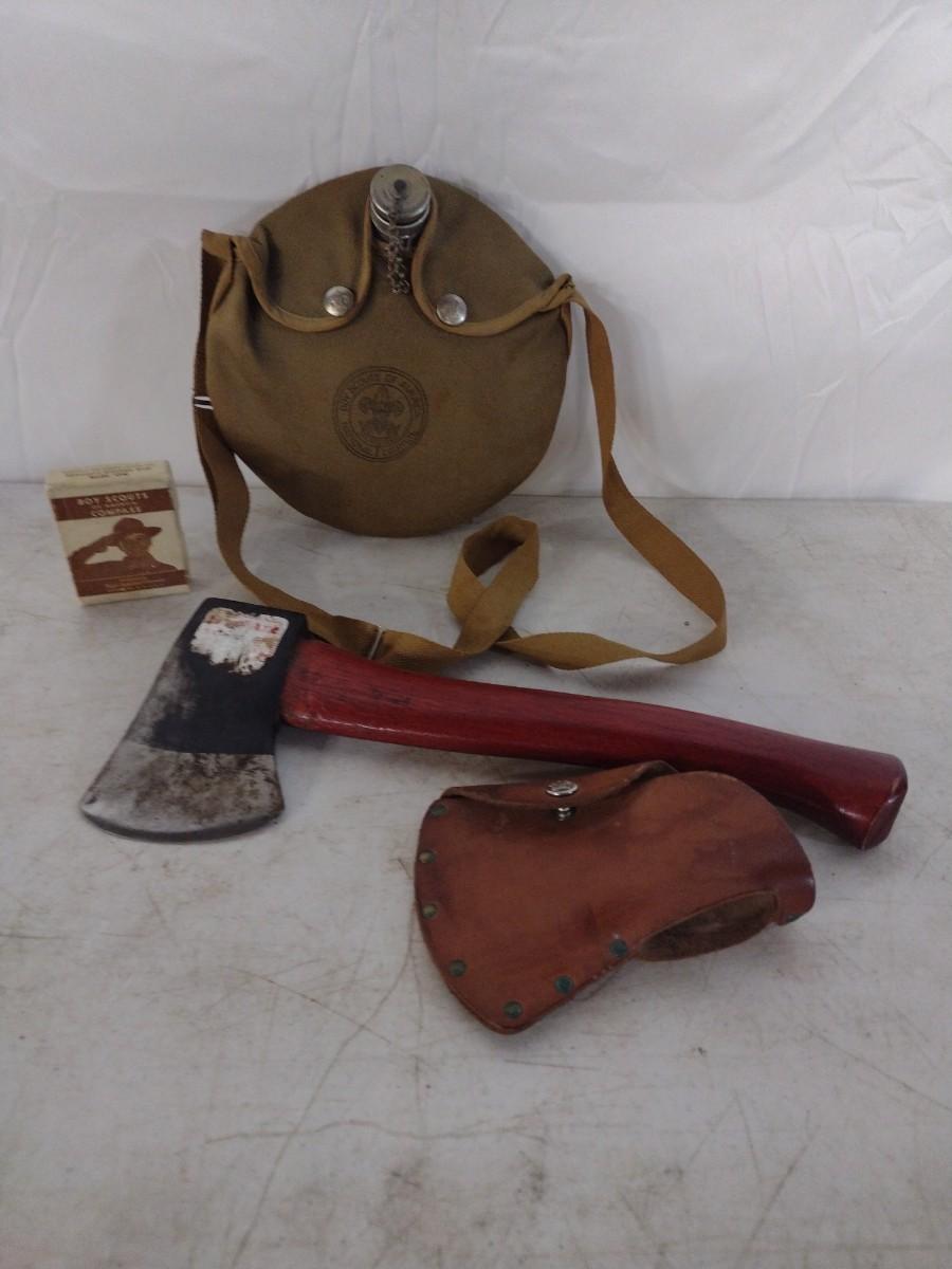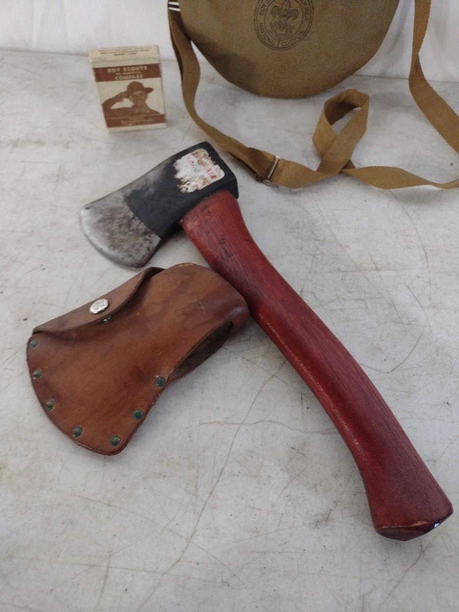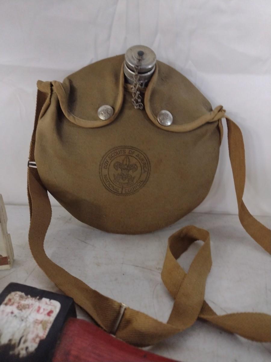 Vintage Boy Scout Tool Collection includes Canteen, Hatchet, and Compass