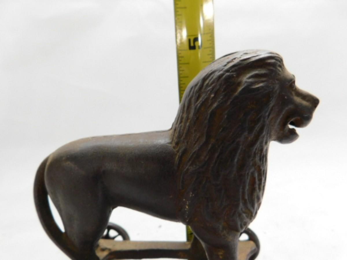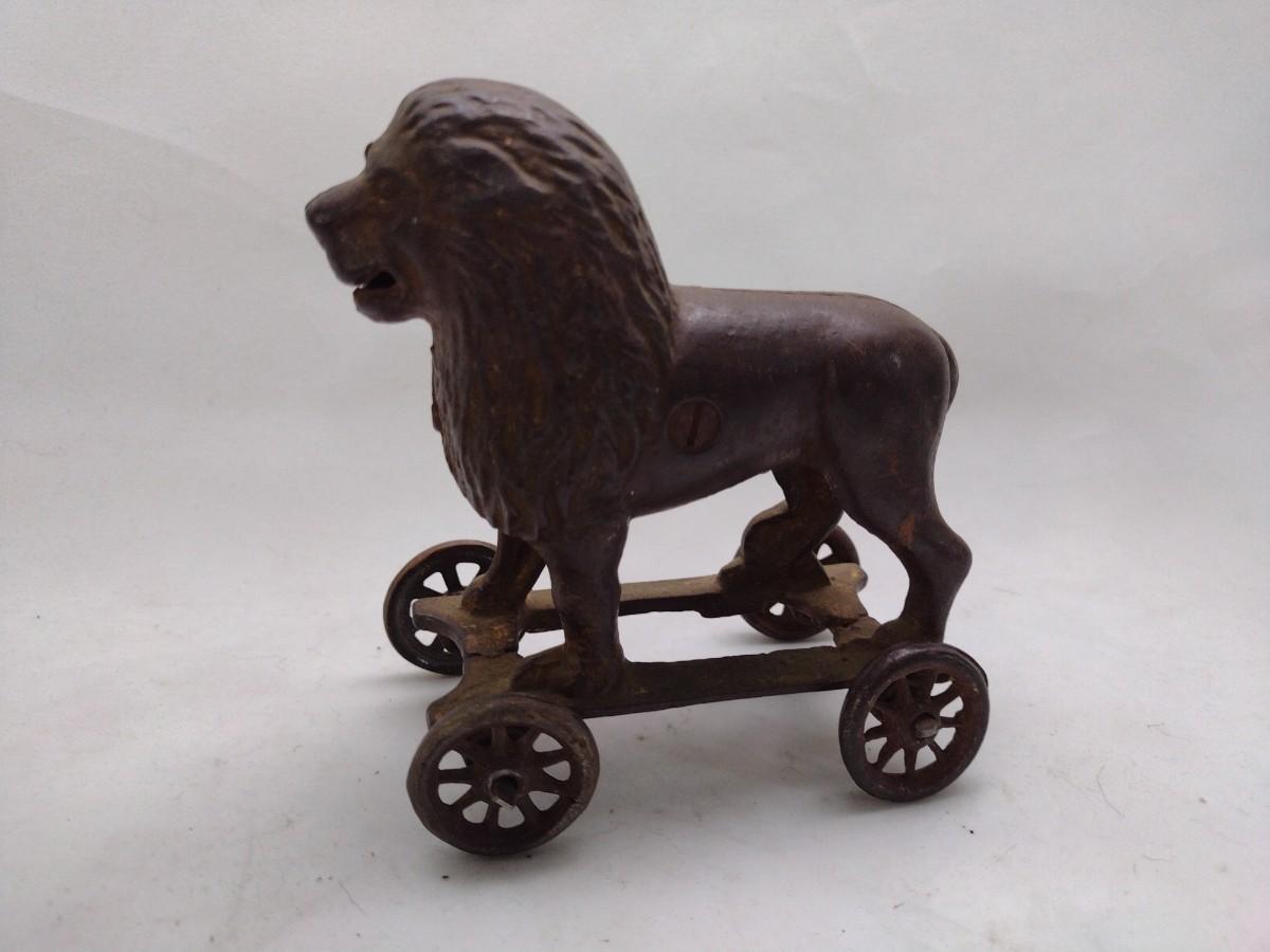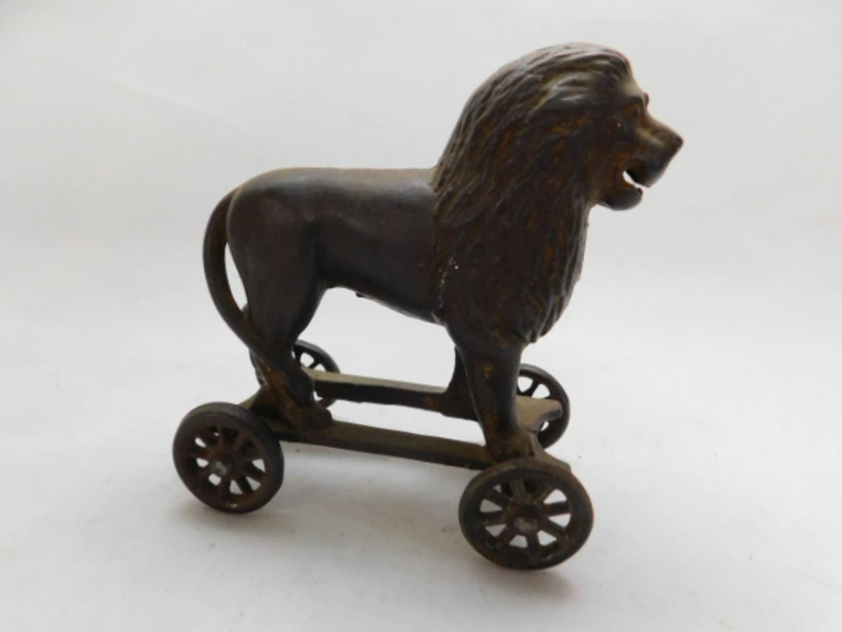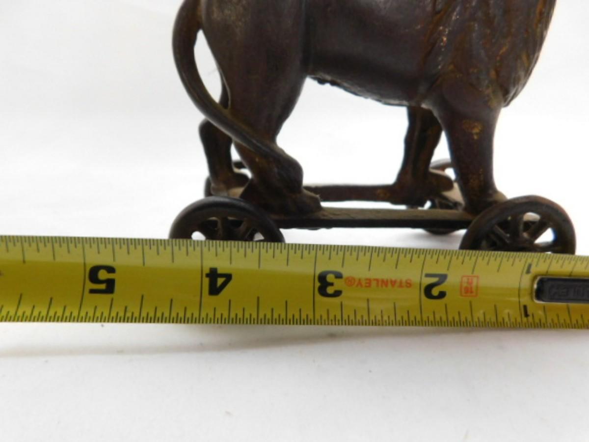 Vintage Cast Iron Lion Pull Wagon Coin Bank