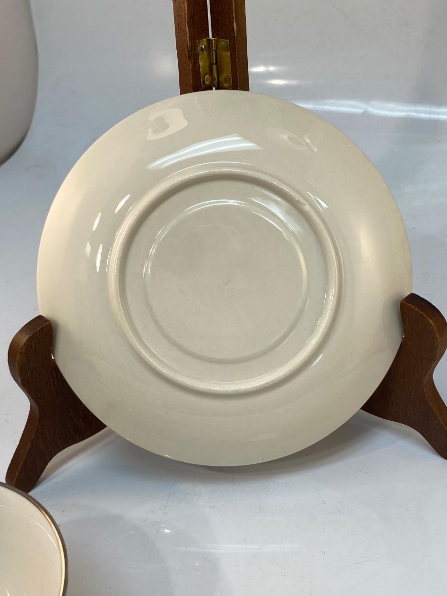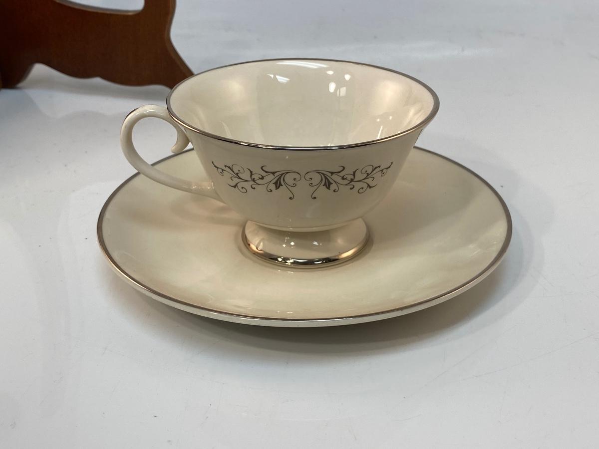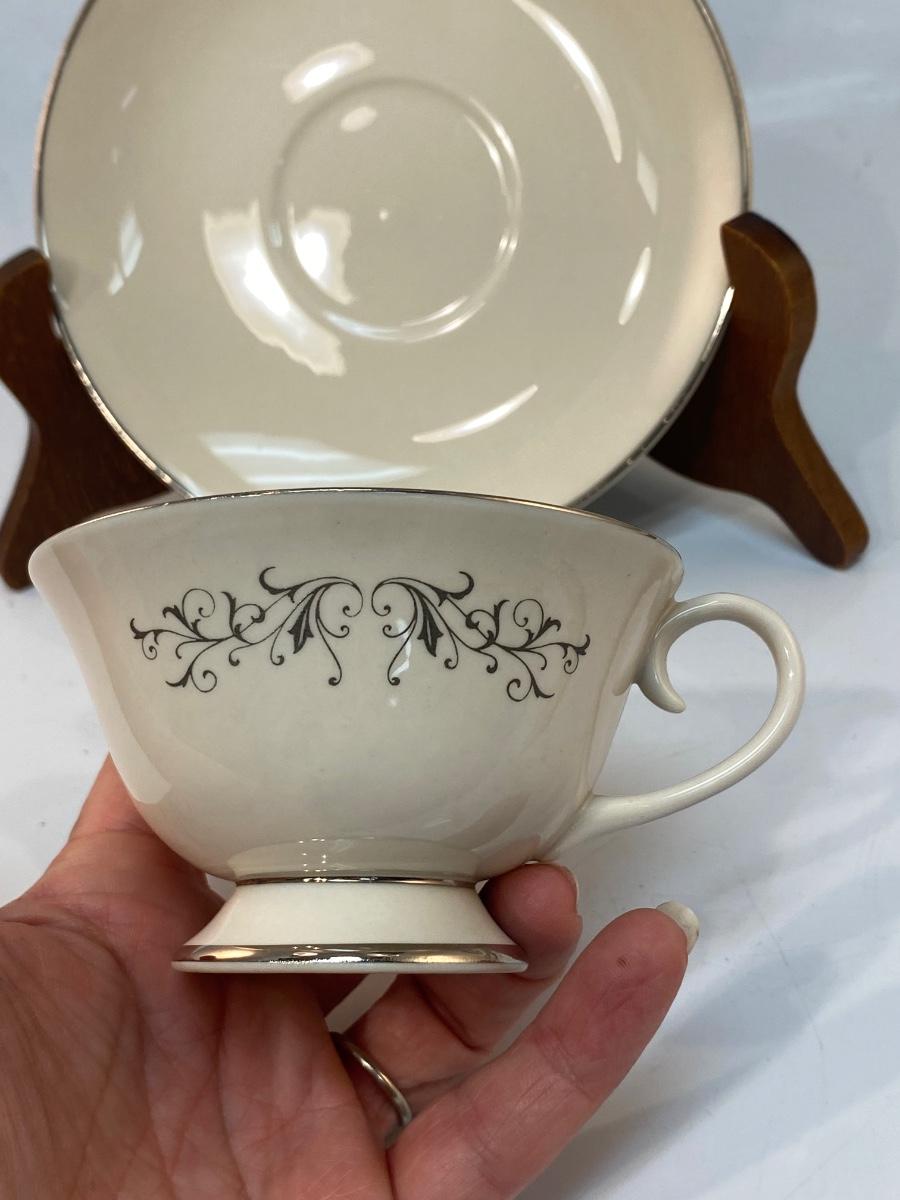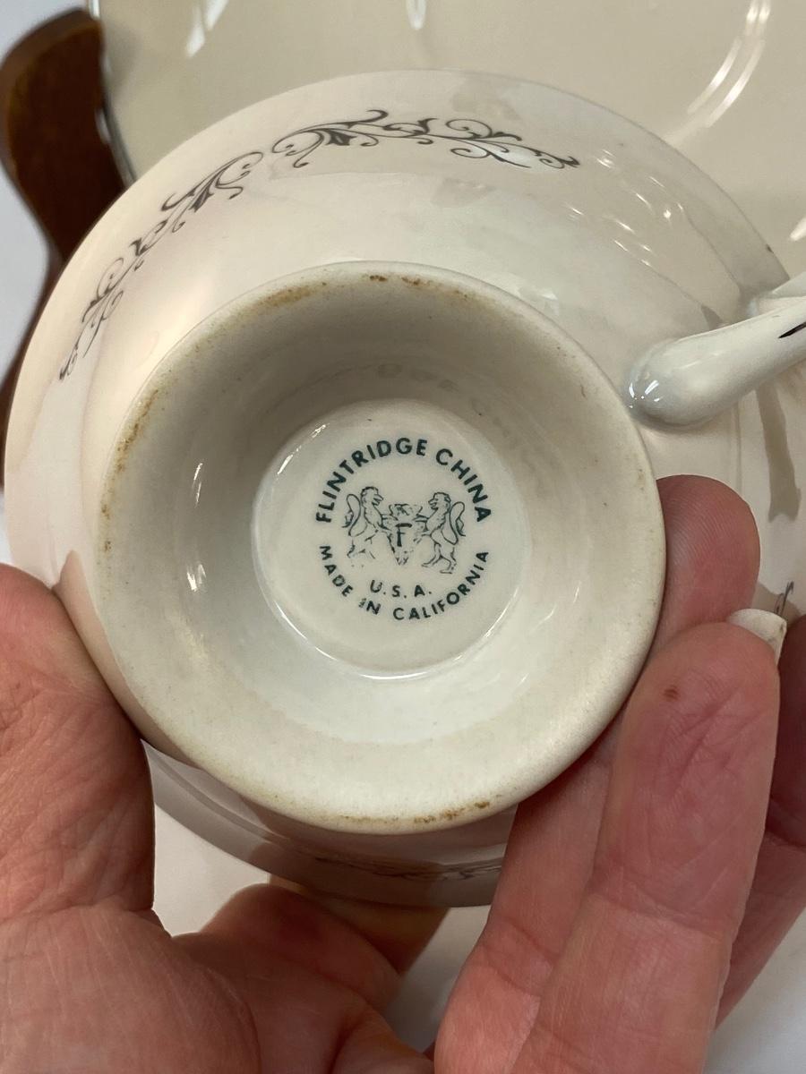 Flintridge China Teacup and Saucer Cream Ivory Black Pattern Silver Rim