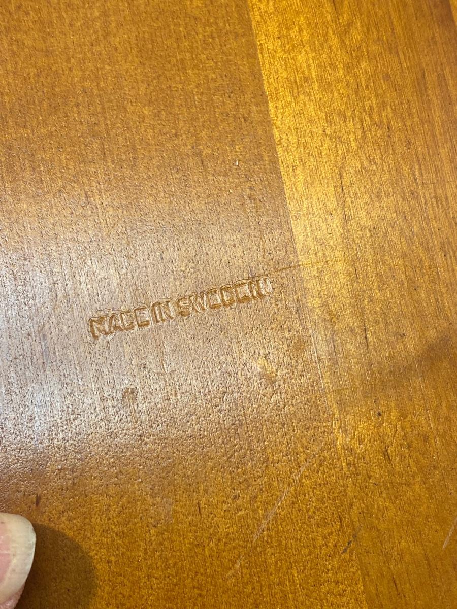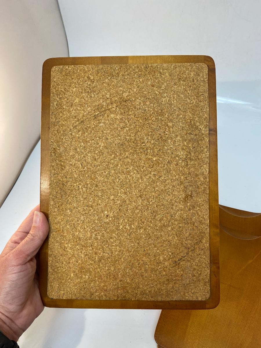 Set of Three Made in Sweden Wood Teak Cutting Serving Boards with Cork Bottoms. In good condition. Different sizes, 11"x8" and smaller.