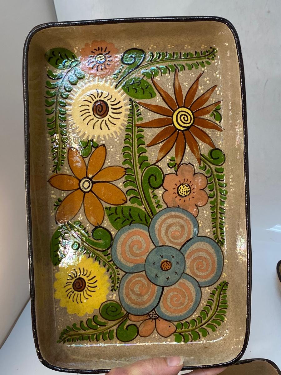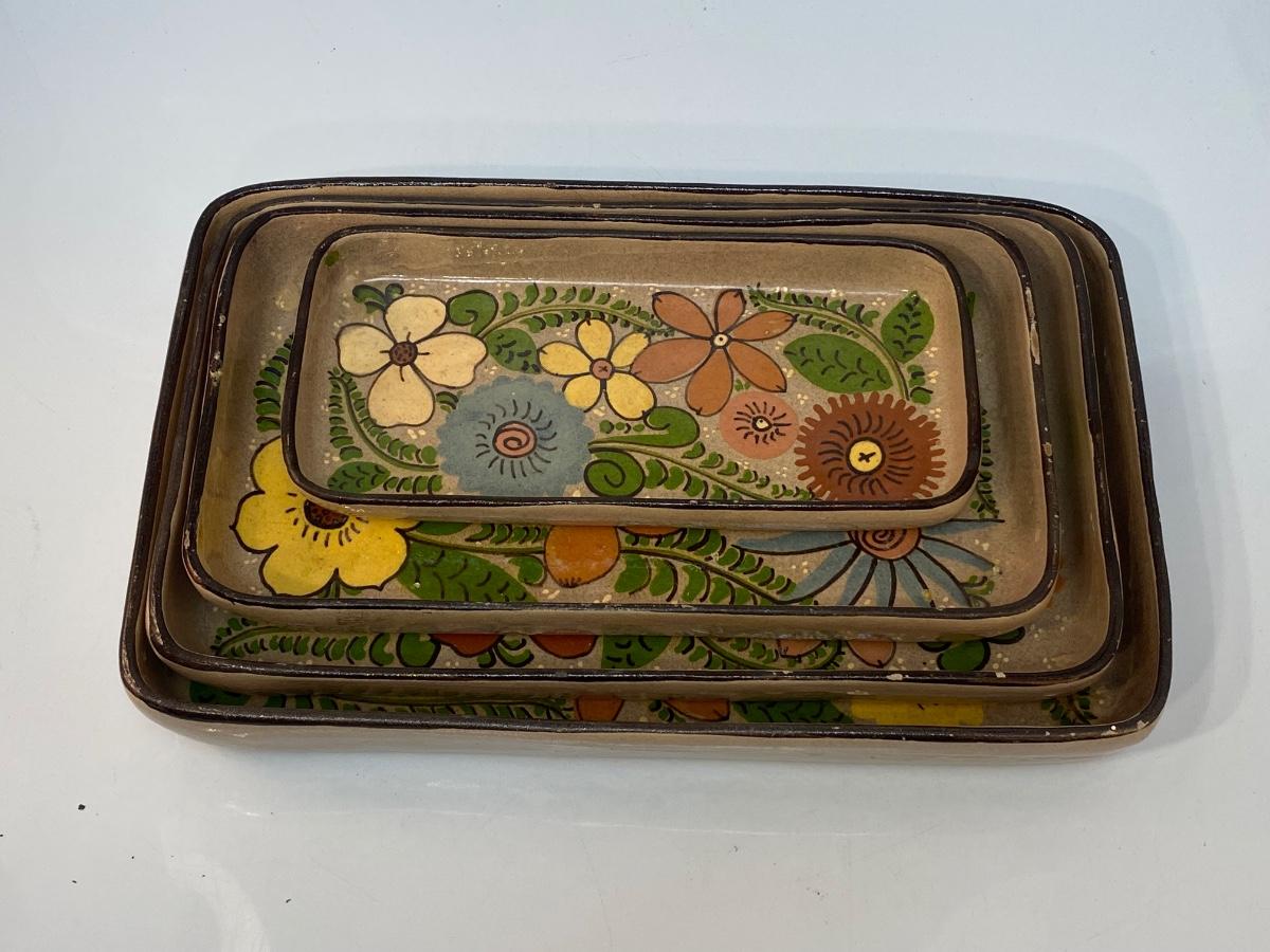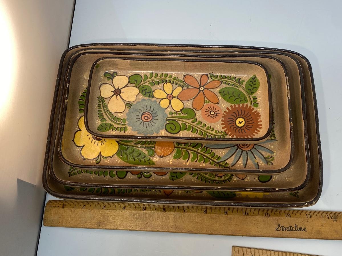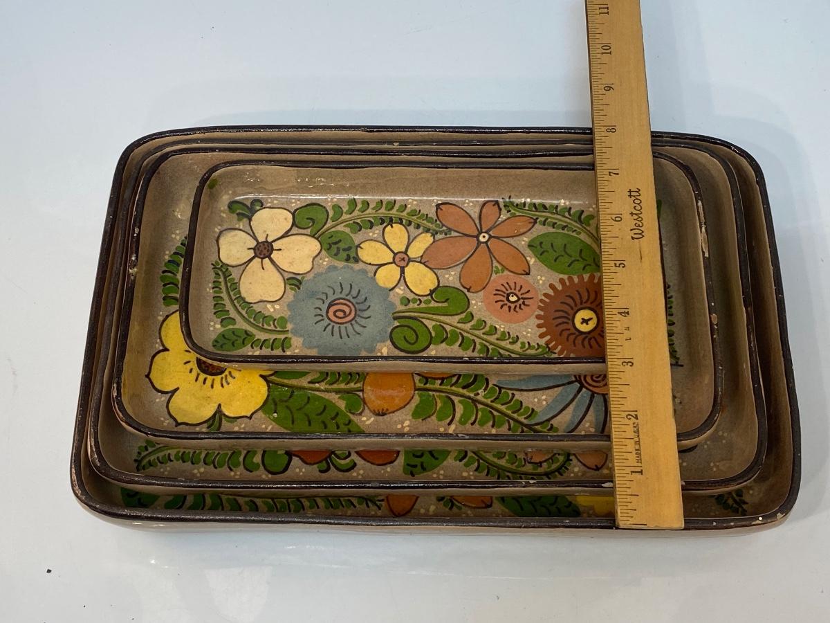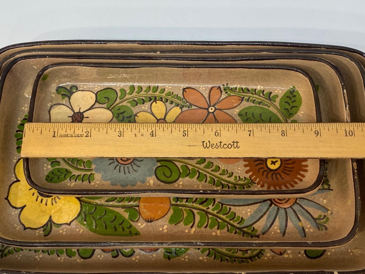 Set of 4 Hand Made Colorful Flower Painted Clay Casserole Baking Dishes Mexico. Graduating in size. Flower patterns are similar just different color variations. Made in Mexico. Lightweight clay material. No major chips, some wear along edges and some fine crazing in places. The largest is about 13"x 8" and they get smaller from there.