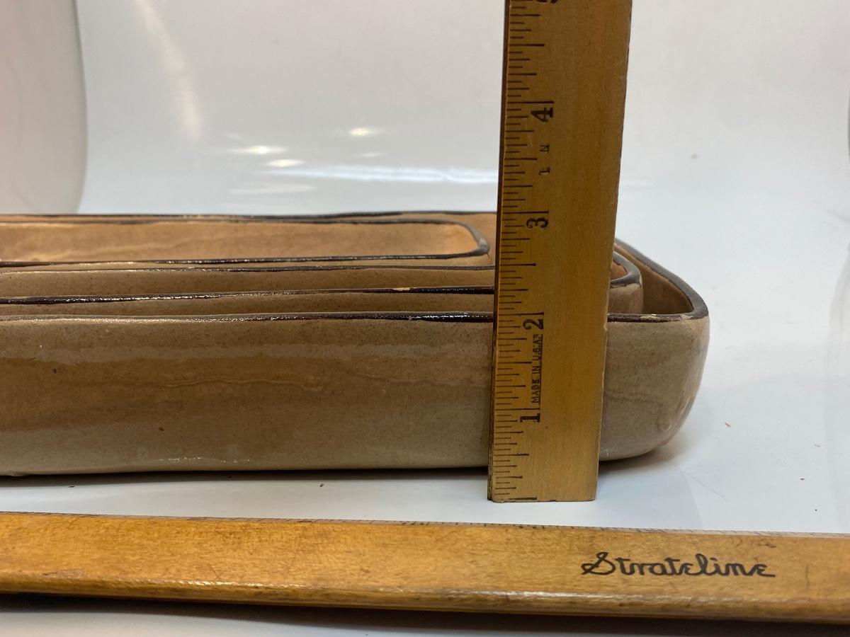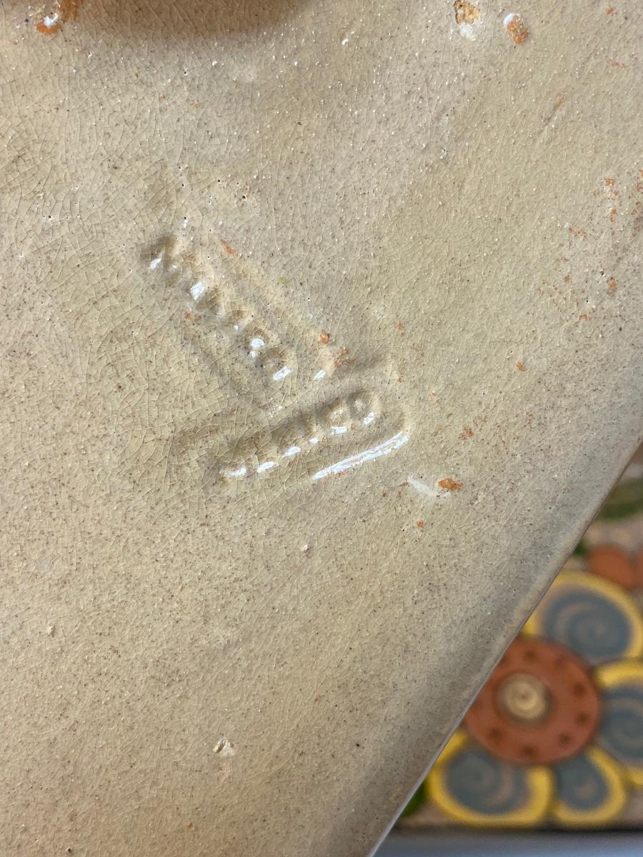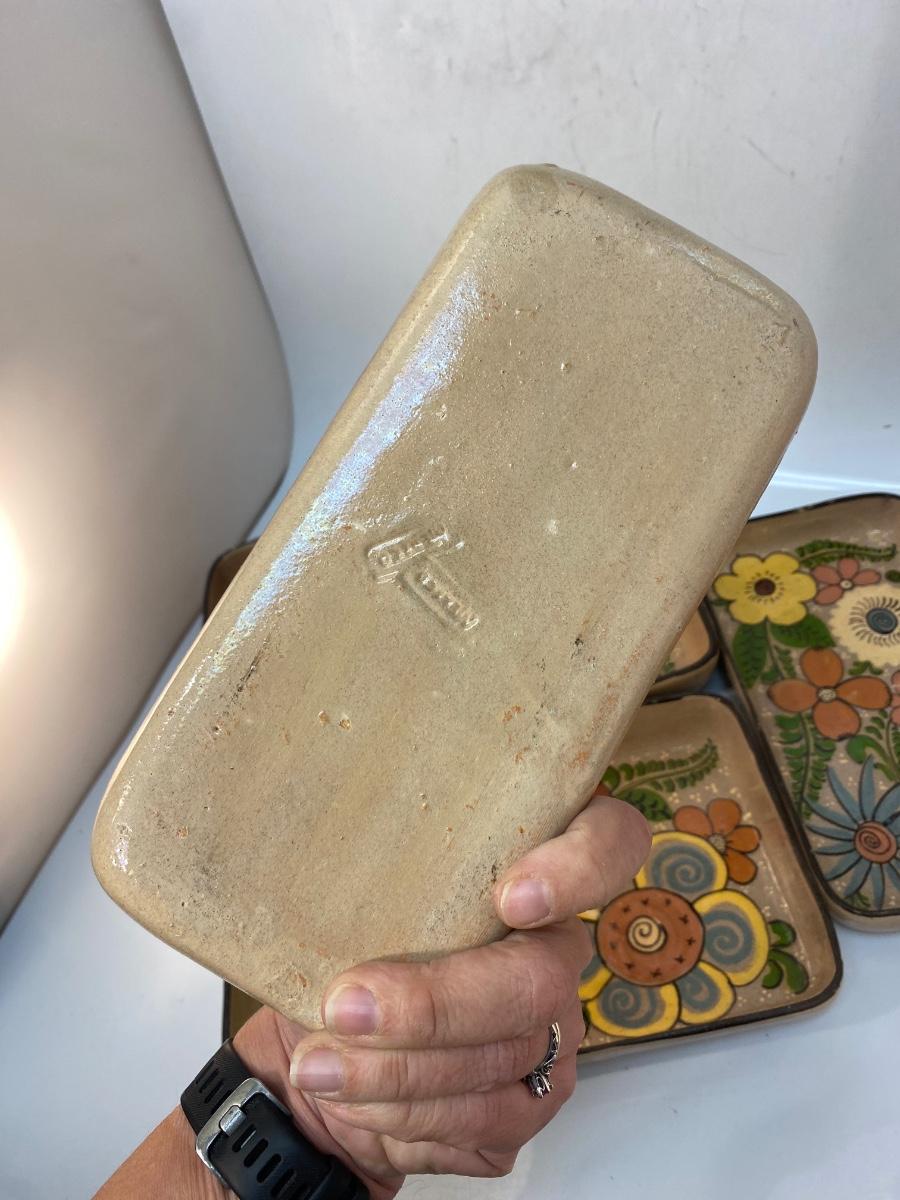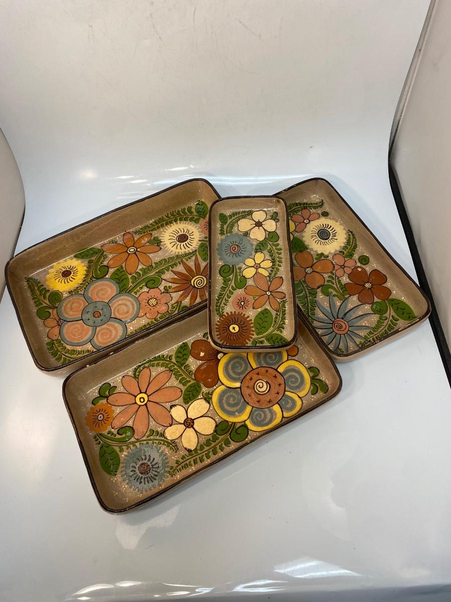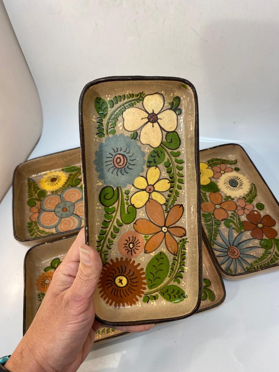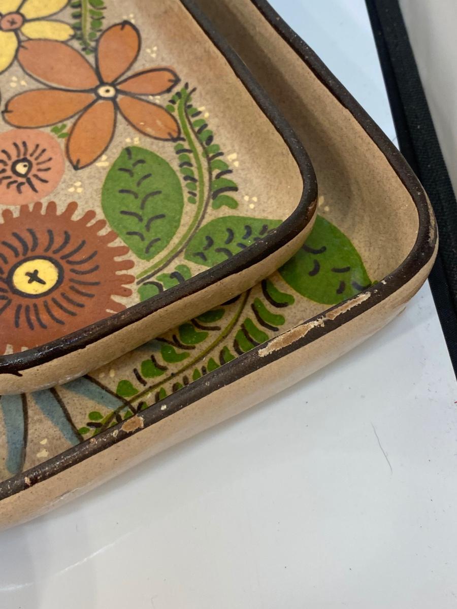 Set of 4 Hand Made Colorful Flower Painted Clay Casserole Baking Dishes Mexico. Graduating in size. Flower patterns are similar just different color variations. Made in Mexico. Lightweight clay material. No major chips, some wear along edges and some fine crazing in places. The largest is about 13"x 8" and they get smaller from there.