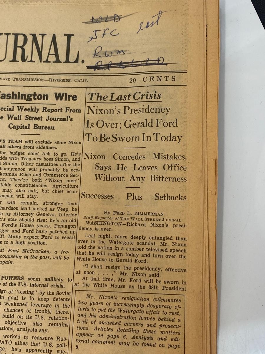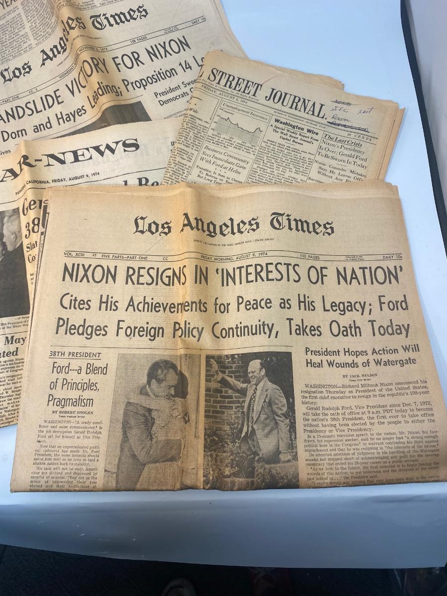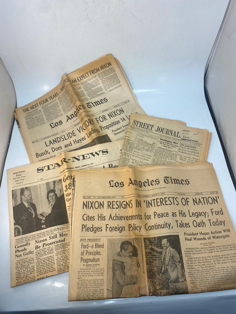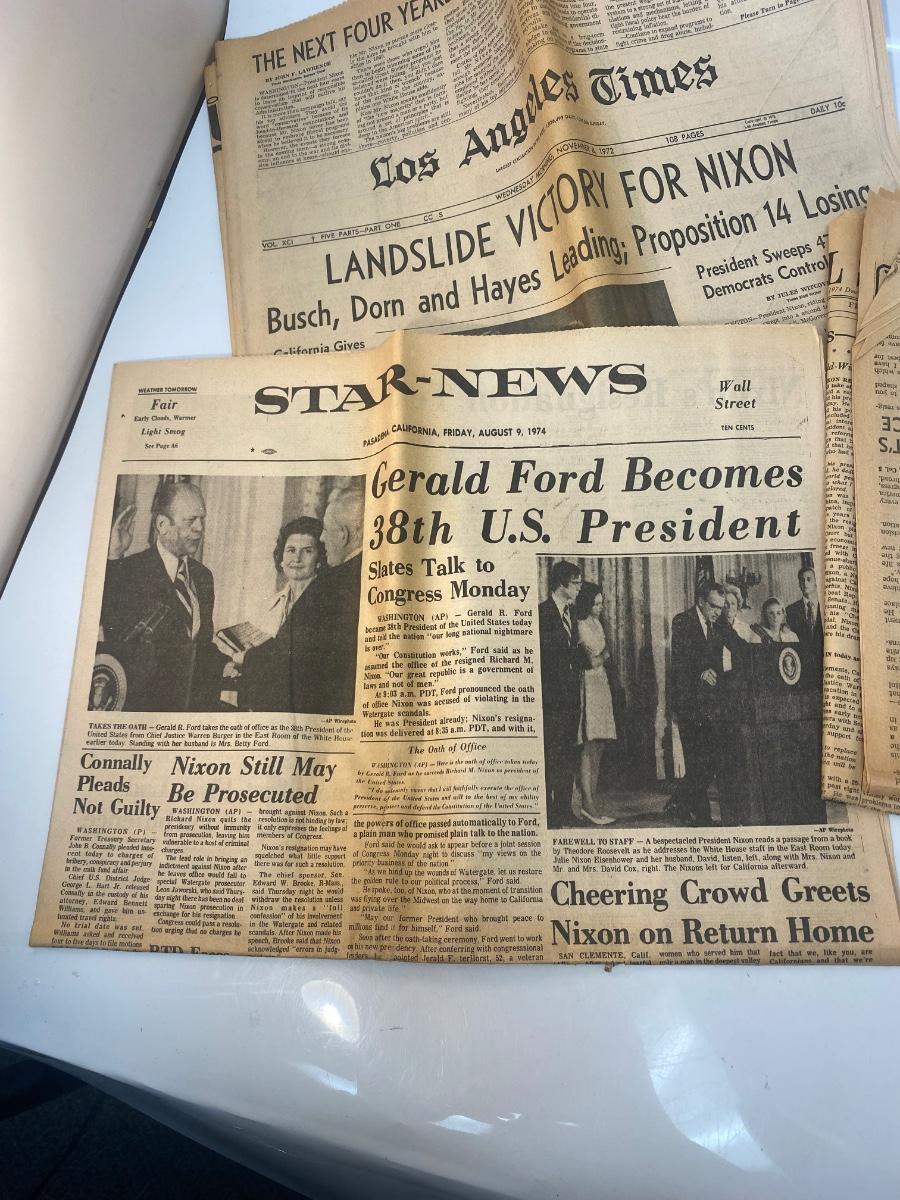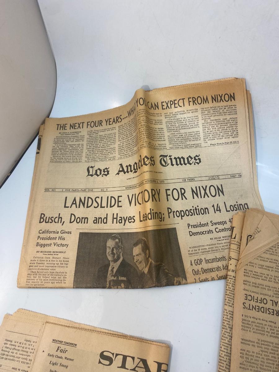 Vintage Newspaper Front Pages from the Rise and Fall of President Richard Nixon. One from when Nixon won presidency, and the rest when he resigned under scandal. From the Los Angeles Times, Wall Street Journal, and Star-News.