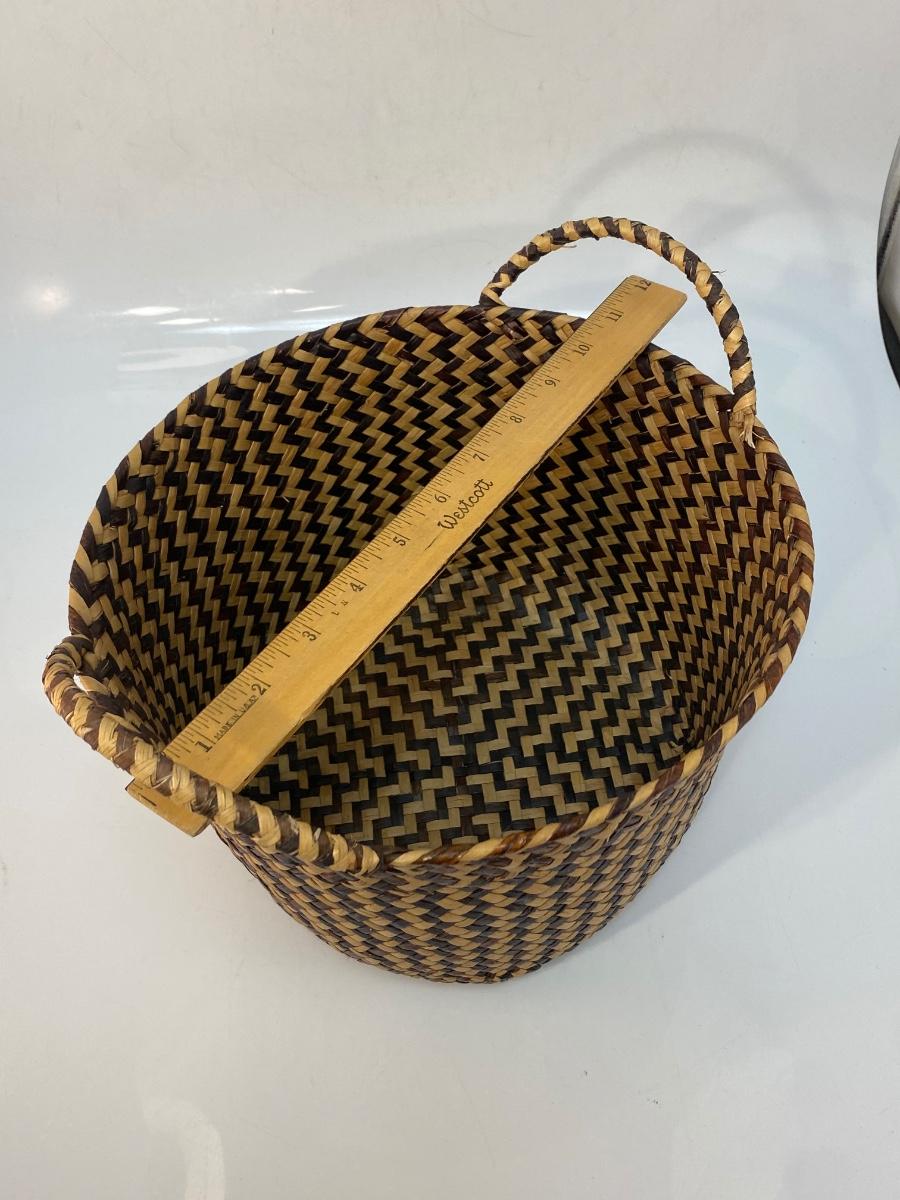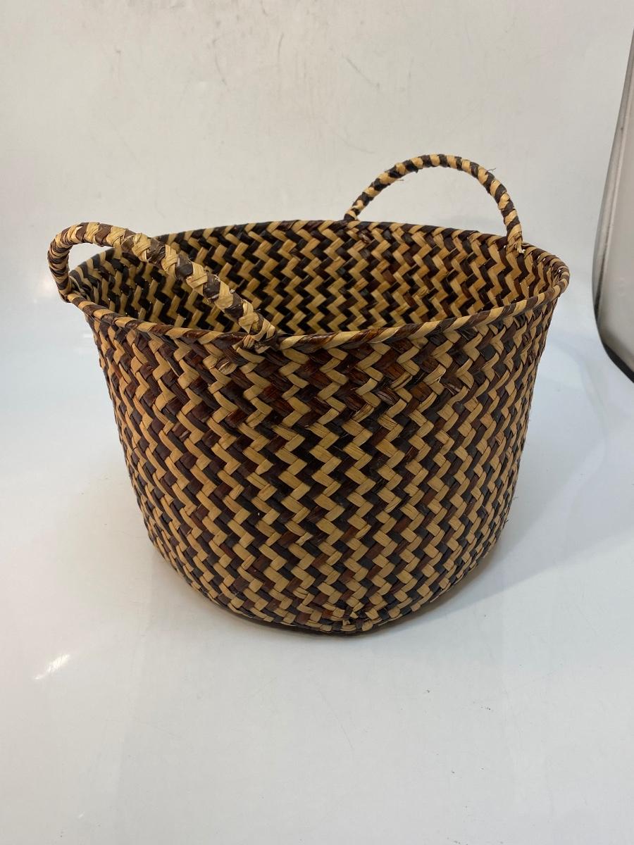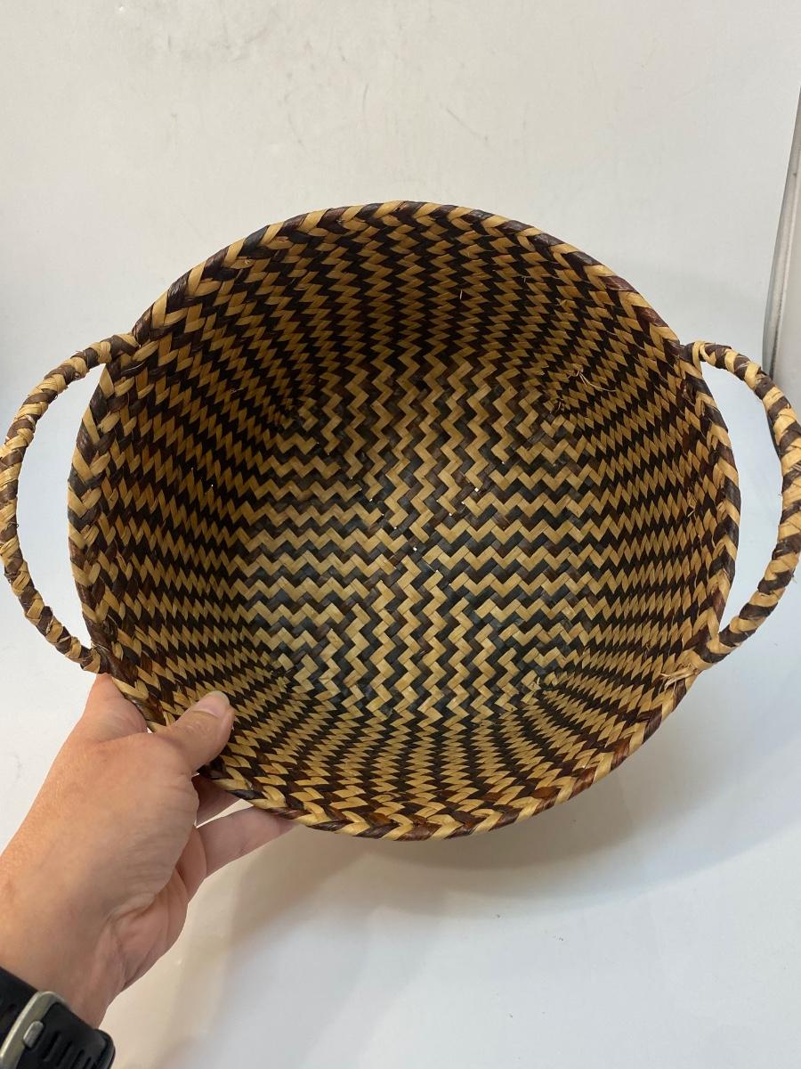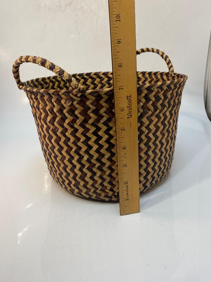 Double Handled Zig Zag Dark Brown Black & Natural Sea Grass Woven Basket. In good condition. Softer basket, not too stiff. Nice size, about 7" tall not including handles.