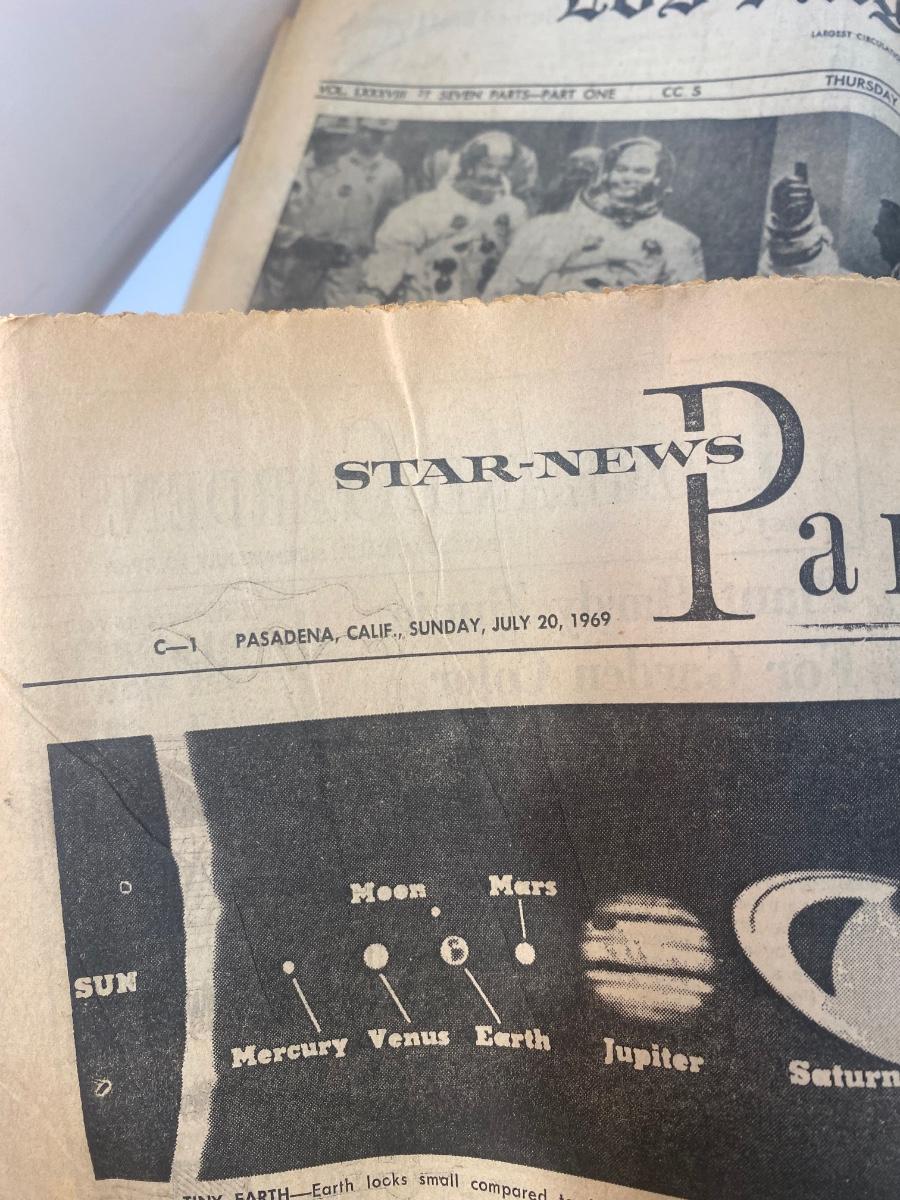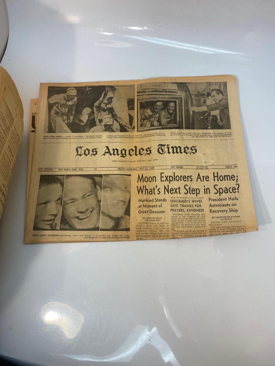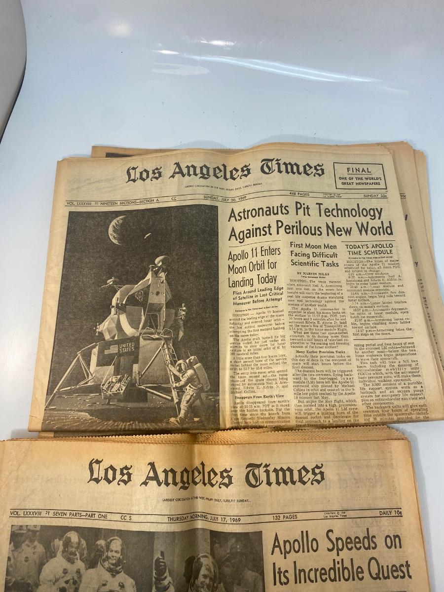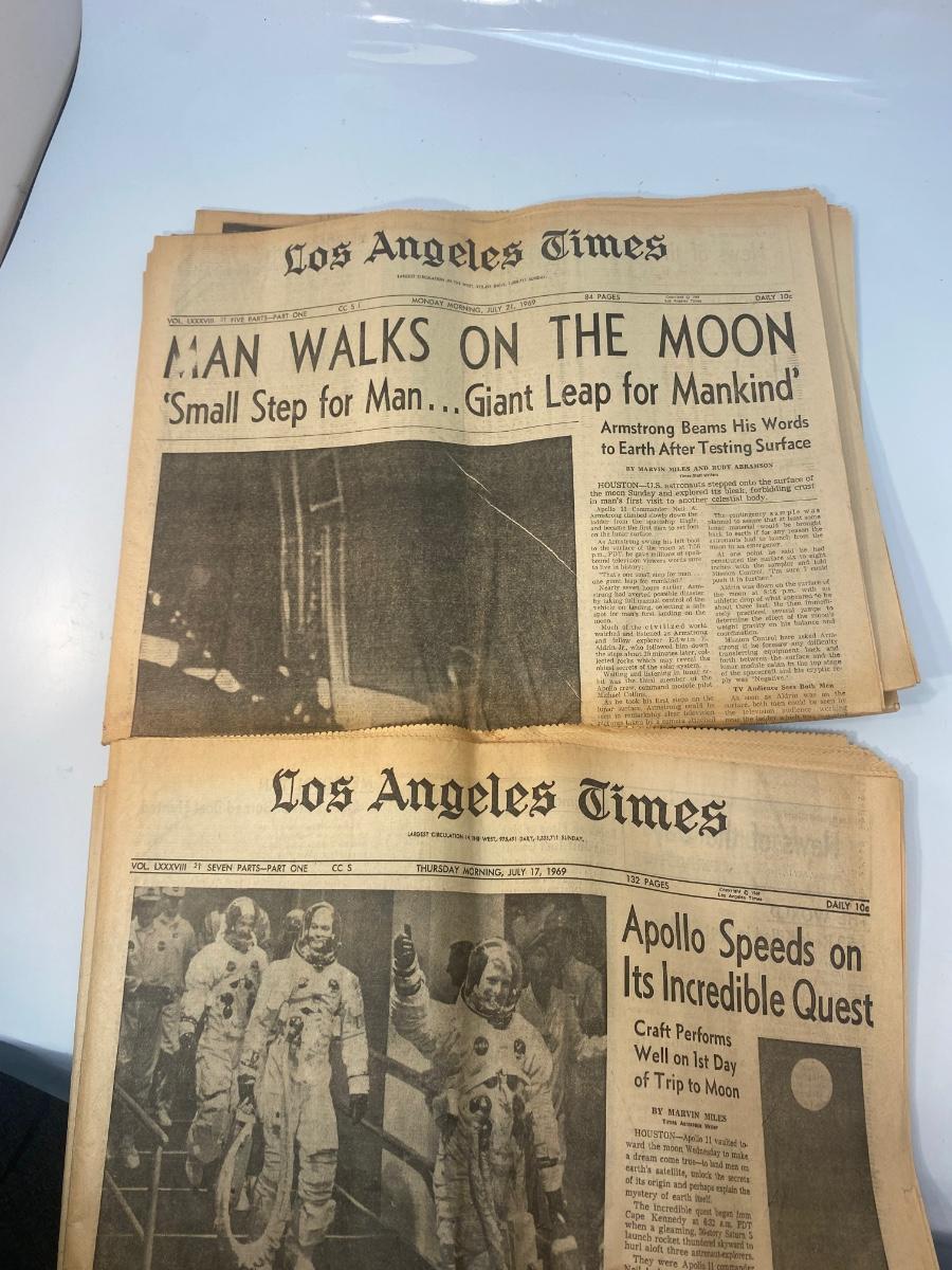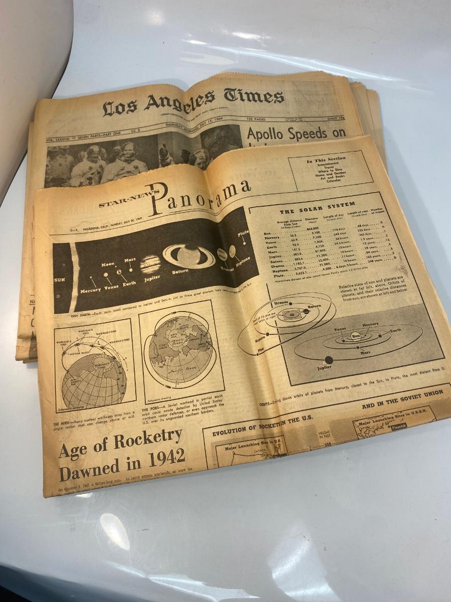 Mixed Lot of Newspaper Articles Front Pages from US Moon Landing July 1969. Articles regarding the astronauts and moon landing in July 1969. Articles from The Los Angeles Times, San Francisco Chronicle, and Star-News Panorama.