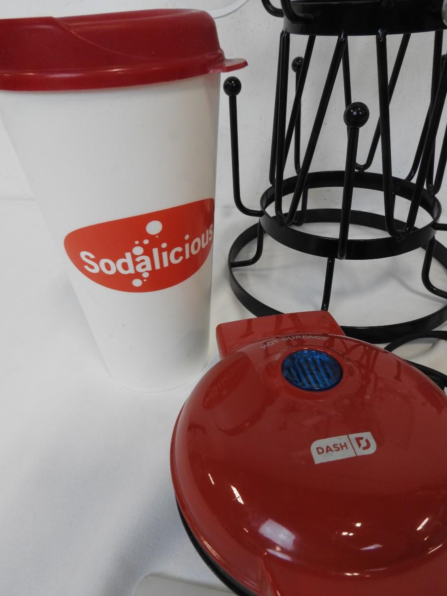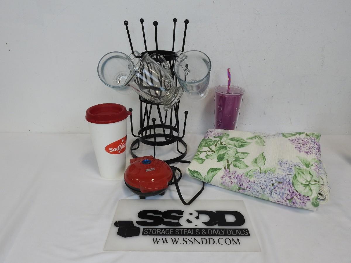 Kitchen Lot: Mug Holder Mugs, Tablecloth,Refillable Cups,Mini Waffle Maker-Works