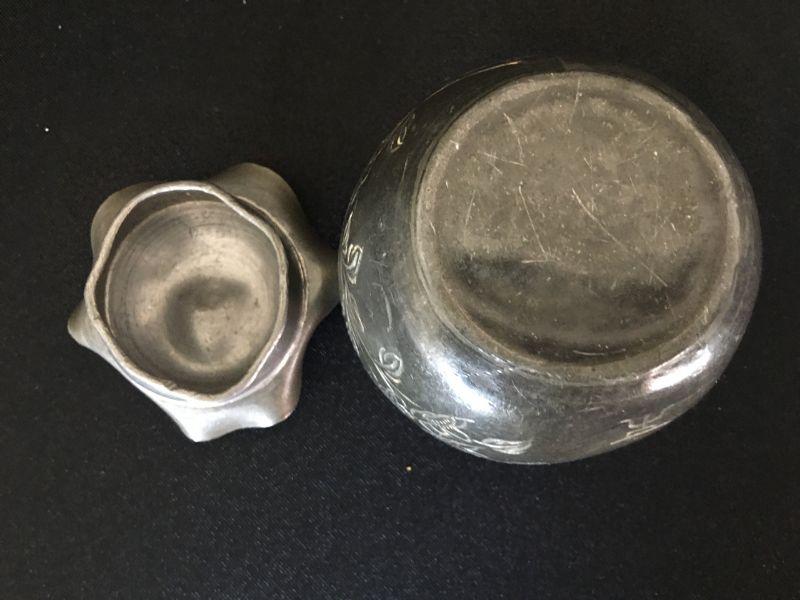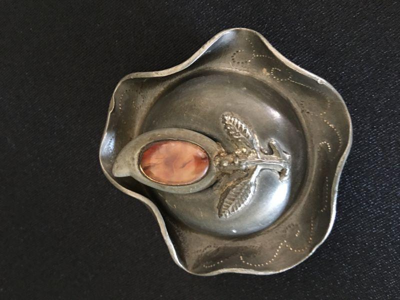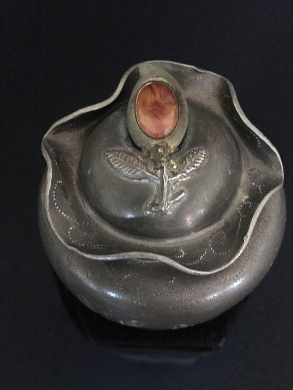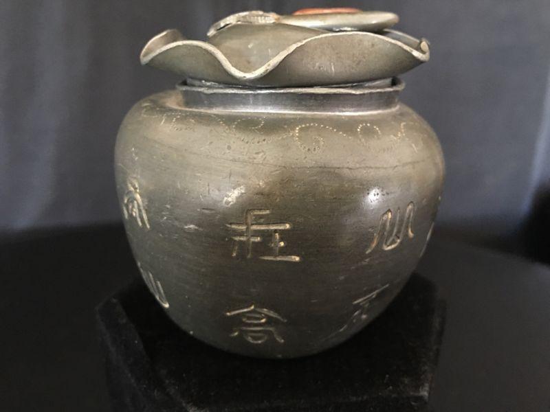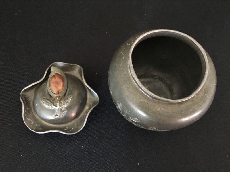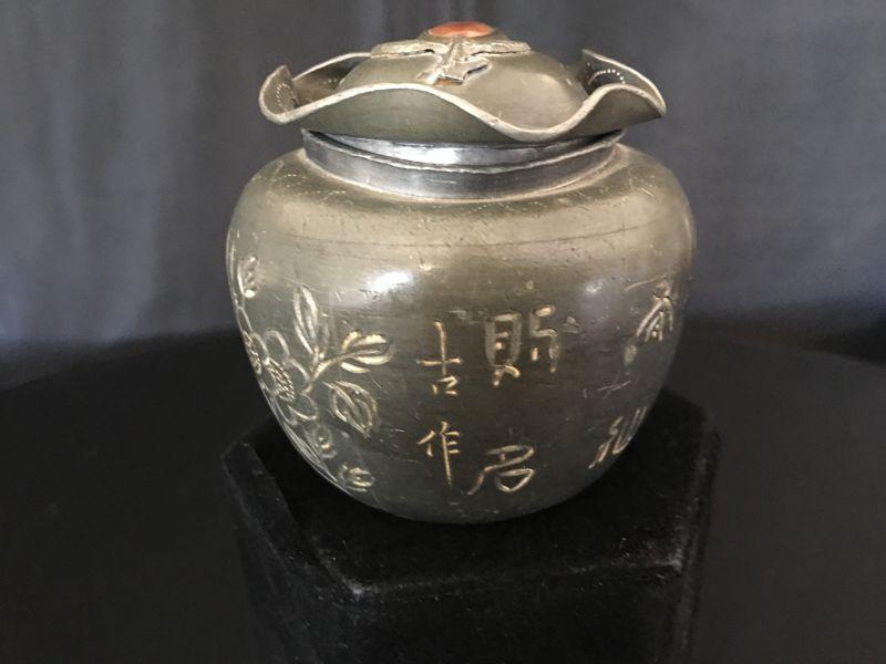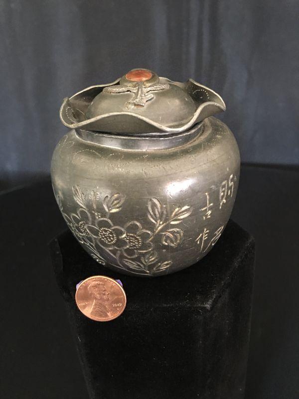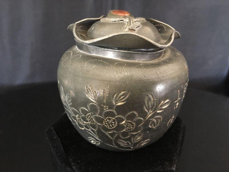 Nice old small lidded Chinese Pewter Jar w/ Stone Floral Detail Lot #340