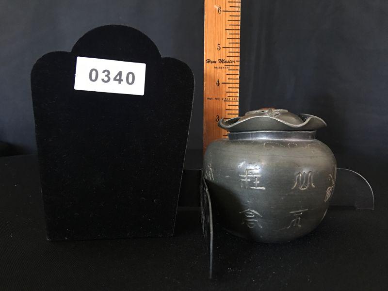 Lidded Chinese Pewter Jar w/ Stone Floral Detail Lot # 340