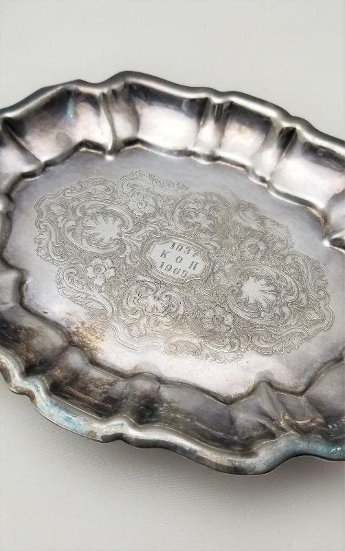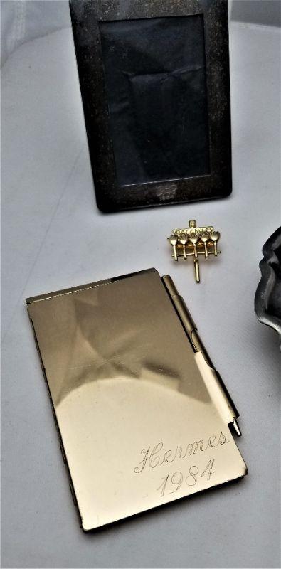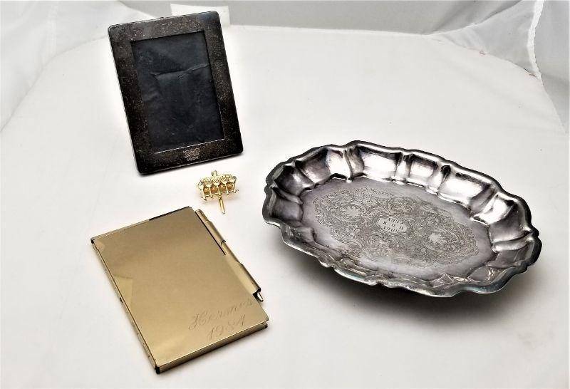 Nice krewe favor lot here - sterling silver photo frame marked Prophets of Persia 1964, 3" x 4" - Gold toned memo pad marked Hermes 1984 - Gold tone Flambeau pin marked Bacchus, and silverplate footed tray marked K Of H (Hermes) 1965.