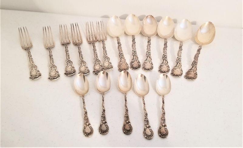 17 pieces of retired Gorhan Greenleaf & Crosby - all pieces are engraved. You get all you see here. Beautiful pattern - 6 dinner forks, 5 teaspoons, 6 serving/tablespoons. We will not sell sterling for less than the scrap price.