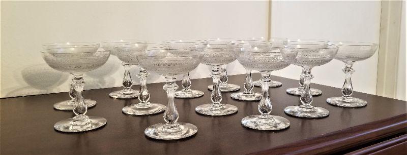 Lovely grouping of 14 matching antique Champagne goblets - pretty etched design. Good condition. Each one is about 4.5" tall.