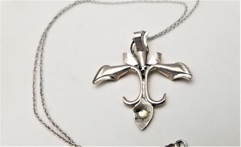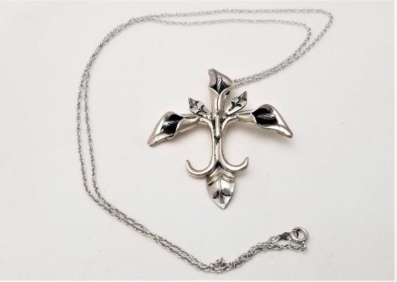 Lovely stylized cross made of Lilies - delicate chain - all done in Sterling Silver. Pendant is 2.25" long and has some weight to it. Good condition.