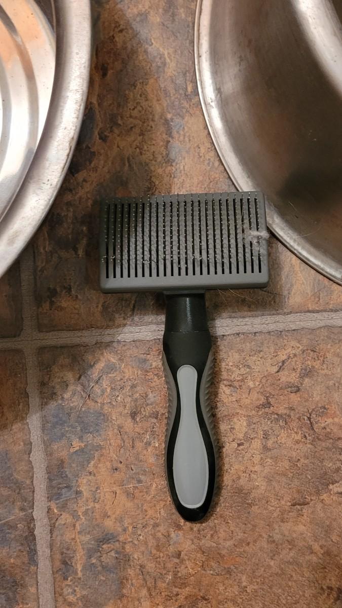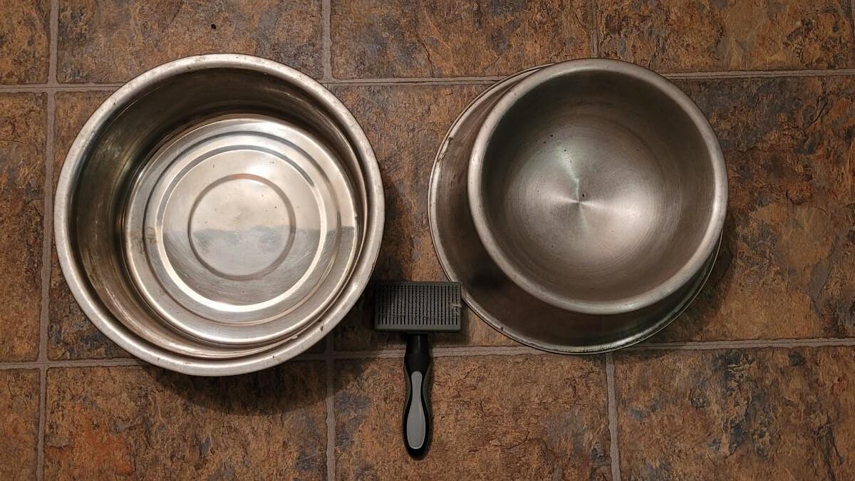 Lot 29: Extra Large Dog Bowls and a Pet Brush