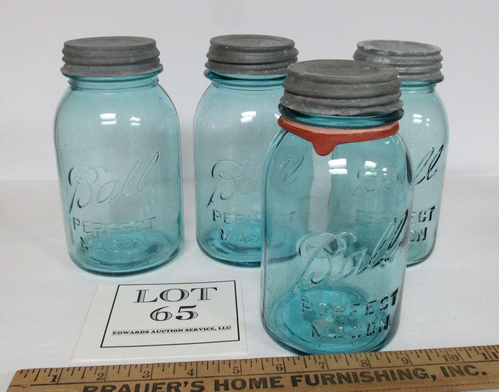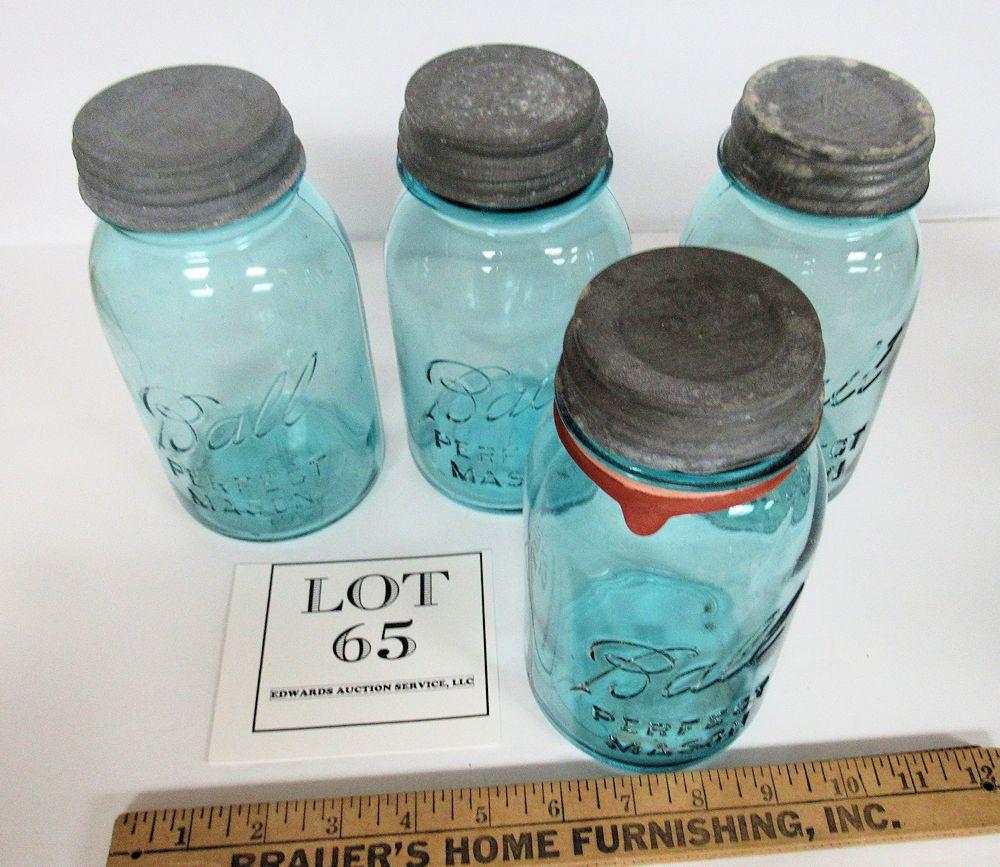 Lot of 4 Old Teal Ball Canning Jars With Covers