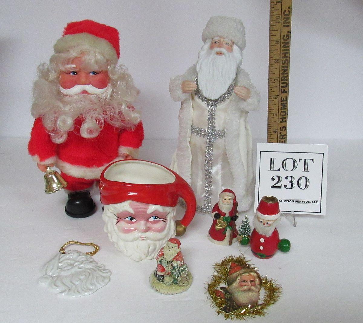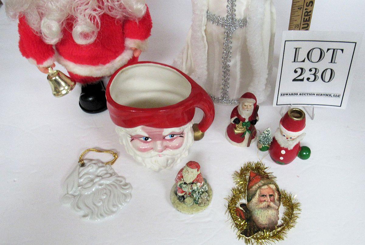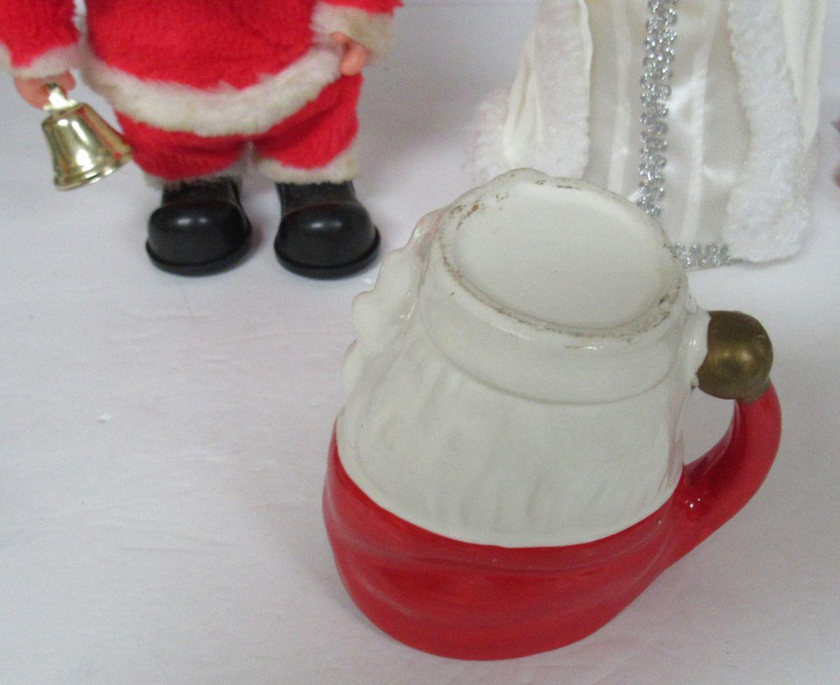Battery operated one, don't know if it works or not, did not put battery in. The white one is a tree topper, nice shape. Santa ceramic mug, ok. ceramic white ornament, good. Others are used, ok condition. Shipping is available at shipping cost plus $5.00 handling fee on up to 8 lots, $10.00 handling fee on 9 or more lots or two boxes.