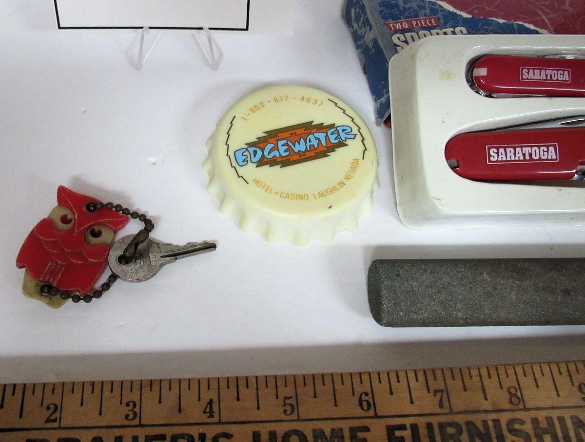 Misc Smalls, Wise Owl Cleaners Owl Key Ring, Bottle Opener, Jack Knives, Old Dog Tags, Sharpening Stone, Etc