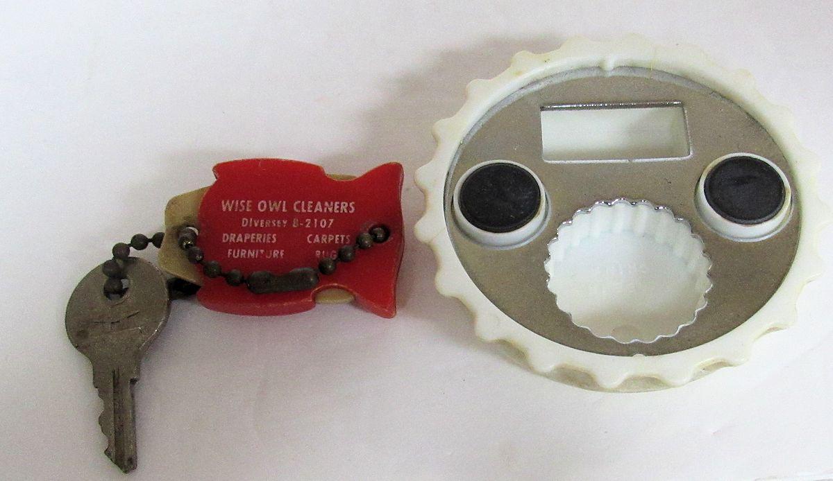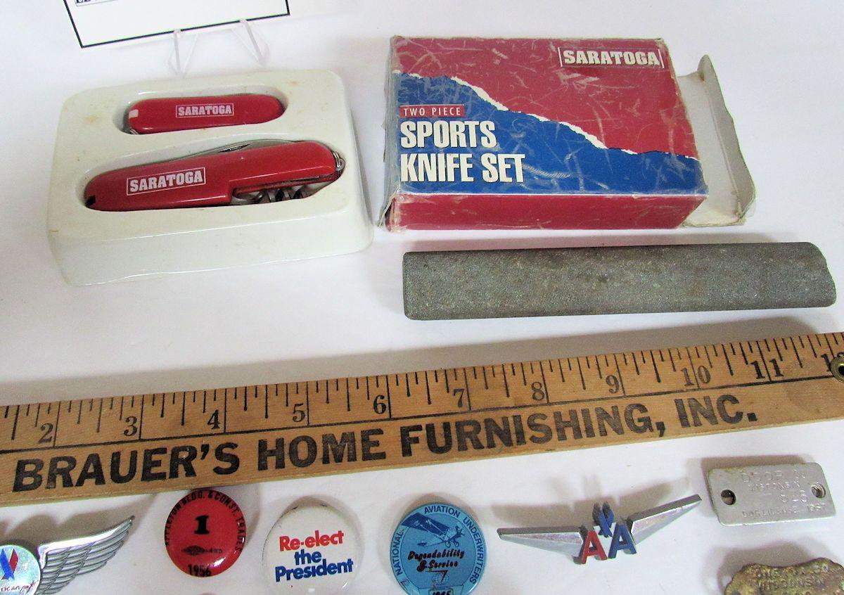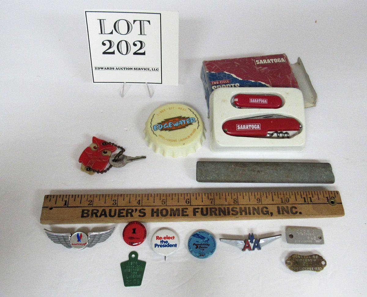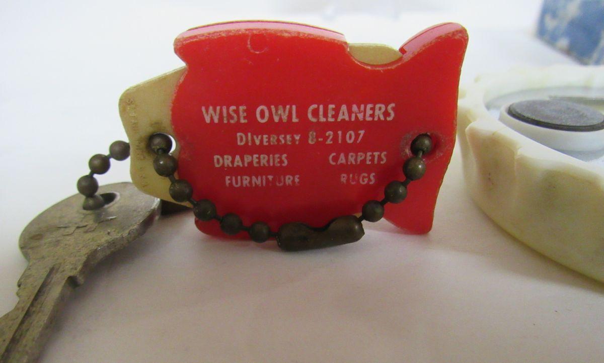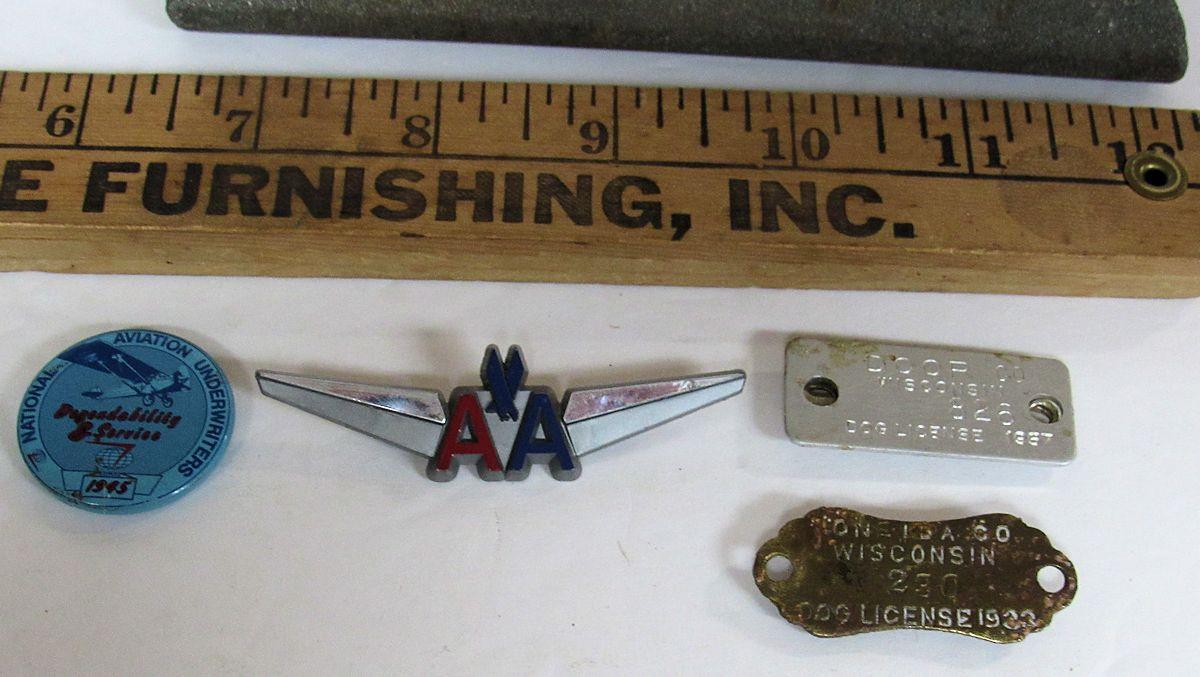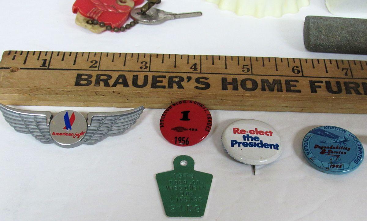 All in good used condition. Pins, pin back buttons, dog tags (1933, 1957, 1976), and others. The dog tags have a safety pin glued to the backs. The Wise Owl Cleaners owl key ring is a neat older piece of hard plastic. Shipping is available at shipping cost plus $5.00 handling fee on up to 8 lots, $10.00 handling fee on 9 or more lots or two boxes.