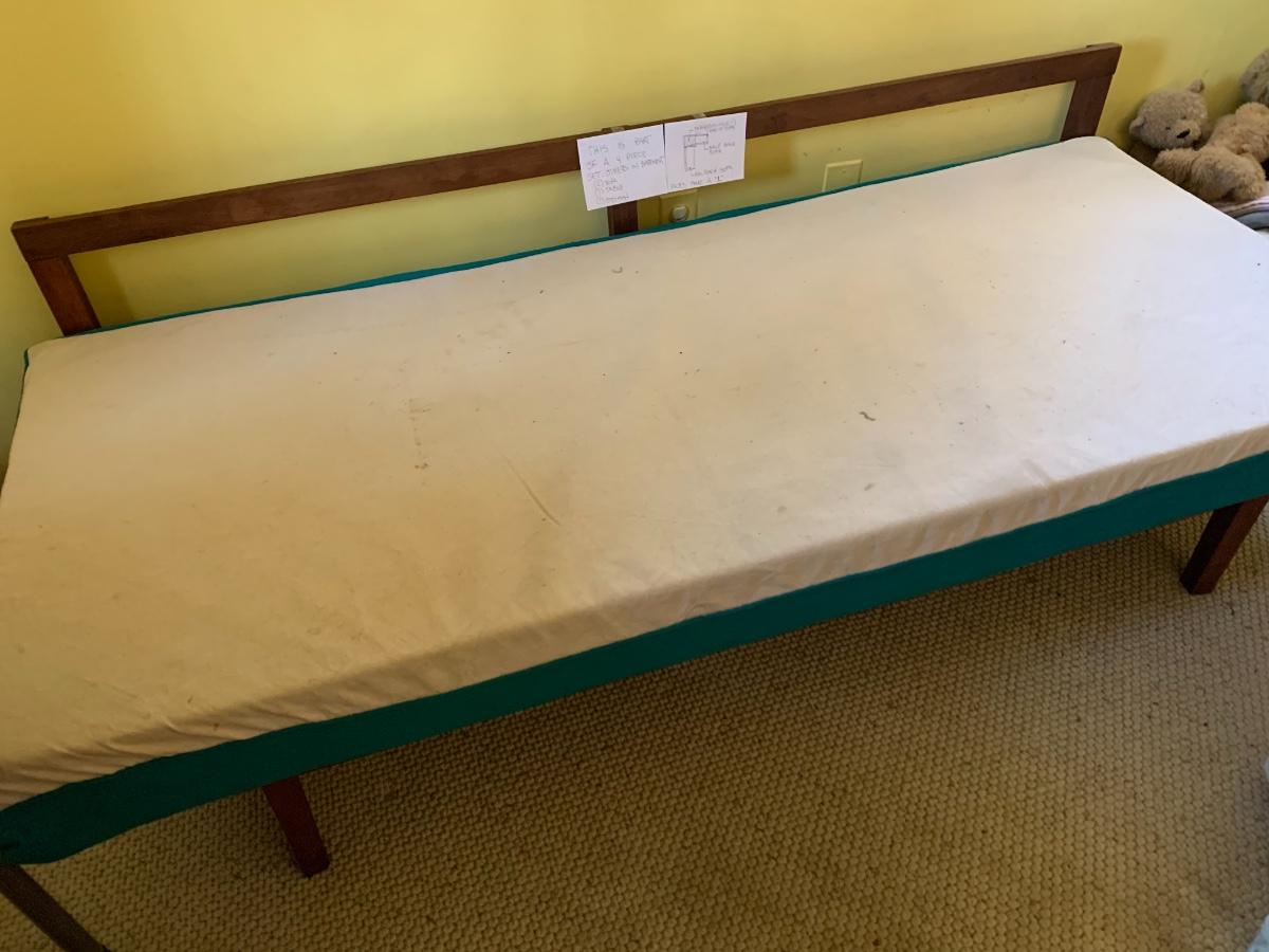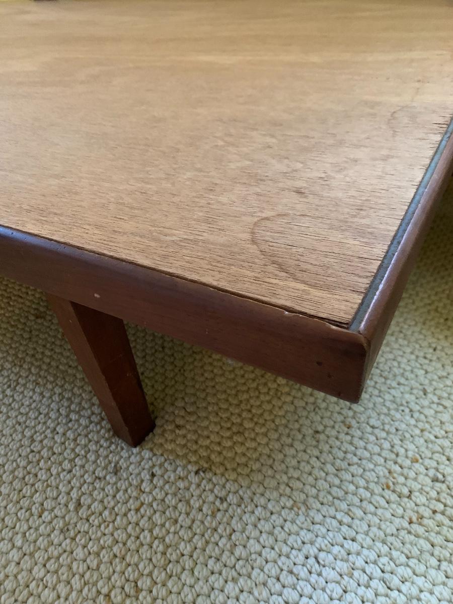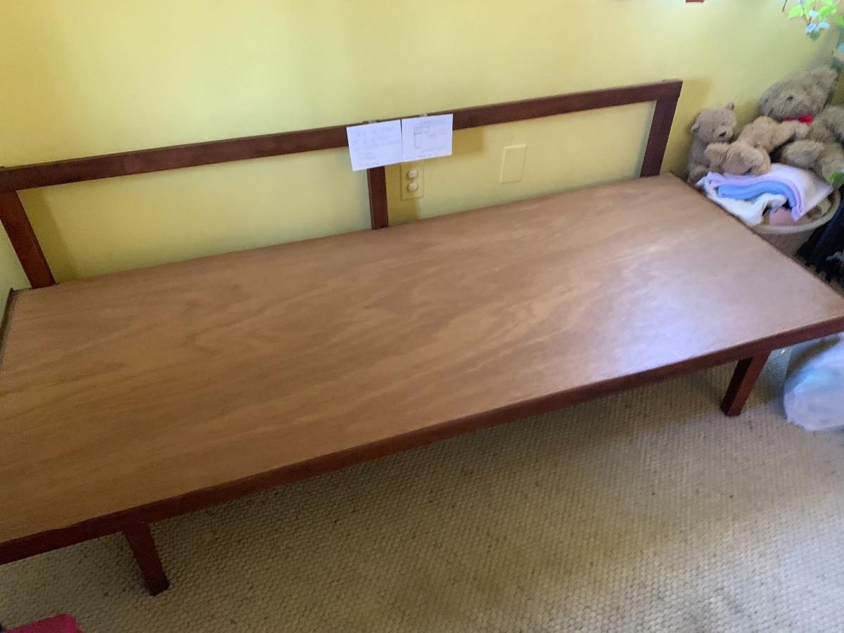no makers mark - shows some age/use wear. Super cool MCM design. Cushions will need a recover - structure is very sound.
