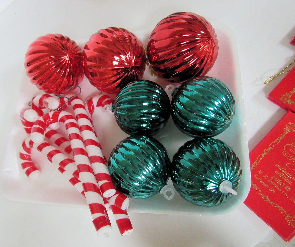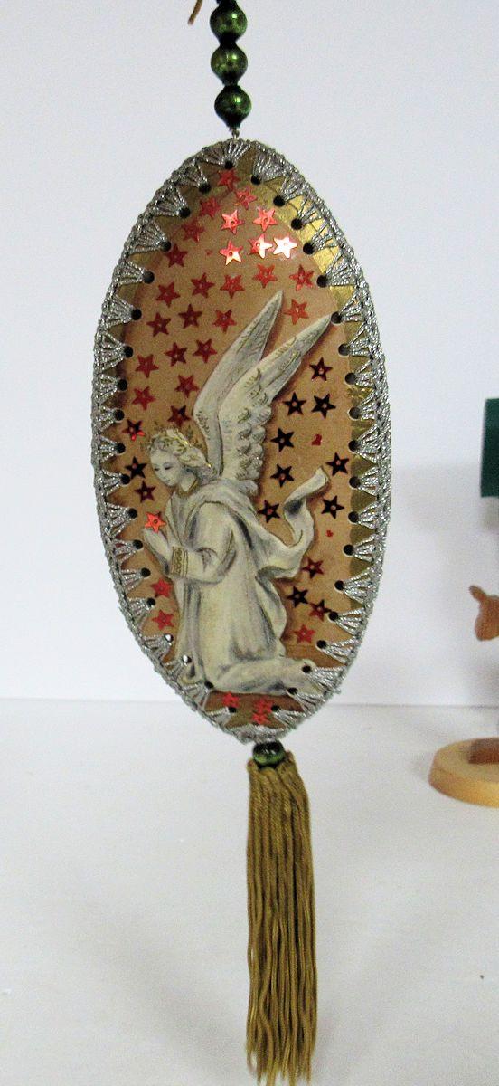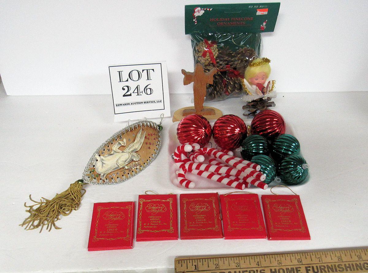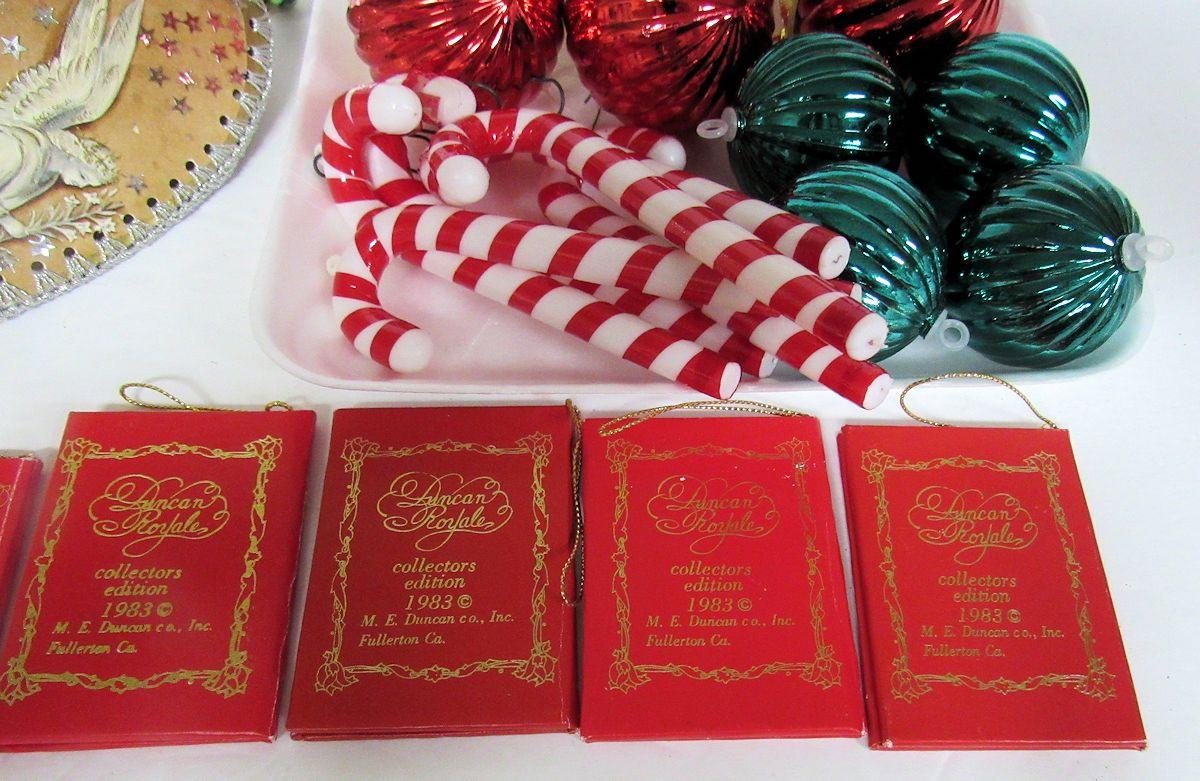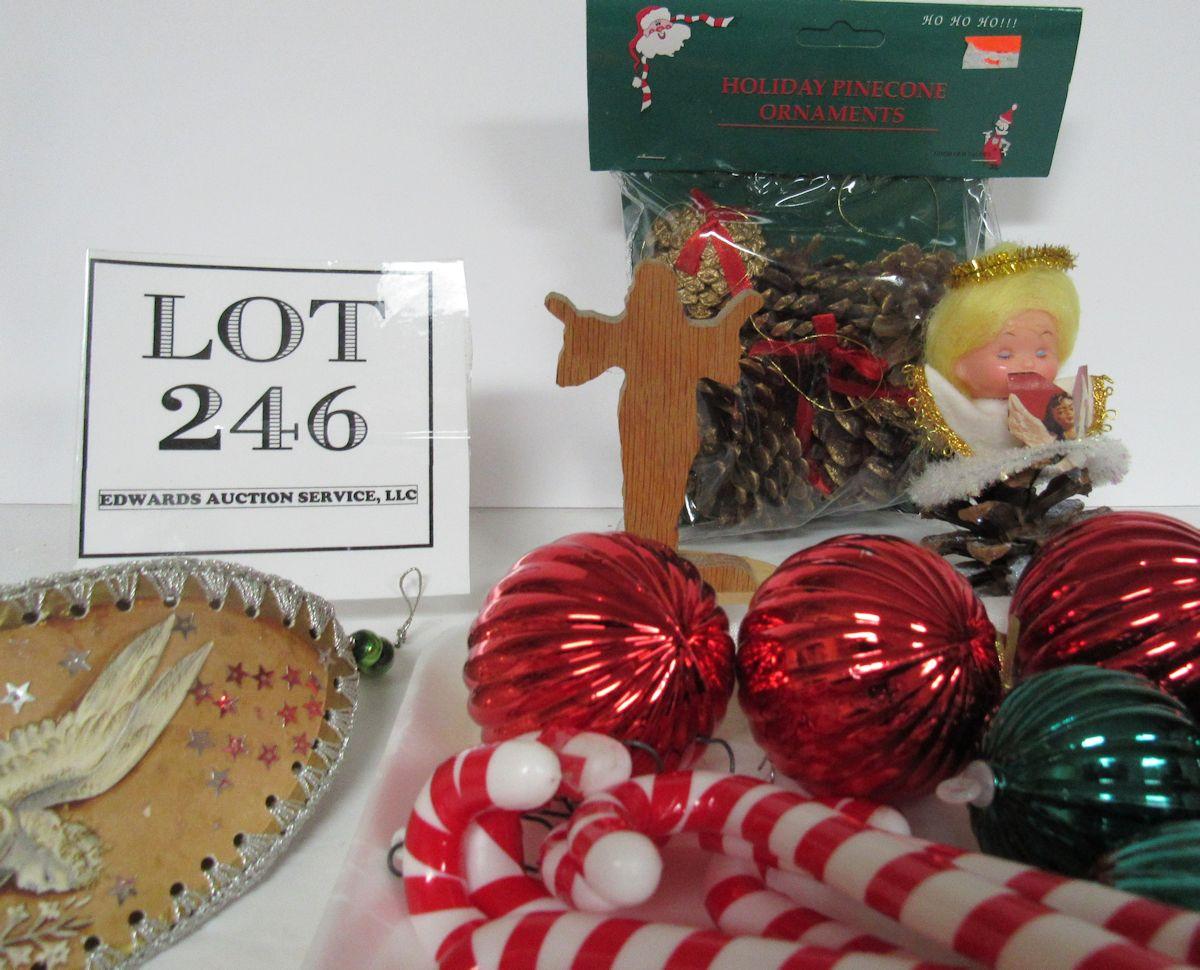 Long angels on plastic oval with tassels, nice shape. Plastic balls and canes, some of the ribbon is coming loose on some canes. Rest appear to be ok. Shipping is available at shipping cost plus $5.00 handling fee on up to 8 lots, $10.00 handling fee on 9 or more lots or two boxes.