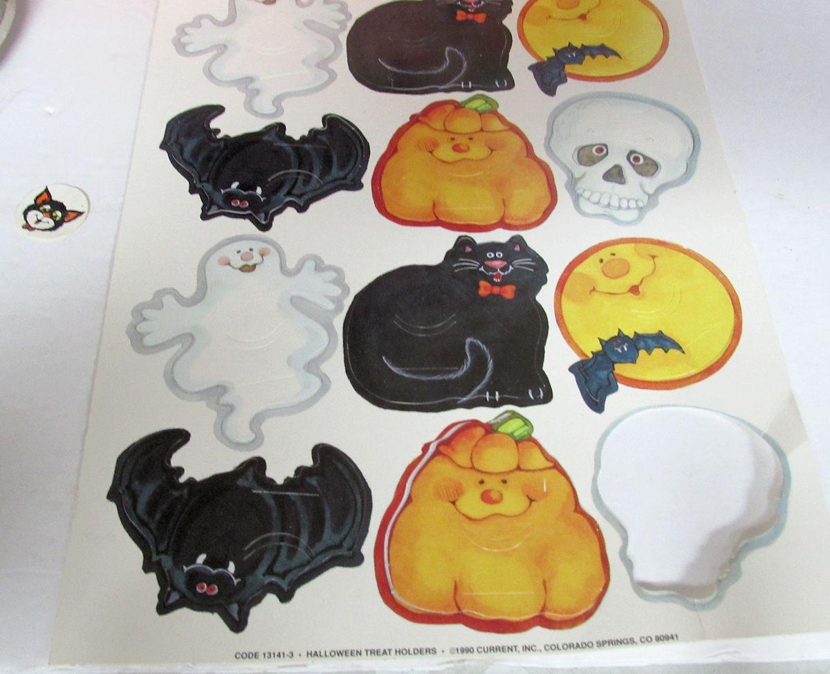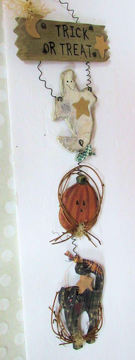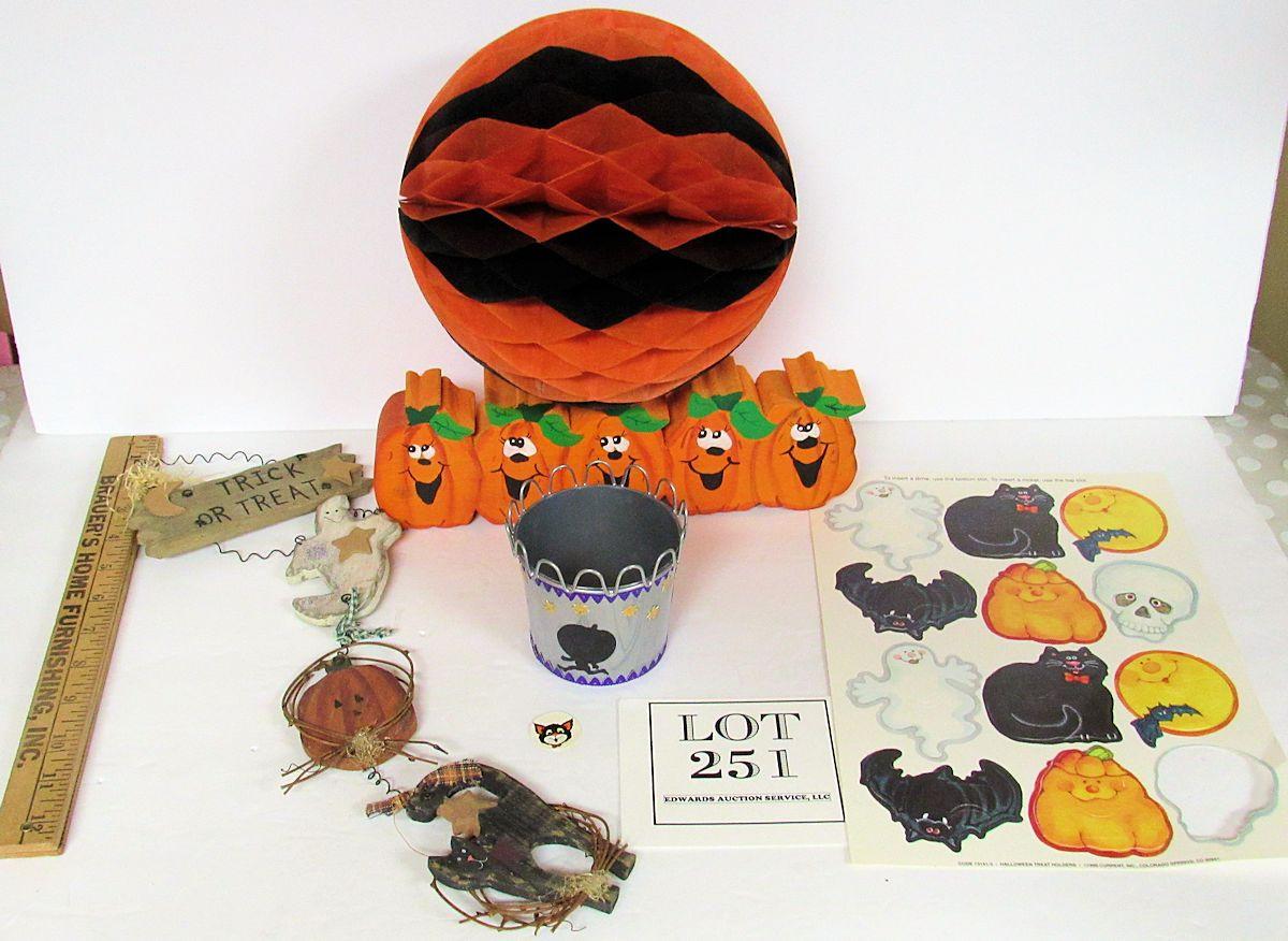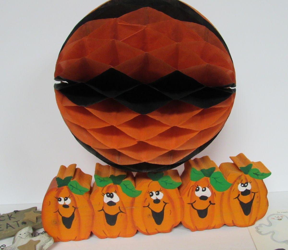 Honeycomb ball has no tabs. Wood hanger and pumpkins, decorated metal dish, Current, Inc paper cutout coin holders (one missing), all in good condition.