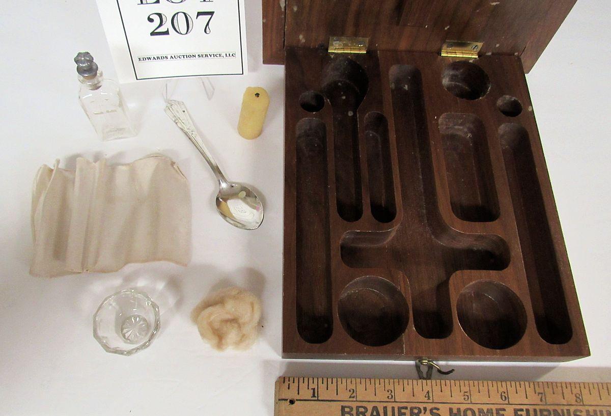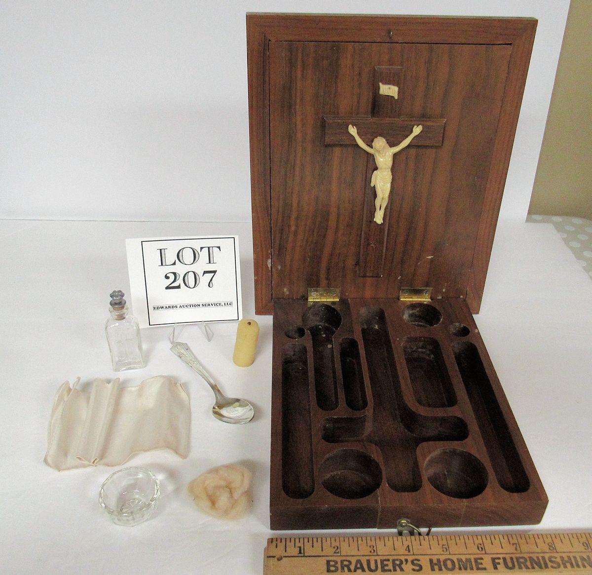 Used. Has Holy Water Bottle, partial candle, spoon, fabric wad, fabric square and mini glass salt dip. Top image is worn, wear to the box, but it is intact. Shipping is available at shipping cost plus $5.00 handling fee on up to 8 lots, $10.00 handling fee on 9 or more lots or two boxes.