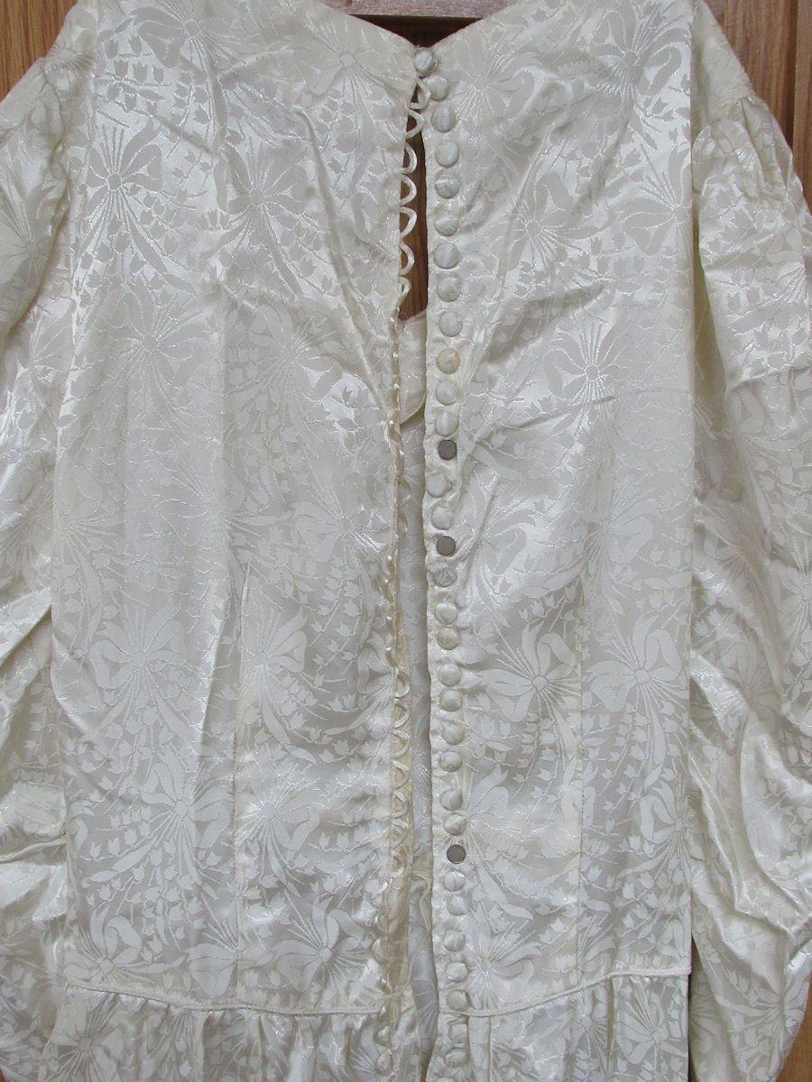 Some buttons on back lost their covering and need some mending. There are some spots and a little light yellowing in a few spots.