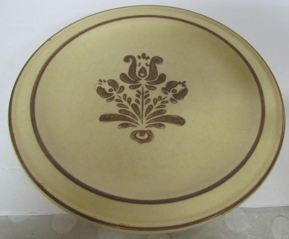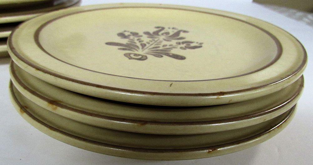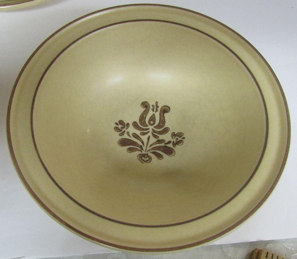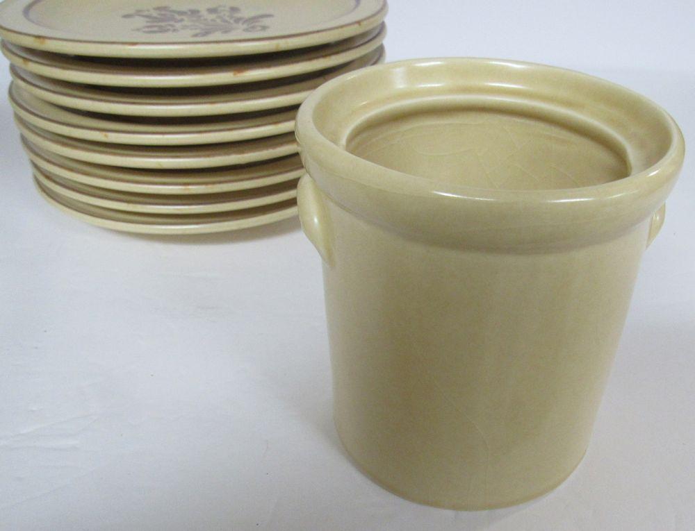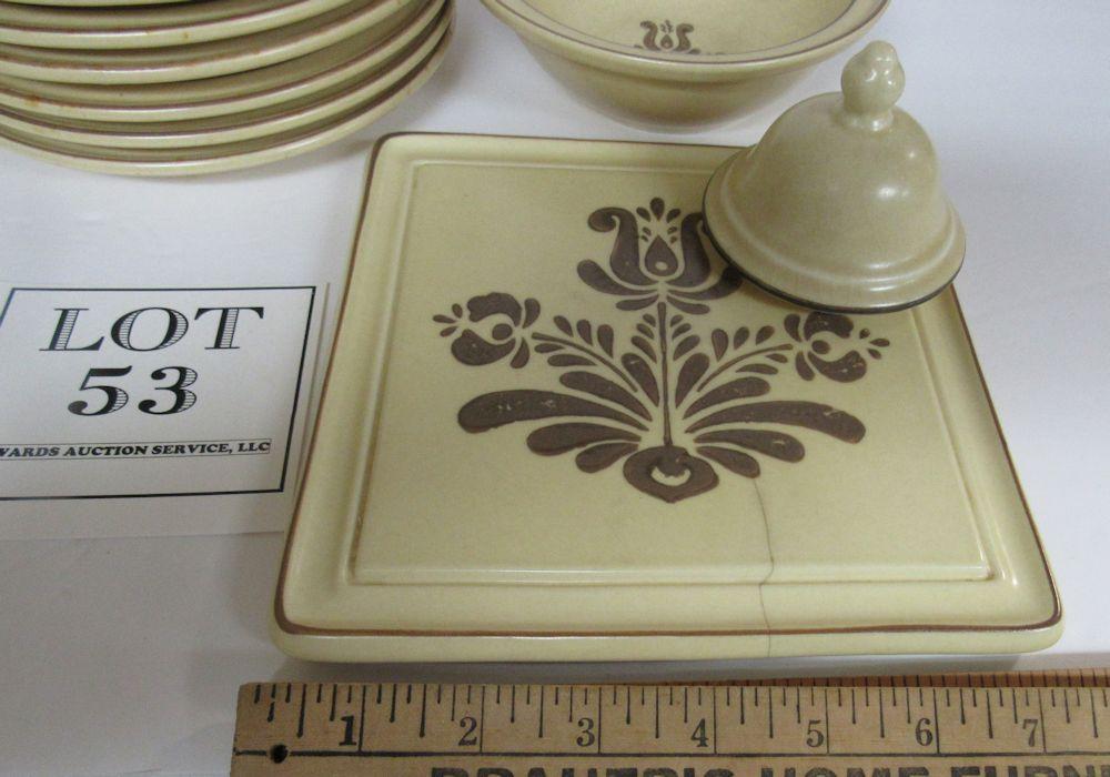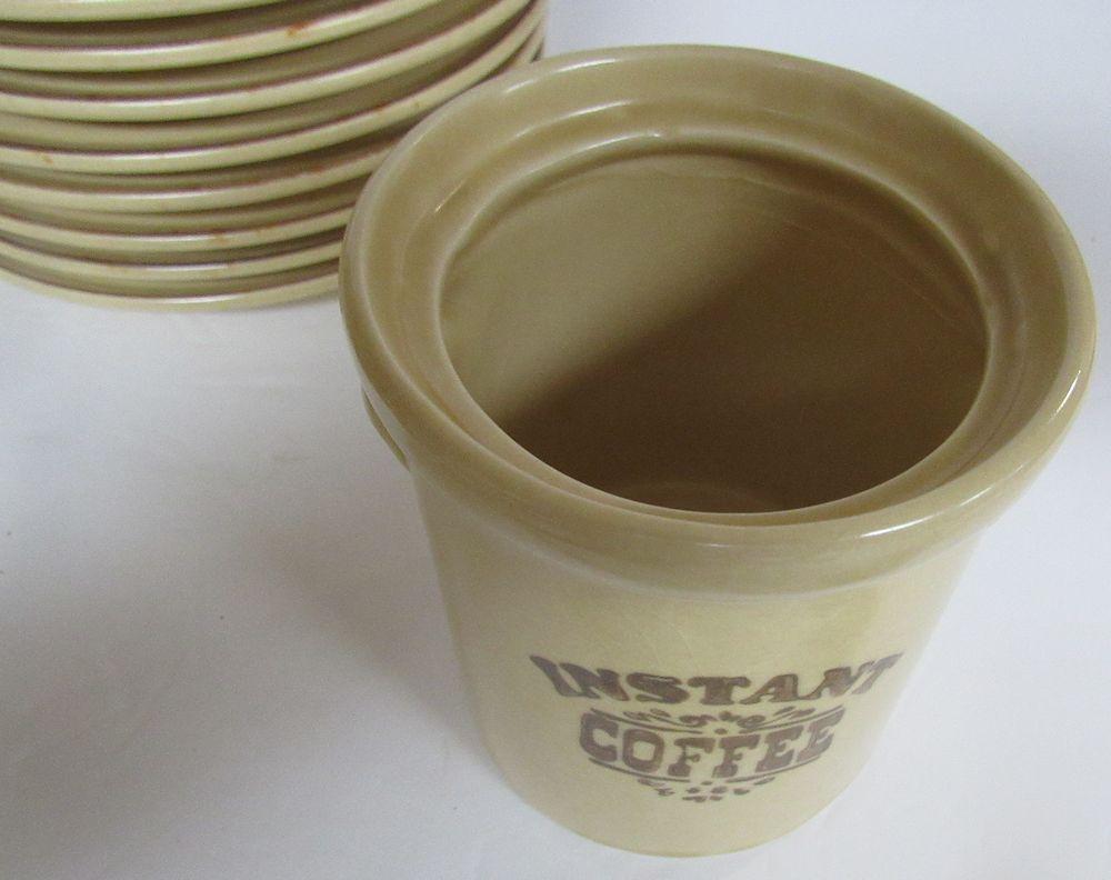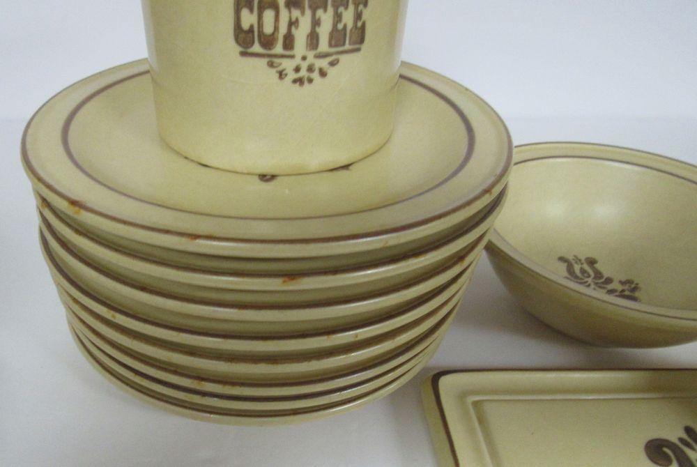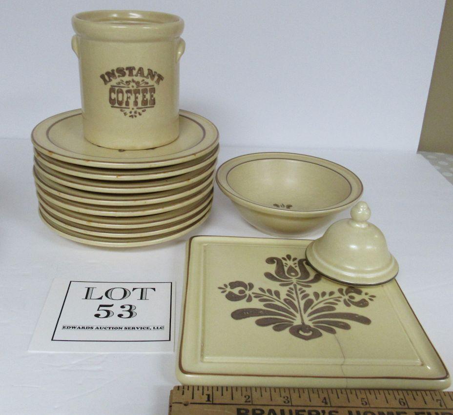 The instant coffee canister is good with clear crazing in spots and no cover. The cover is good, but has no bottom, and not sure what it goes to. The bowl has dark use wear. The saucers all have brown spots on the rims. The trivet has a crack. No shipping on this lot.