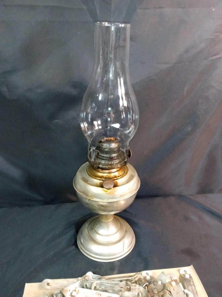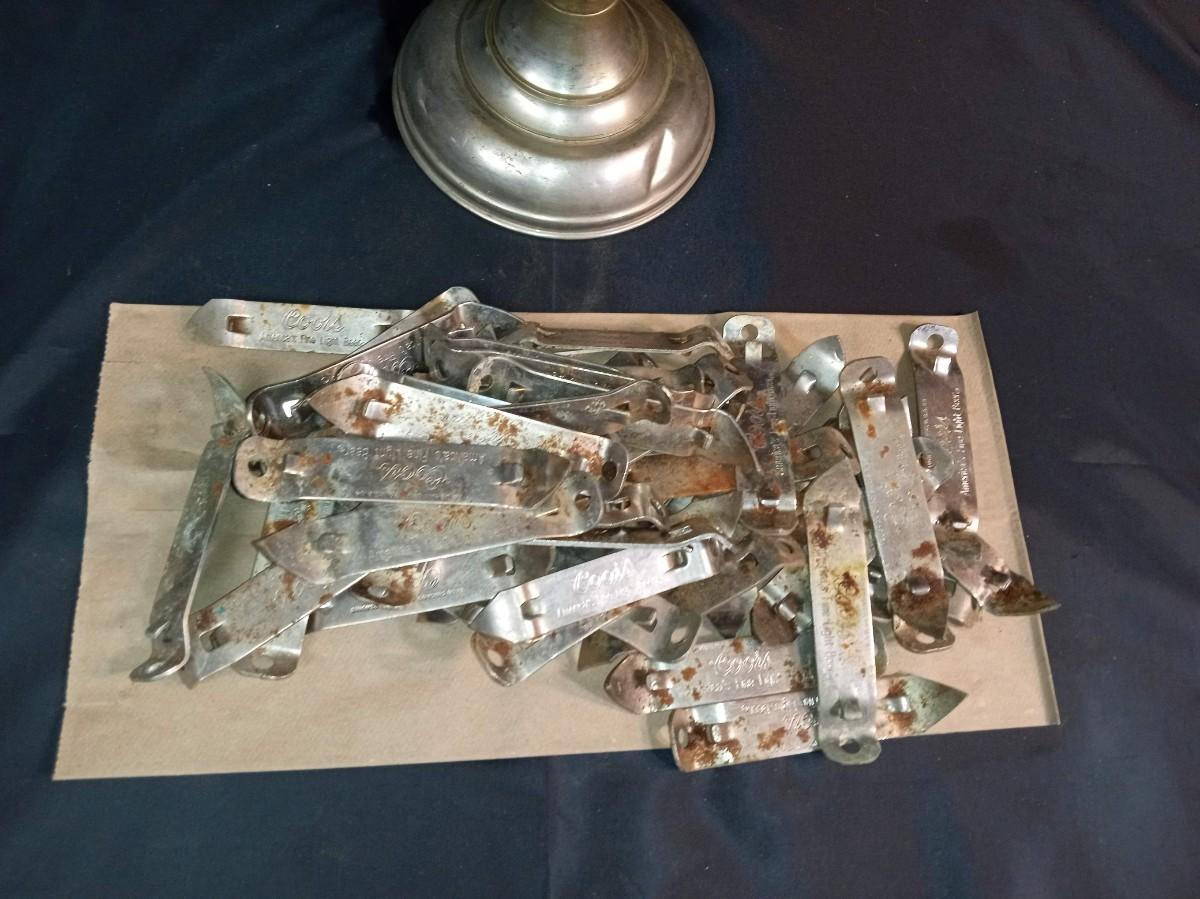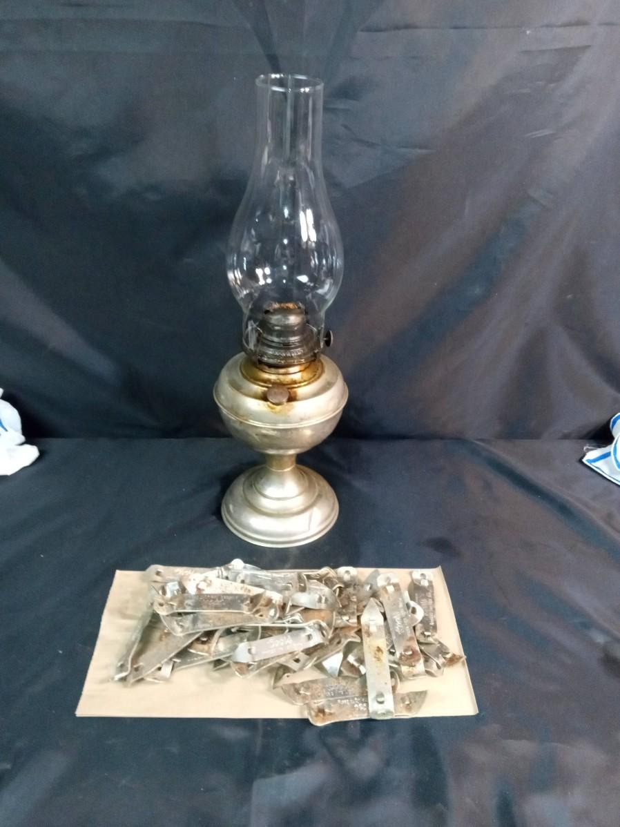 PILE OF BOTTLE OPENERS AND AN OIL LAMP