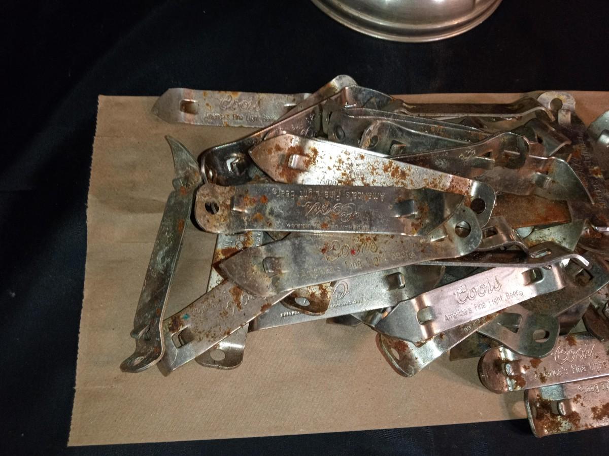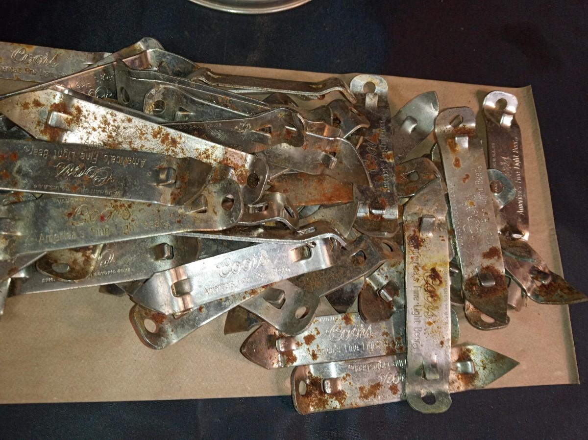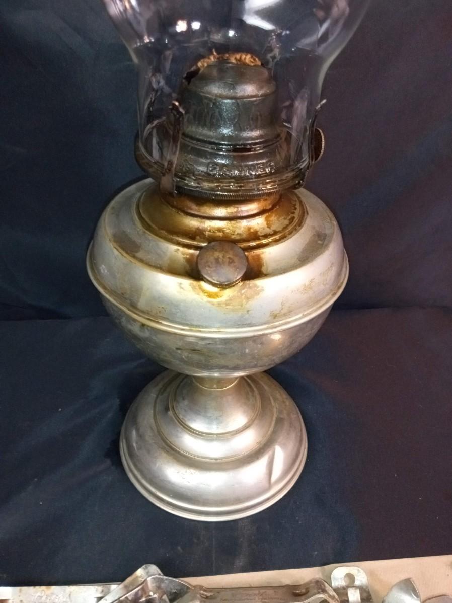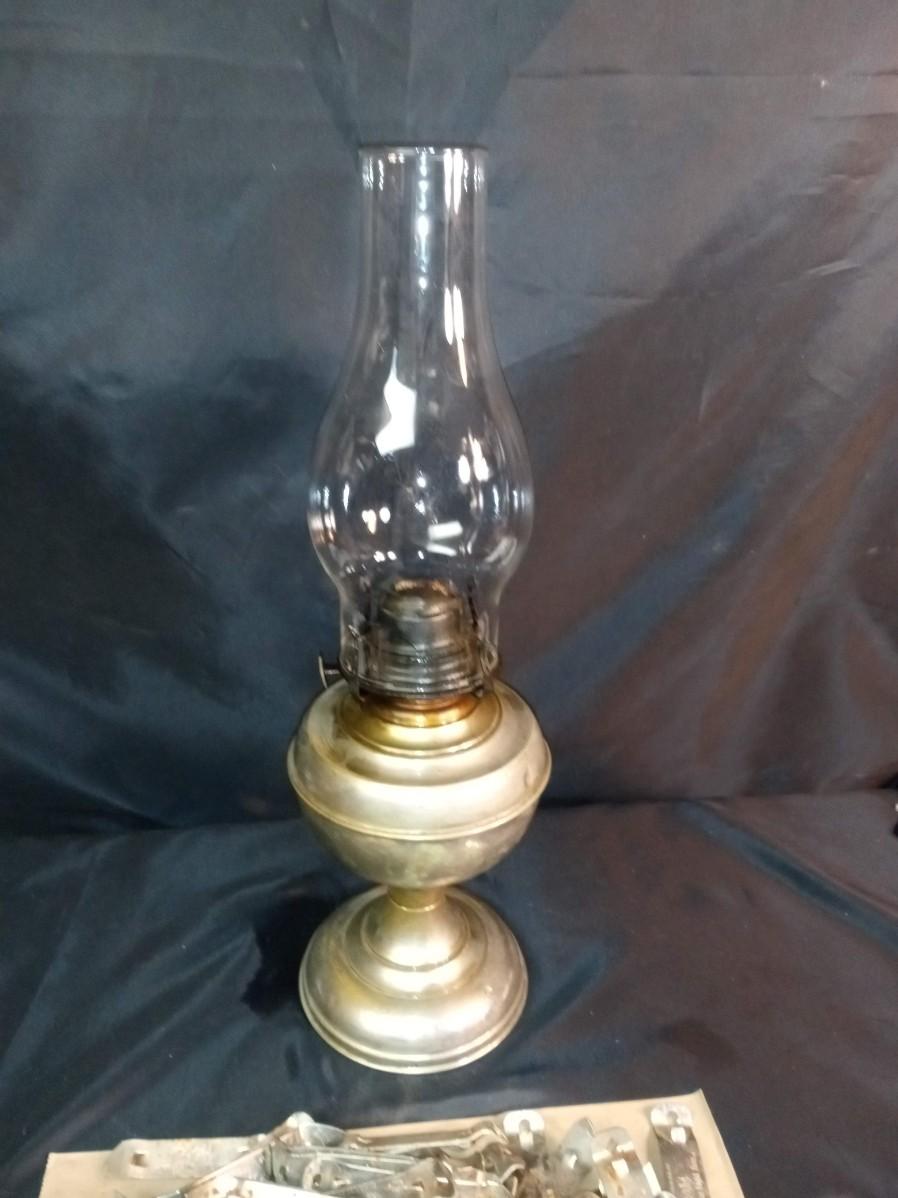PILE OF BOTTLE OPENERS AND AN OIL LAMP