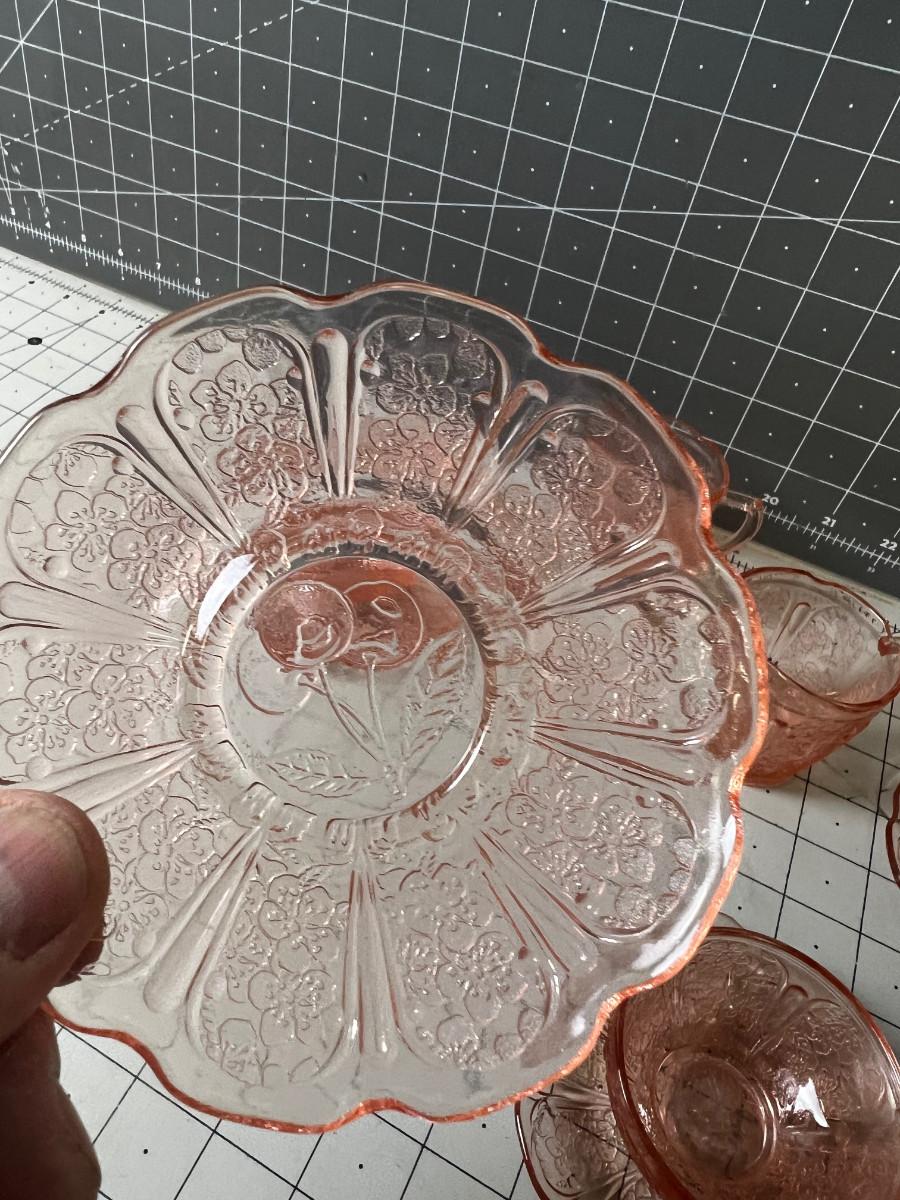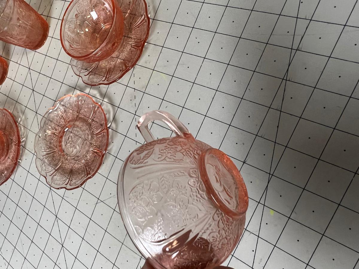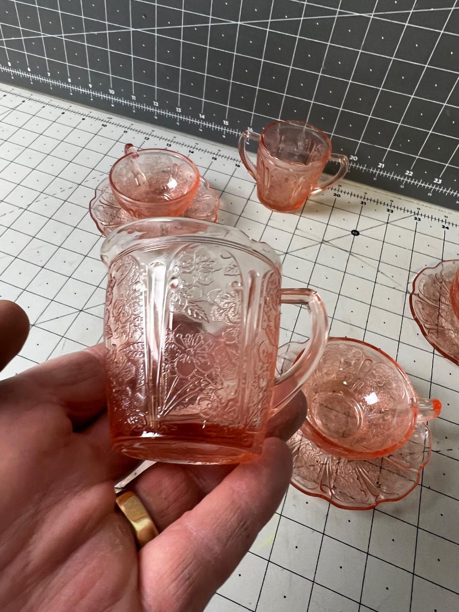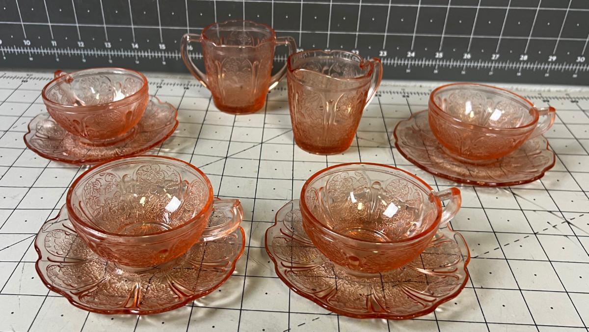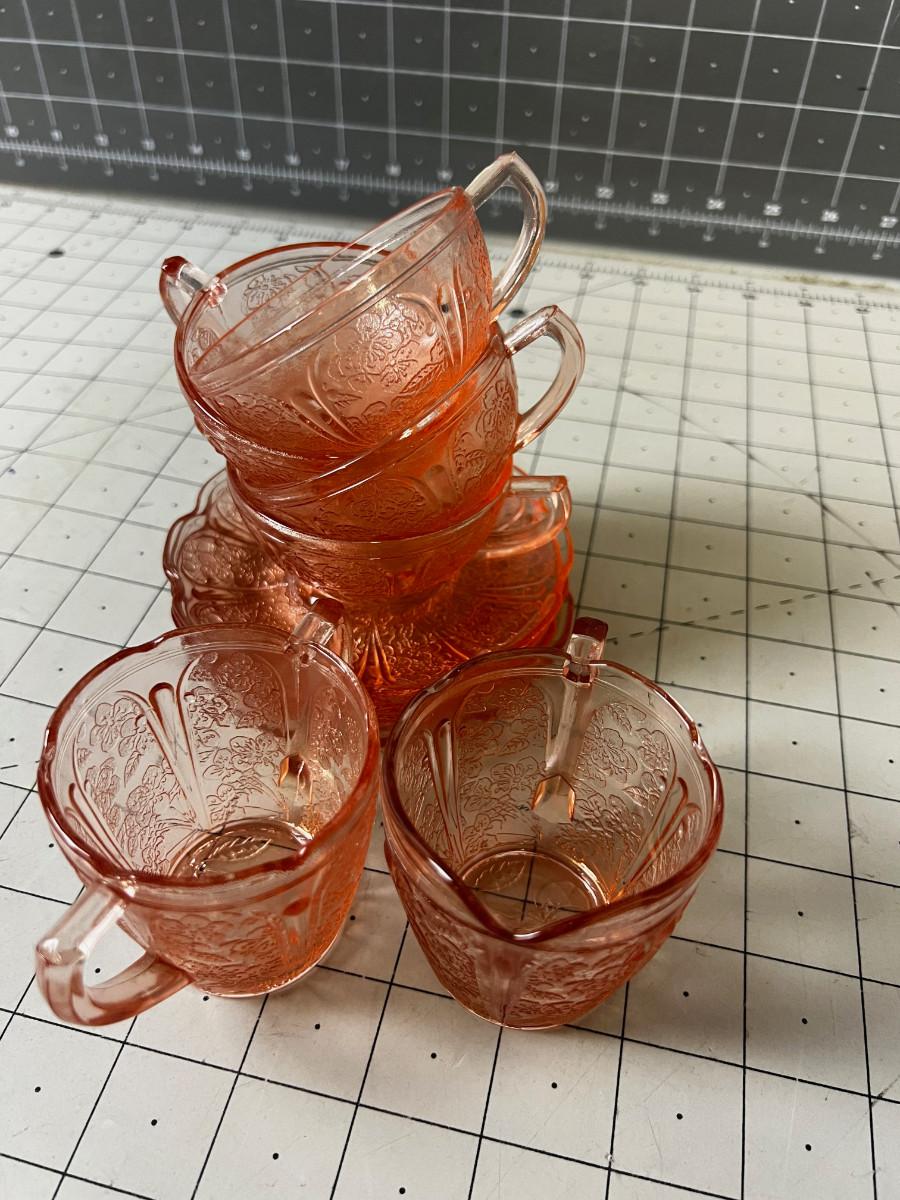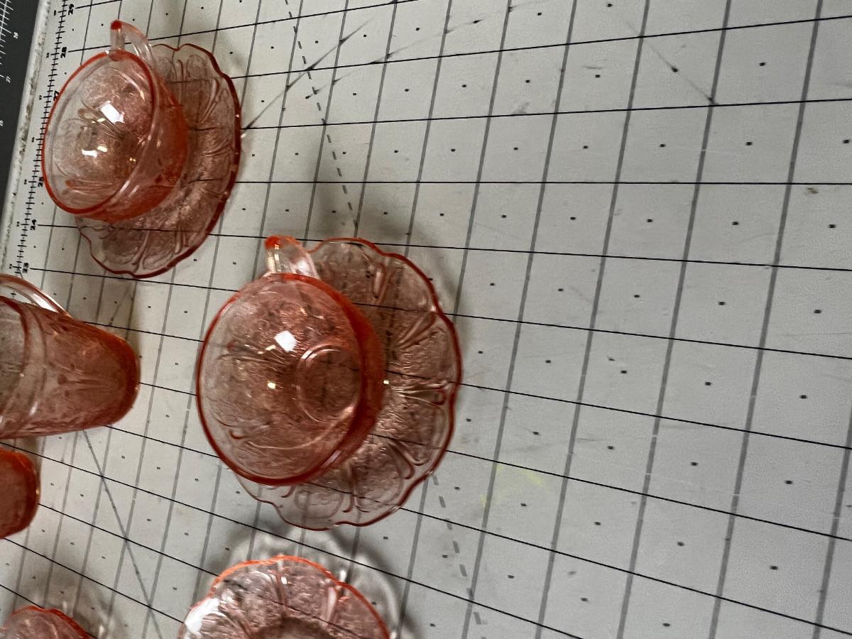 Pink Depression Glass Demitasse Cups, Saucers, Cream & Sugar
