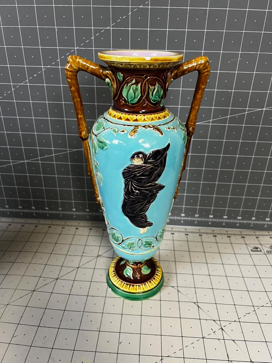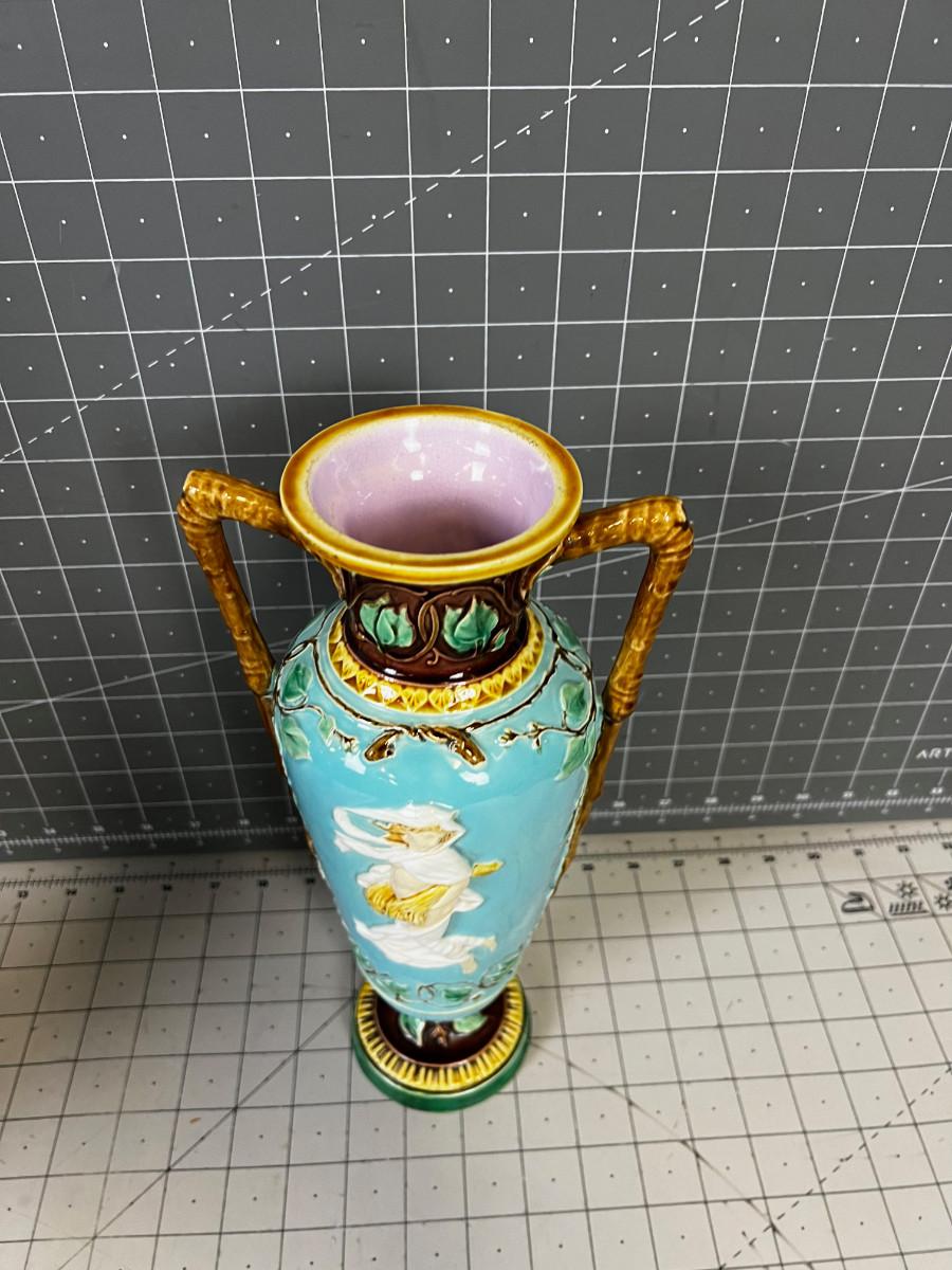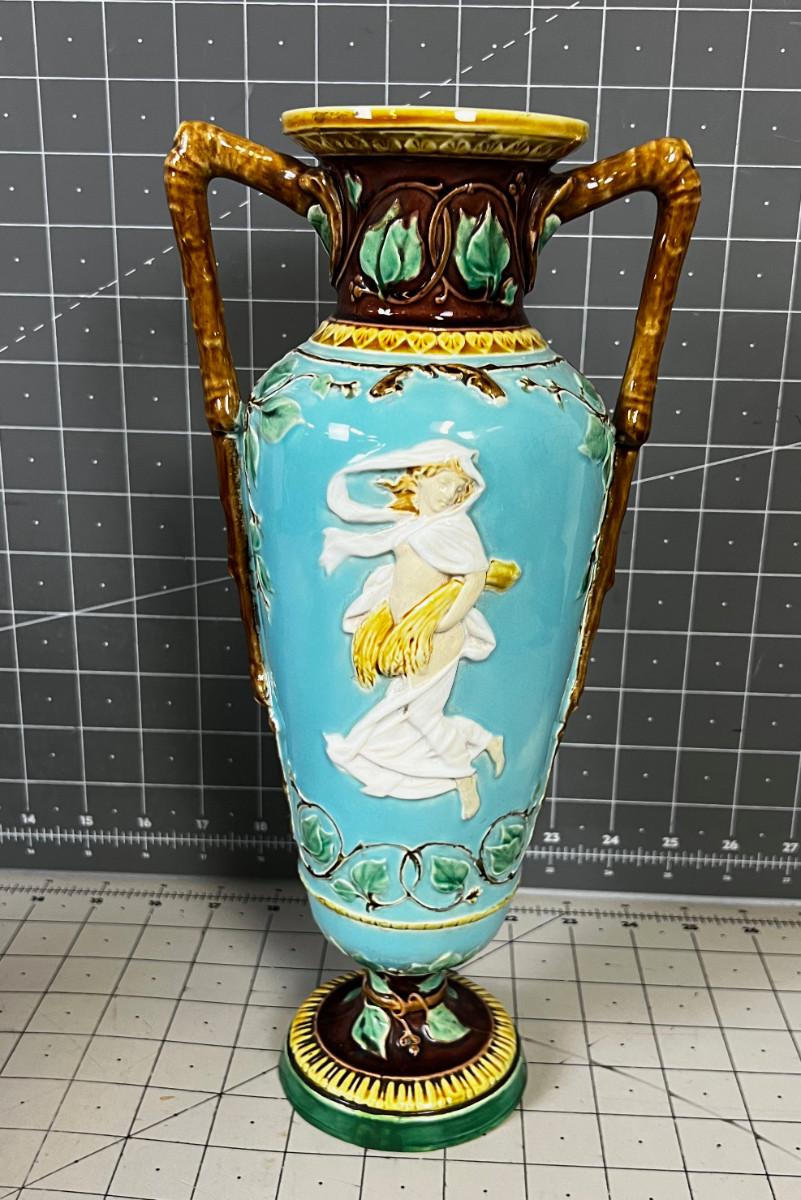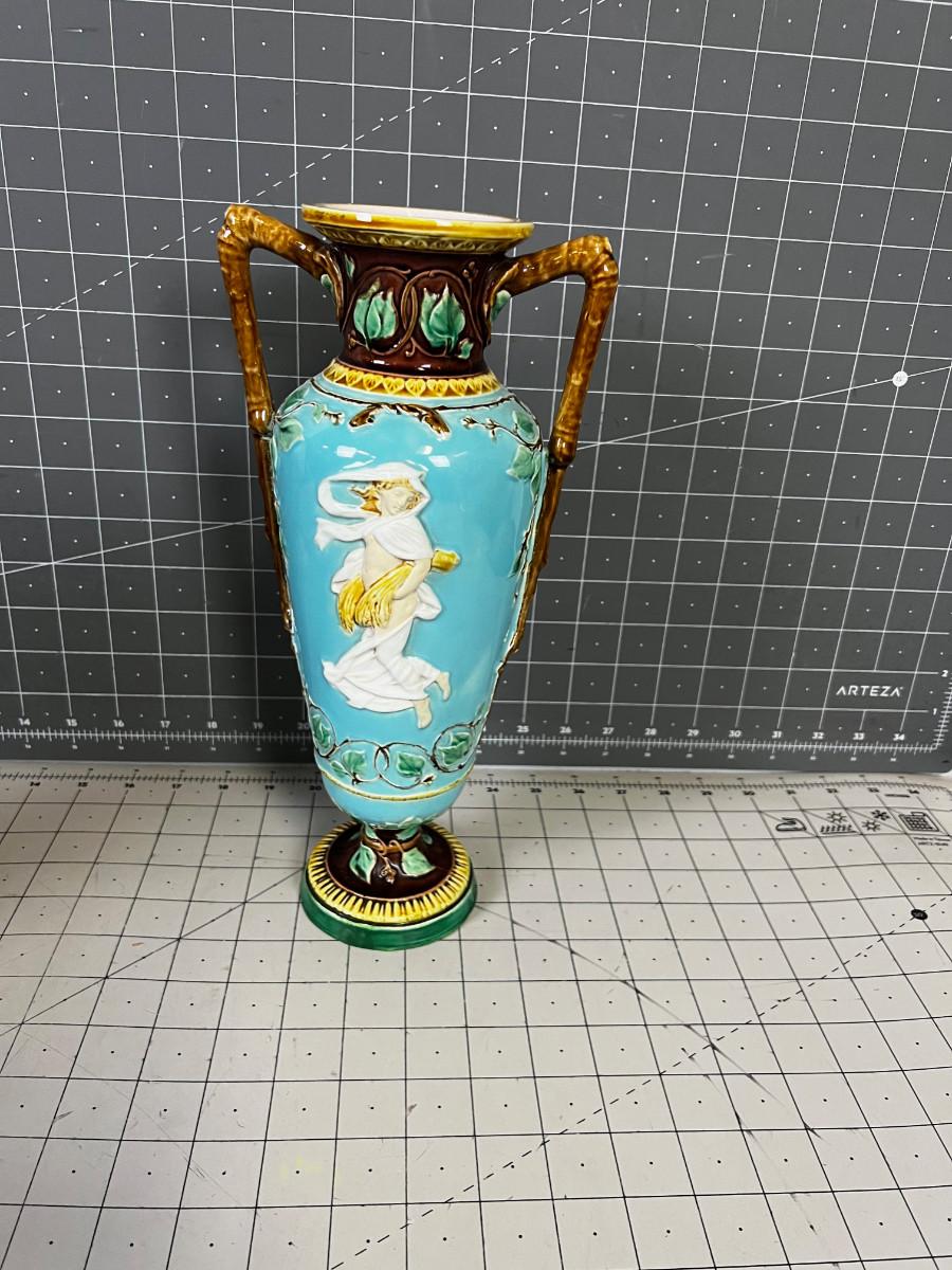 Possibly MITTON Majolica Vase Turquoise with Lady and Brown Handles