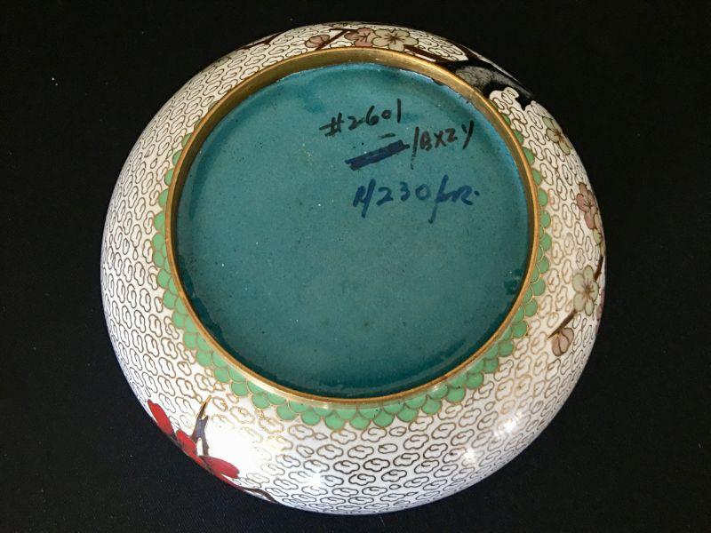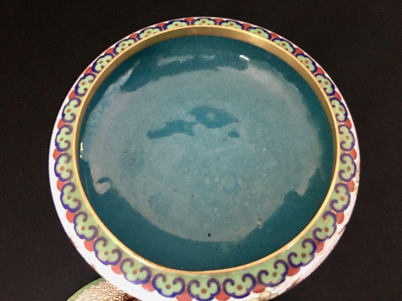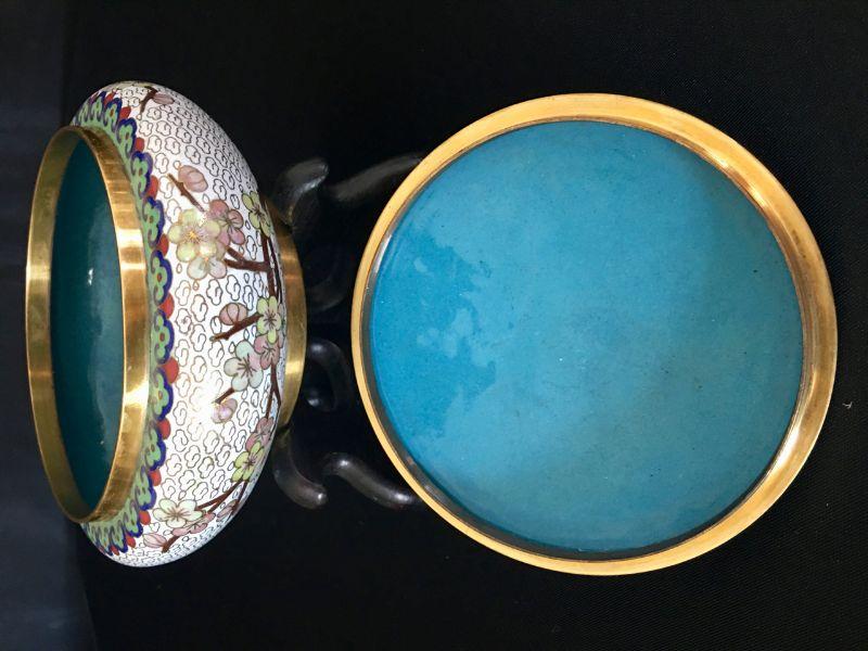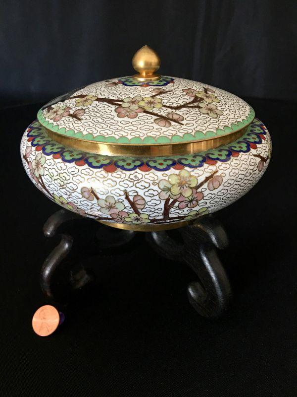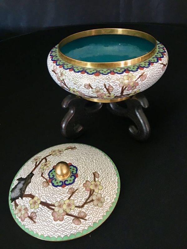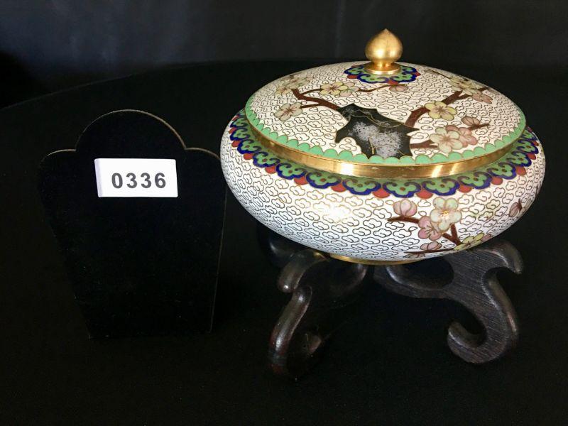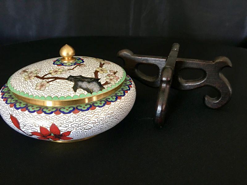 Small White Cloissone Lidded Bowl/ Jar w/ Stand Lot # 337