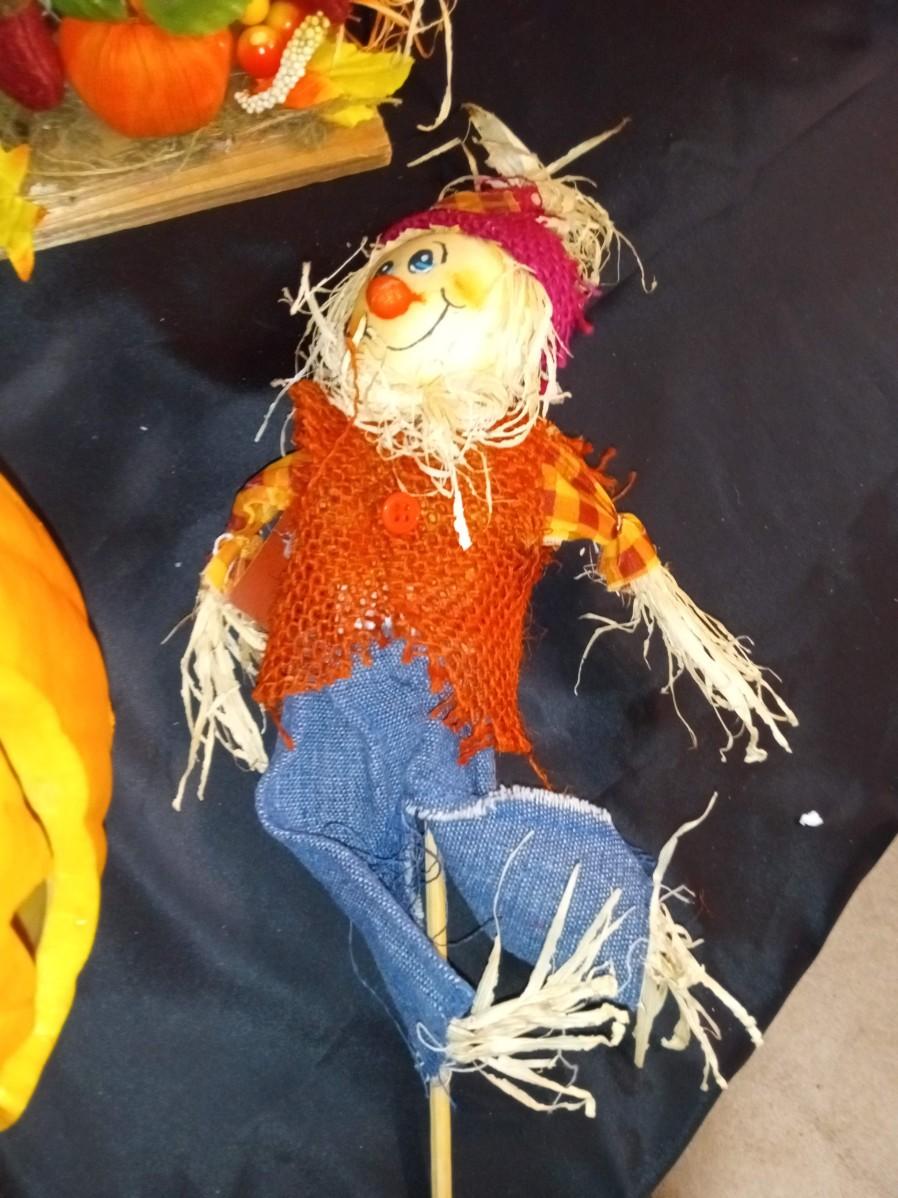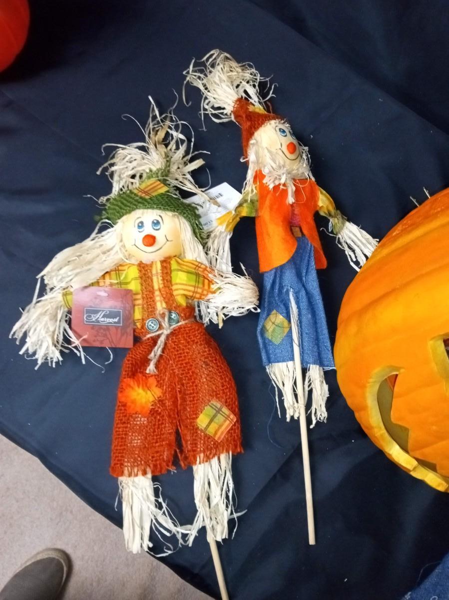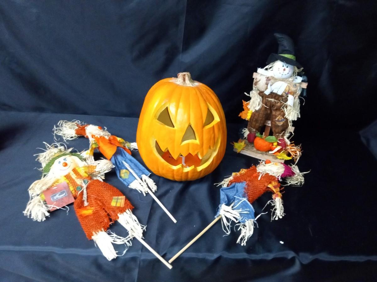 STAKED SCARECROWS AND LIGHTED PUMPKIN