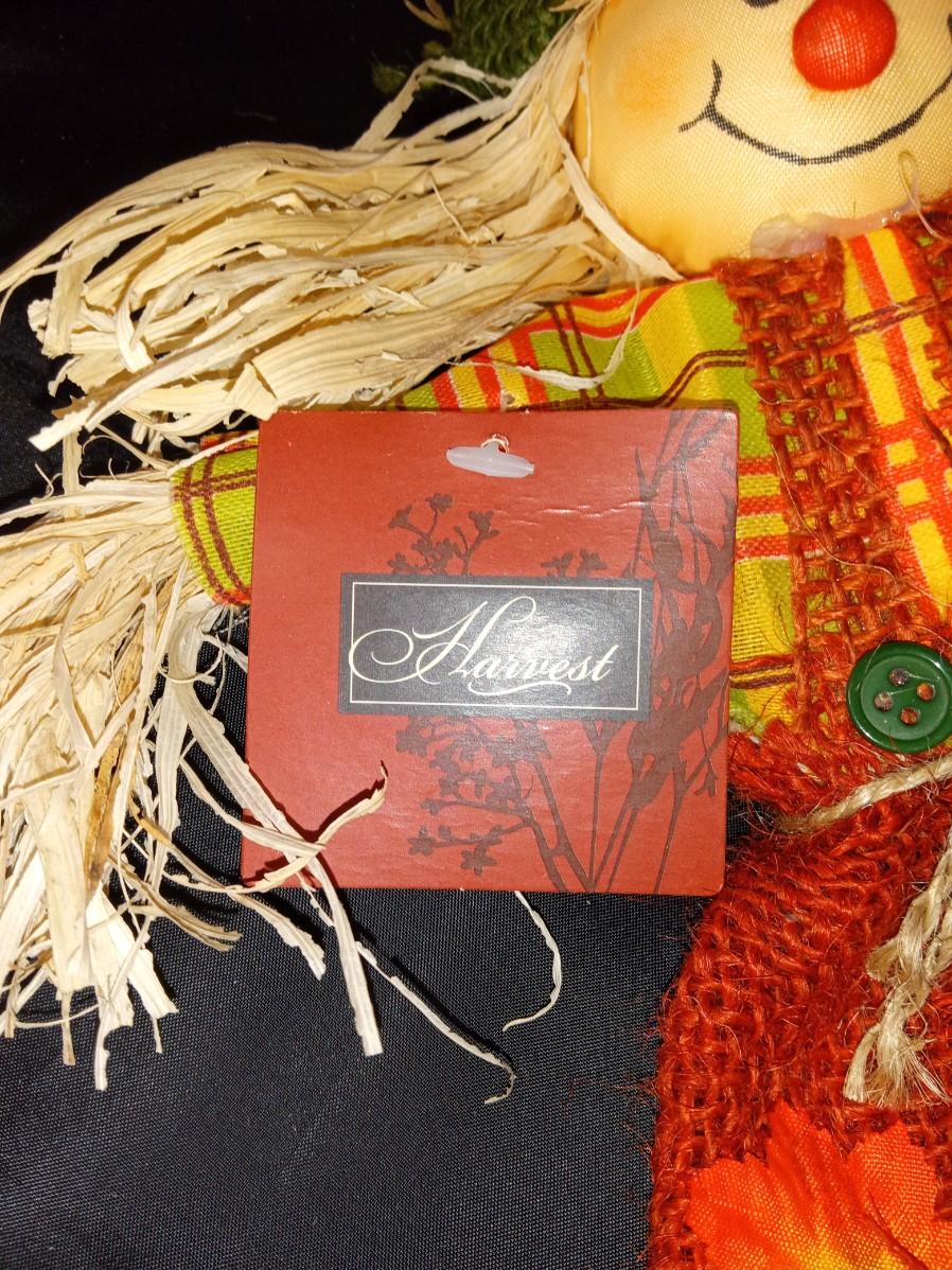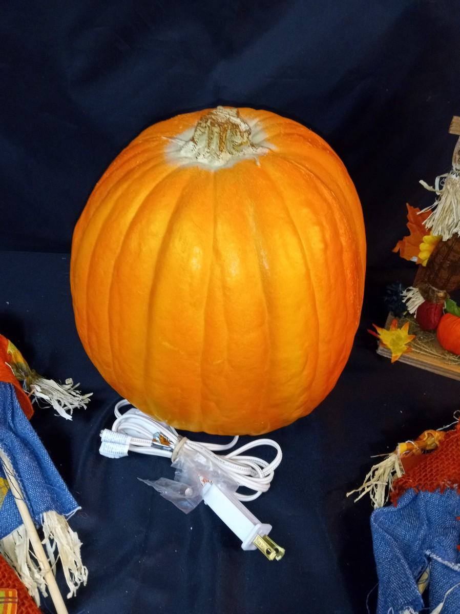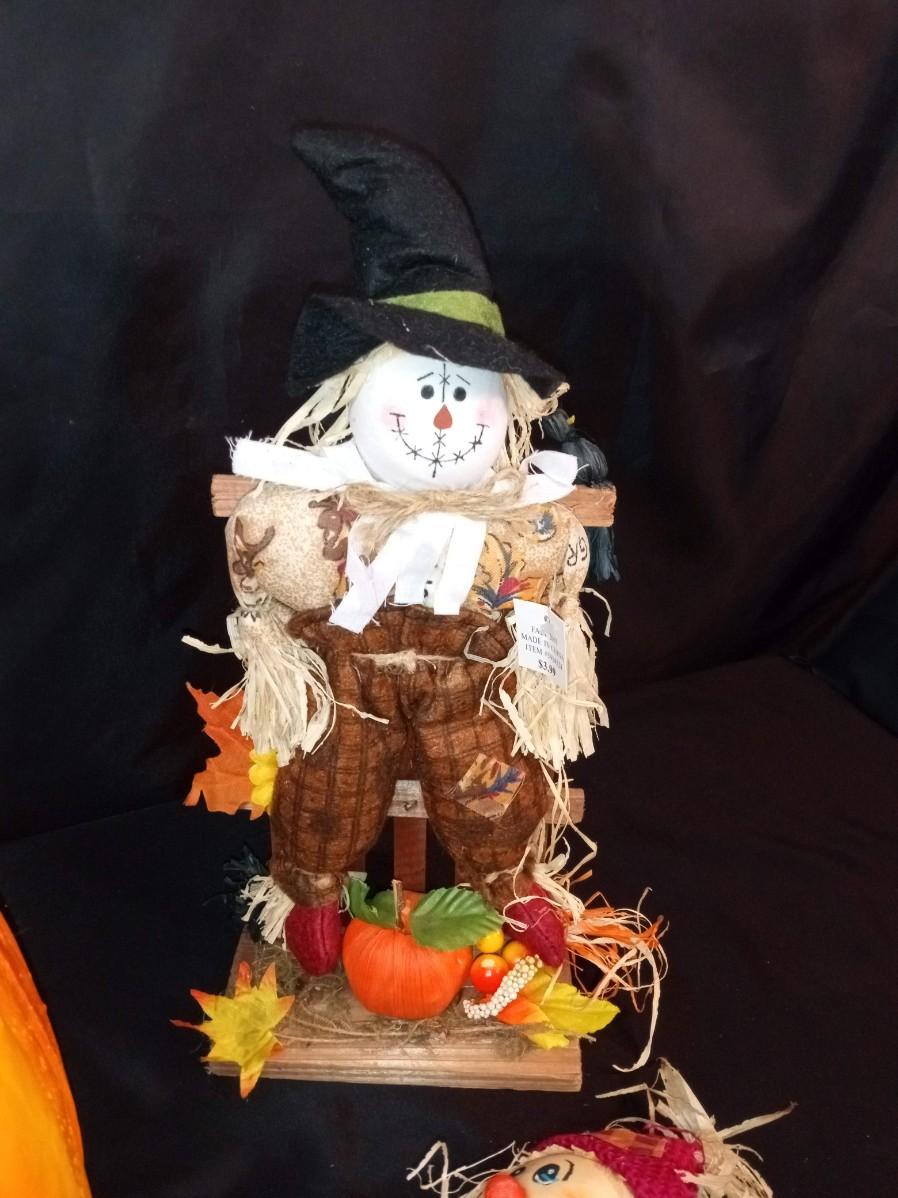 STAKED SCARECROWS AND LIGHTED PUMPKIN