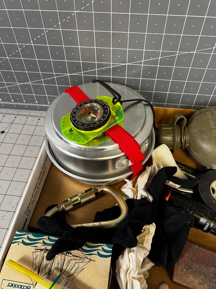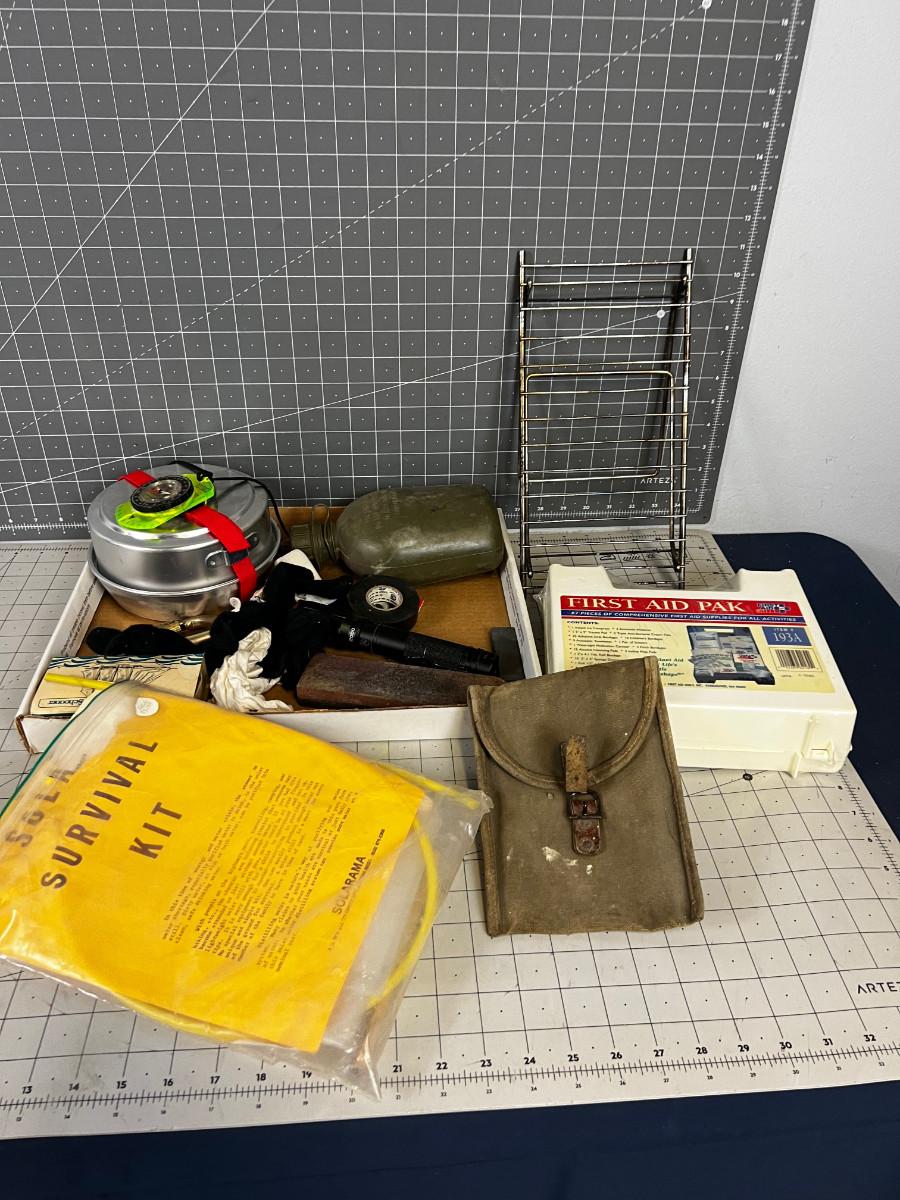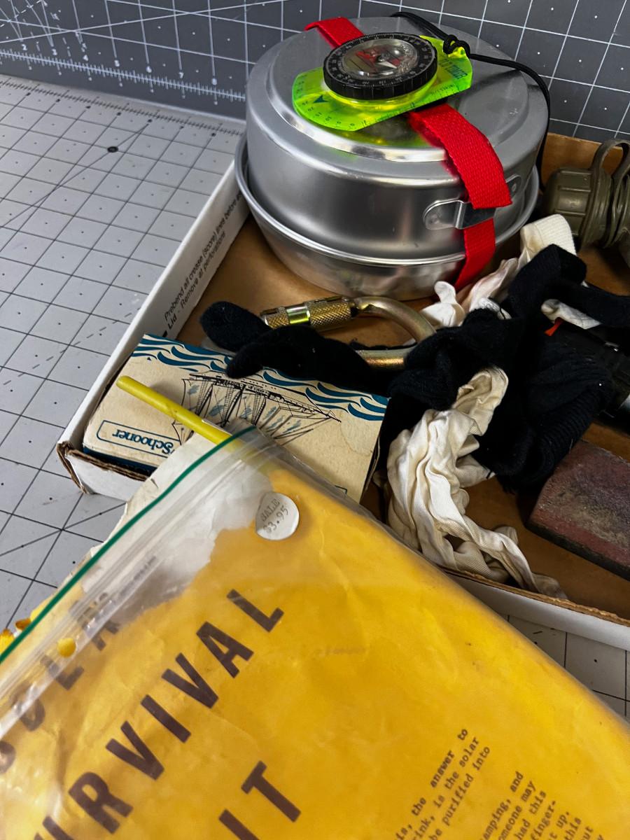 Tray of Survival Emergency Stuff: Matches, Compass, Mess Kit First Aid Kit.