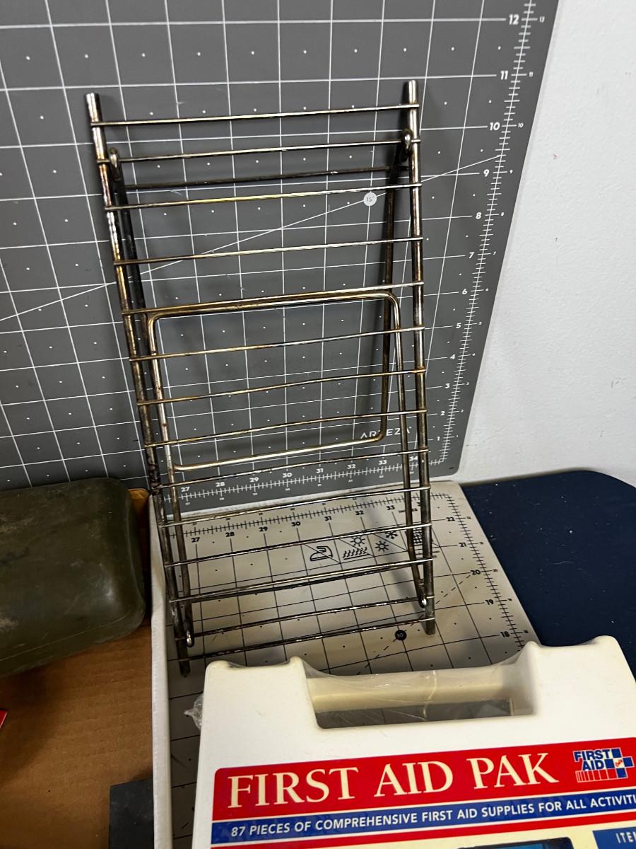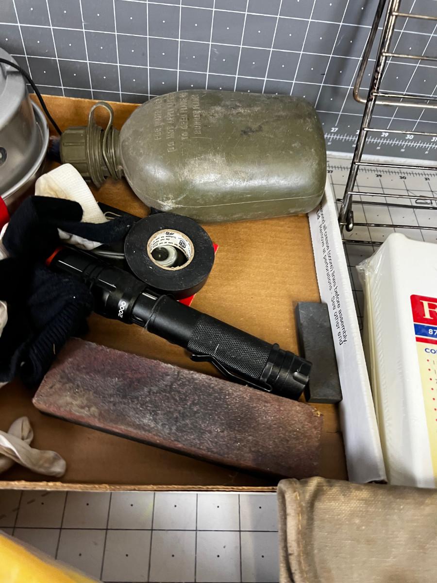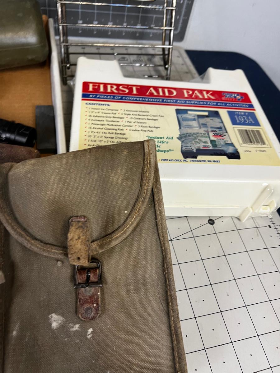 Tray of Survival Emergency Stuff: Matches, Compass, Mess Kit First Aid Kit.