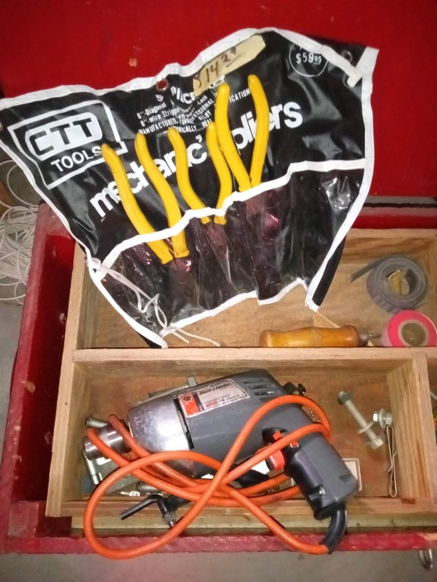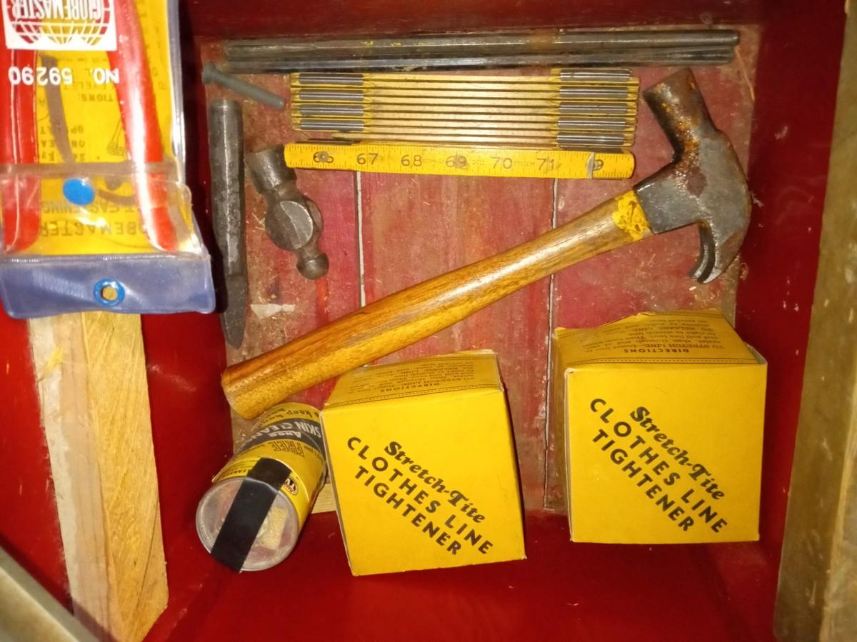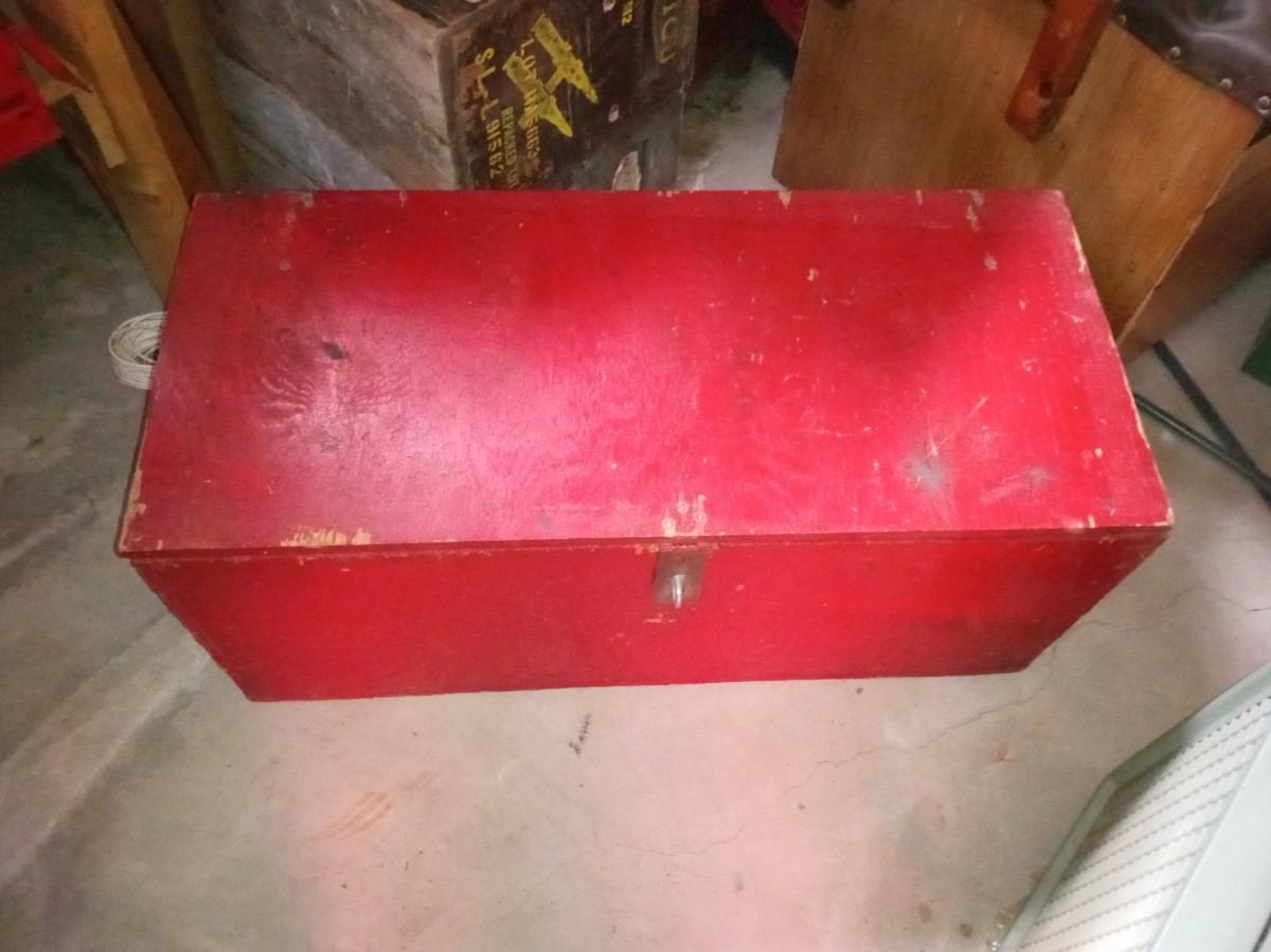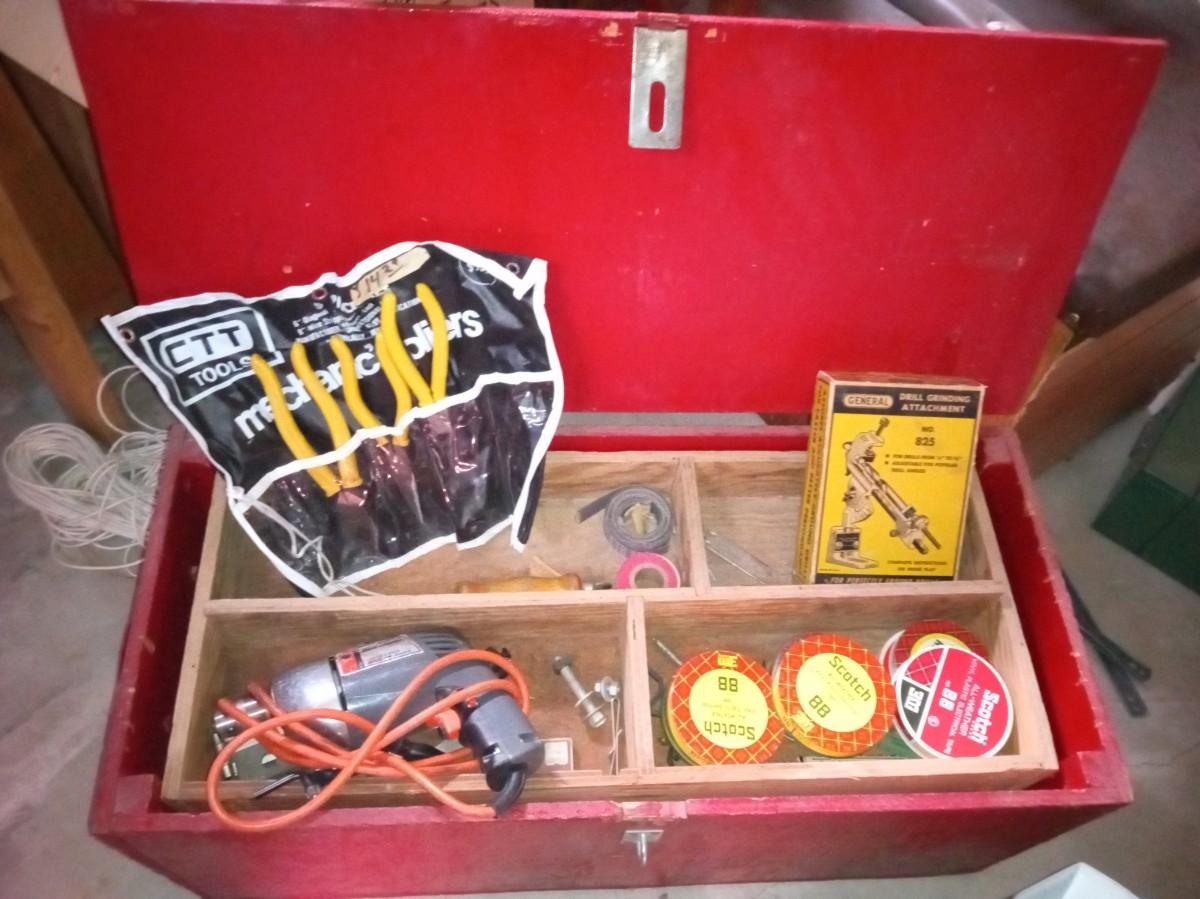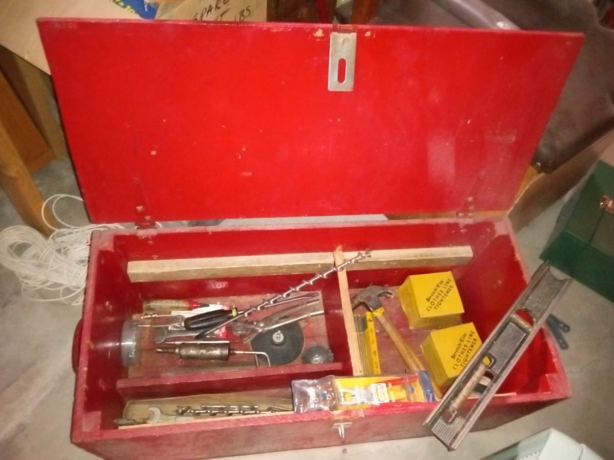 WOOD TOOL BOX WITH A SHELF AND RANDOM ITEM
