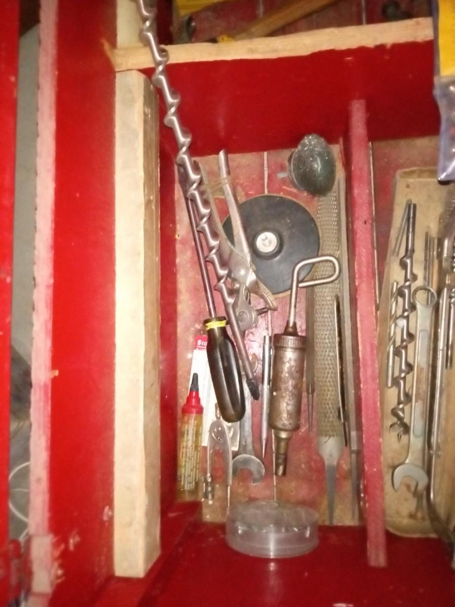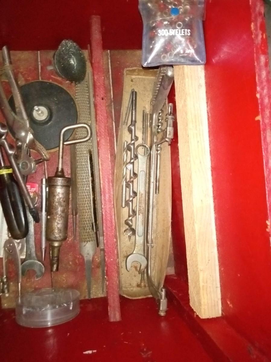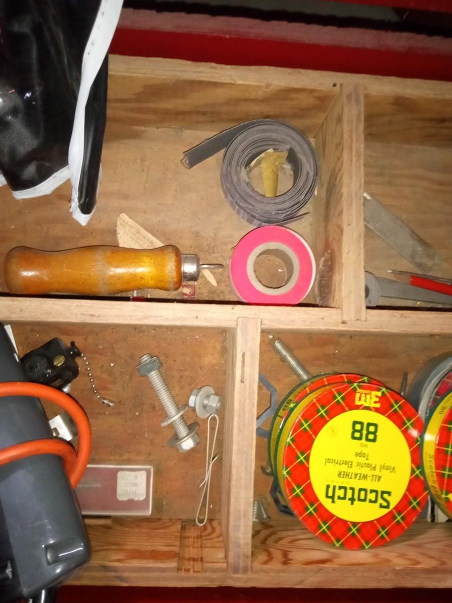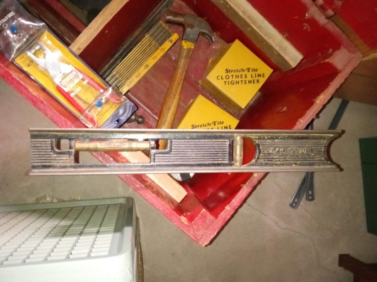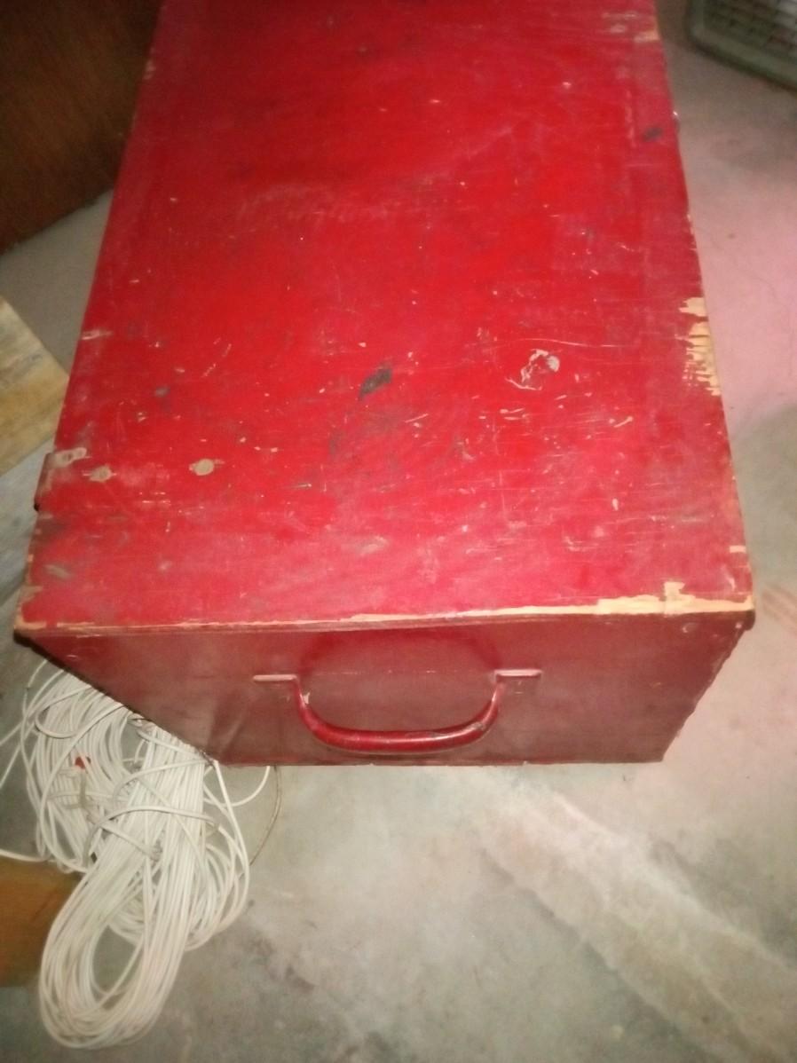 WOOD TOOL BOX WITH A SHELF AND RANDOM ITEM